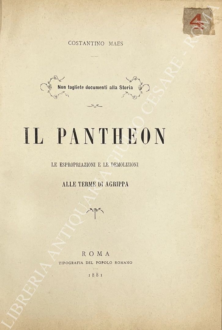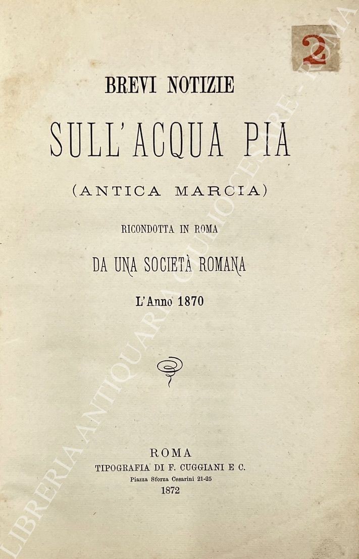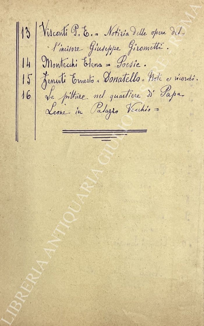Crostarosa F. - I pellegrini in Roma nei passati giubilei. UNITO A: Brevi notizie sull'Acqua Pia (antica Marcia) ricondotta in Roma da una societĂ romana l'anno 1870. UNITO A: Maes Costantino - Le Terme di Agrippa. Prime note archeologiche intorno ai recenti scavi. Il Pantheon ripristinato a mausoleo dei re d'Italia. UNITO A: Il Pantheon. Le espropriazioni e le demolizioni alle Terme di Agrippa. UNITO A: Delle antiche carceri di Firenze denominate le stinche or demolite e degli edifizj in quel luogo eretti l'anno 1834. UNITO A: Capannari Alessandro - Cenni biografici pubblicati a cura degli amici nell'anniversario della sua morte. UNITO A: A.B.R. - Discurso de padron Lisandro de la regola fatto a la gensola (I) co Peppe er duro, Cremente spacca, e Filicetto pe soprannome trecciabella sull'aritrovato der cirusico romano Sor Angelo Comi. UNITO A: Epigrammi. UNITO A: La tenera Clelia Novella. UNITO A: Ciampi Ignazio - La tragedia di Fazio Armajuolo - UNITO A: Novati Francesco - Dante da Maiano ed Adolfo Borgognoni. UNITO A: La chiesa parrocchiale di Santa Maria in Monticelli e i suoi ristauri. UNITO A: Visconti P.E. - Notizia delle opere dell'incisore in pietre dure ed in coni Cav. Giuseppe Girometti. UNITO A: Montecchi Elena - Poesie. UNITO A: Zenuti Ernesto - Donatello. Note e ricordi. UNITO A: Le pitture del quartiere di Papa Leone in Palazzo Vecchio