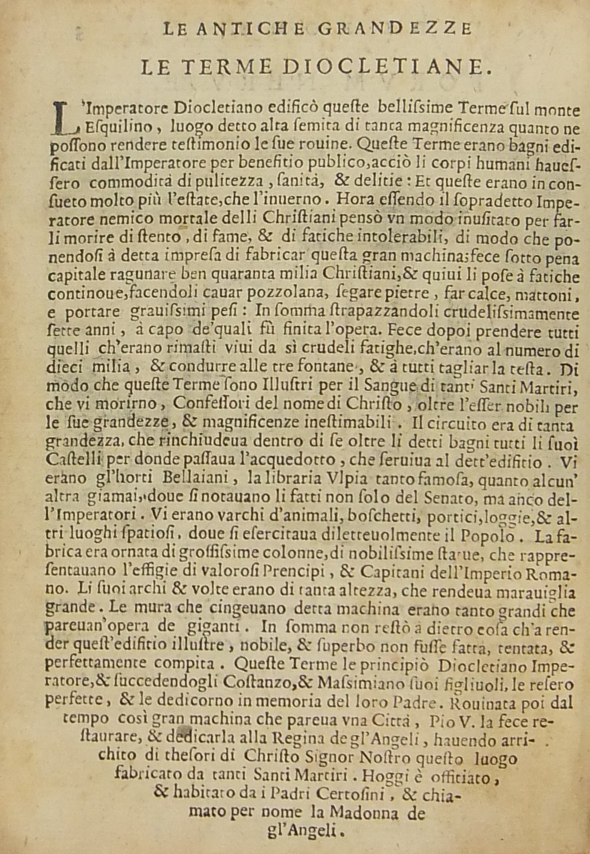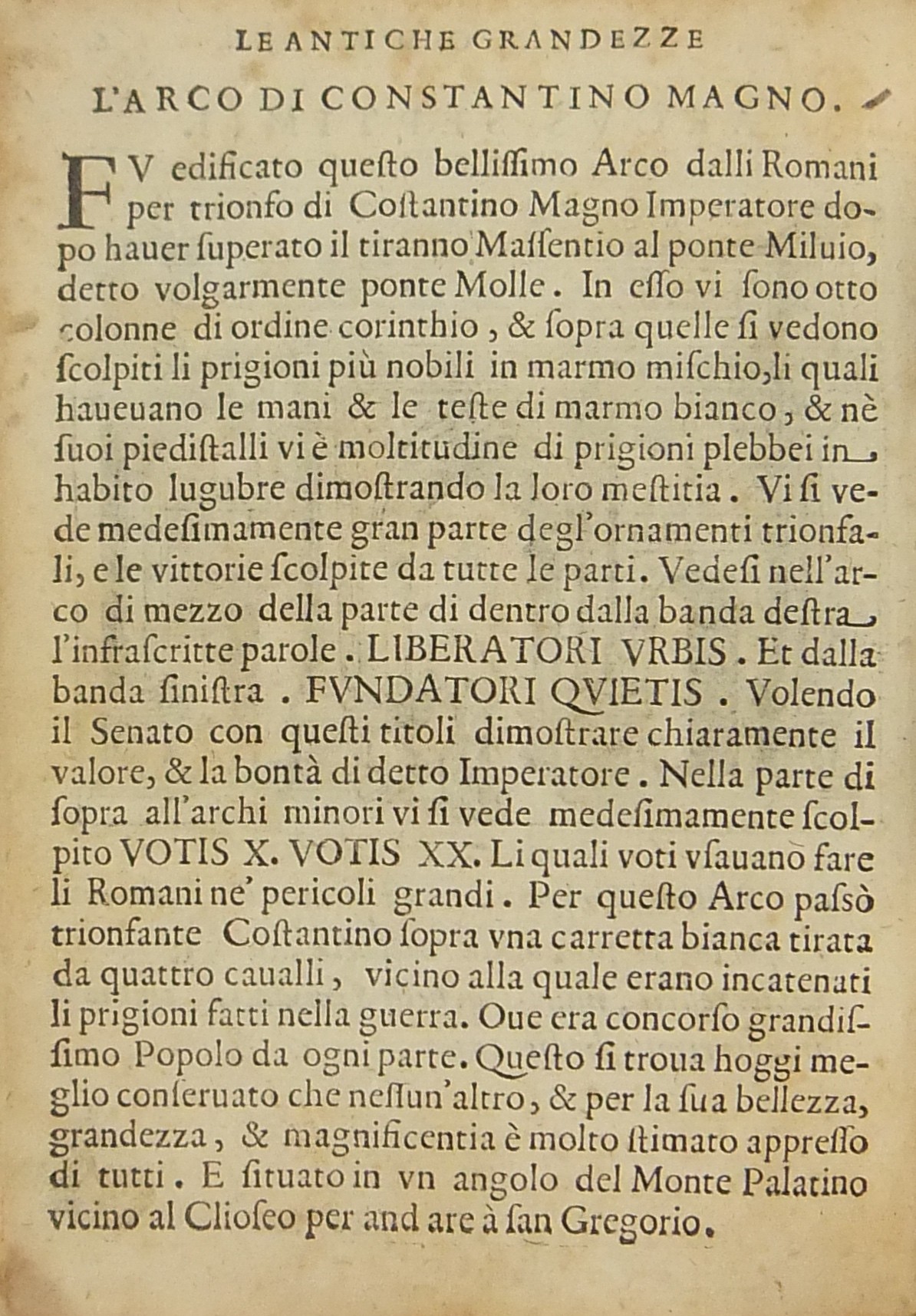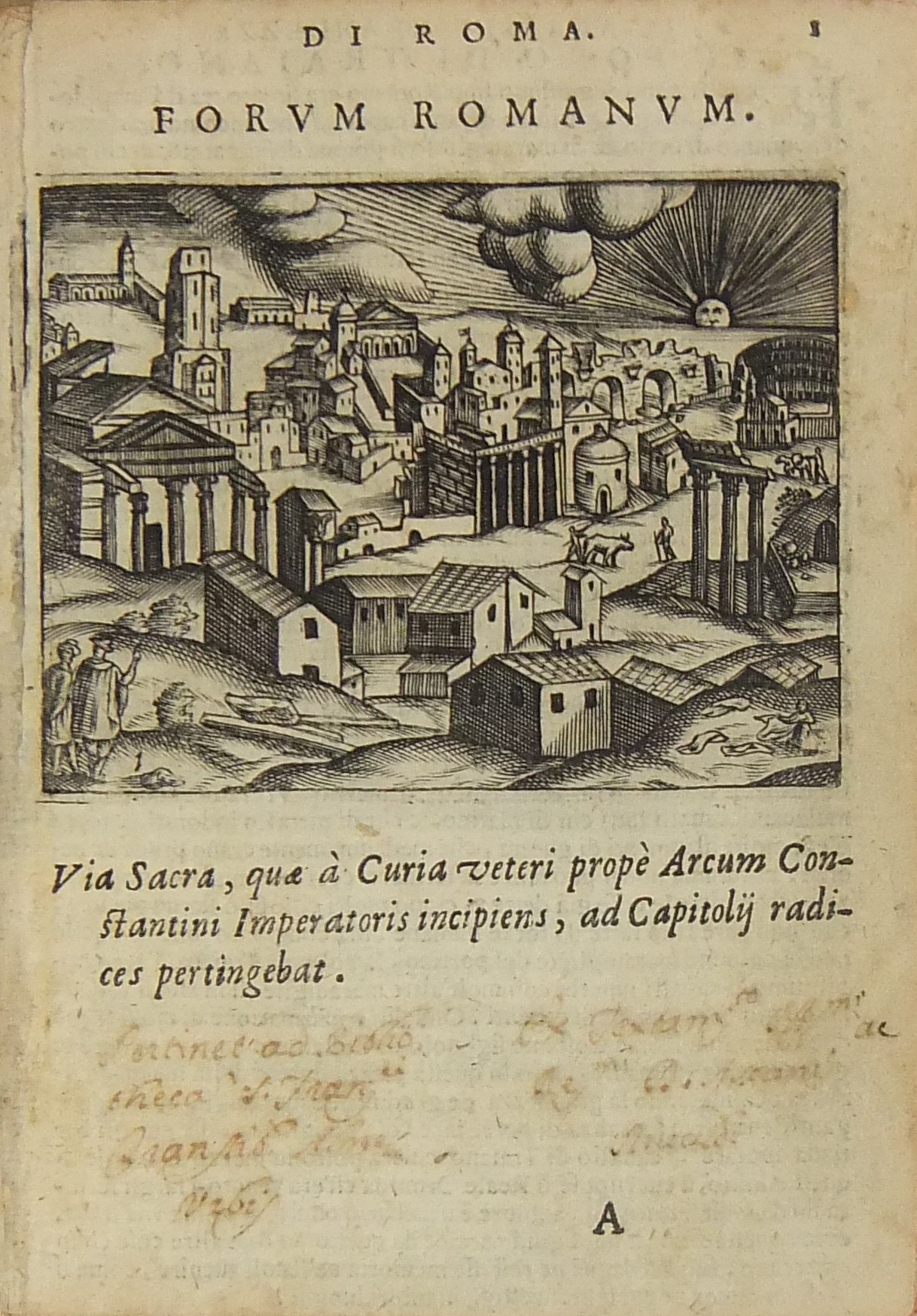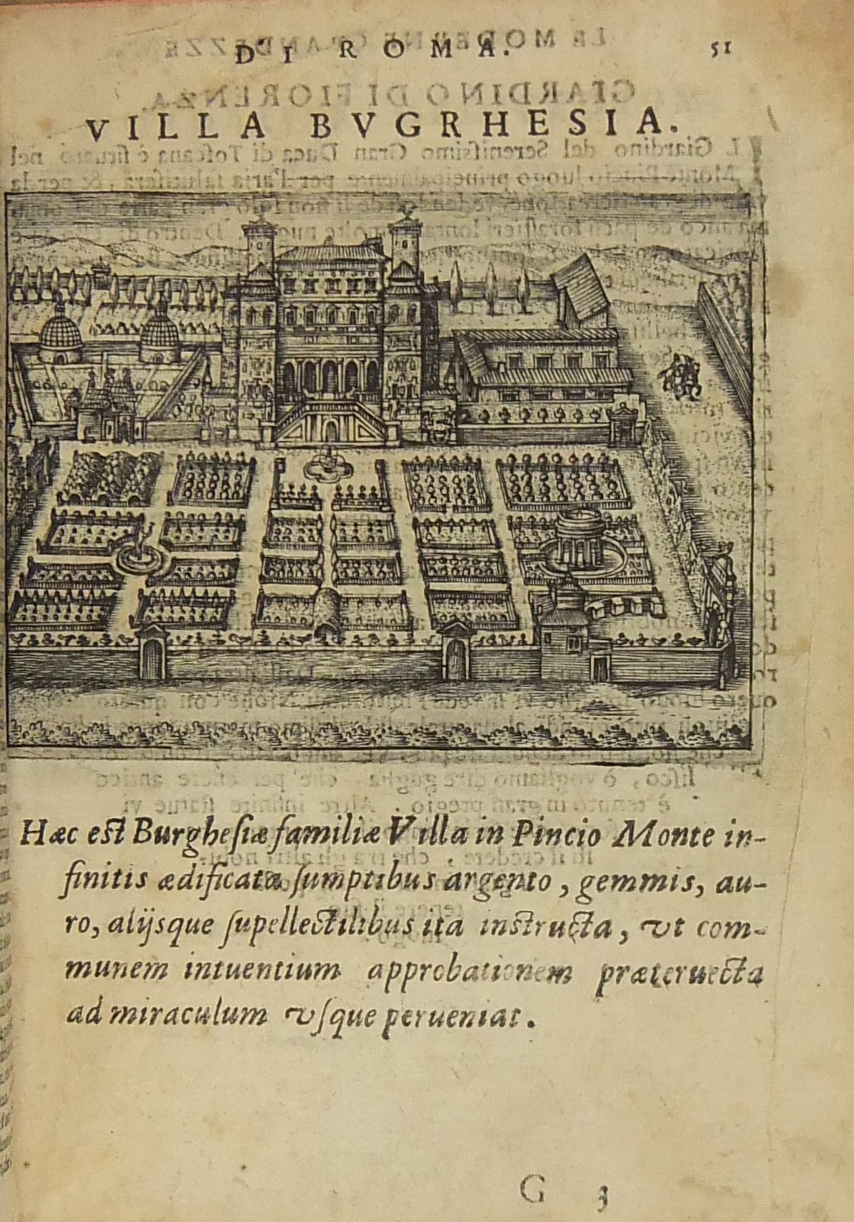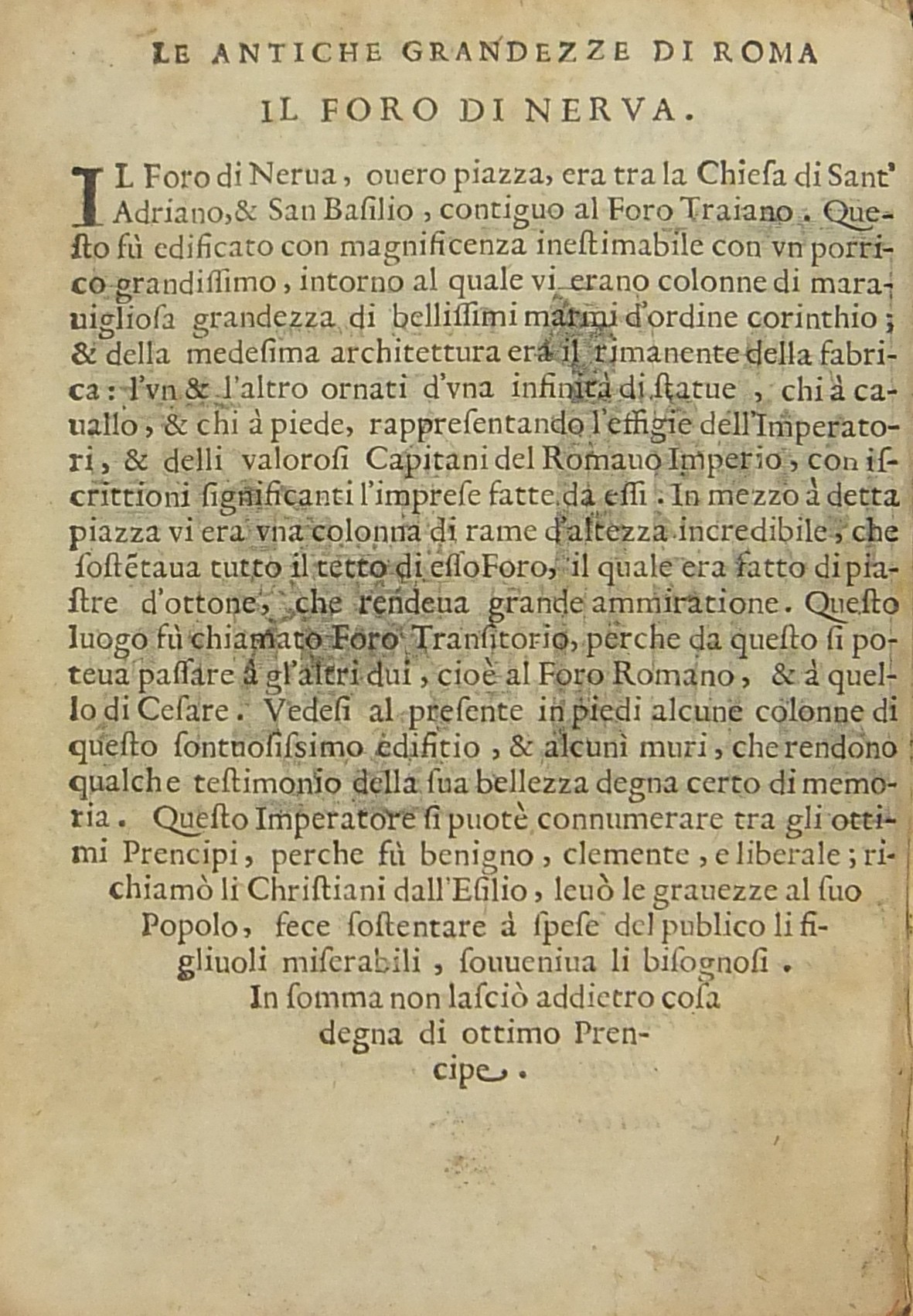 Testi e incisioni relativi a: Foro Romano, Foro di Traiano, Foro di Nerva, Terme di Diocleziano, Terme di Caracalla, Arco di Settimio Severo, Arco di Costantino, Porta Maggiore, Arco di Tito e Vespasiano, Arco di San Giorgio, Arco di Domiziano, Colosseo, Anfiteatro di Statilio Tauro, Teatro di Marcello, Pantheon, Tempio in Pace, Tempio della Concordia, Tempio di Giano, Basilica di Antonino Pio, Tempio della Fortuna, Tempio di Antonino e Faustina, Tempio di Giove Statore, Tempio del Sole, Castel S. Angelo, Sepolcro di Cecilia Metella, Piramide Cestia, Campidoglio, Circo di Massenzio, Trofei di Mario, Palazzo Maggiore, Isola Tiberina, Colonna Traiana, Colonna di Antonino Pio, Obelisco di San Pietro, Obelisco Lateranense, Obelisco Esquilino, Obelisco di Santa Maria del Popolo, Obelisco di San Mauto, Obelisco nel Giardino de’ Medici, Obelisco Mattei (di Villa Celimontana), Colonna di Santa Maria Maggiore, Facciata della Basilica di San Pietro in Vaticano, Scala Santa, Palazzo Pontificio di San Pietro, Quirinale, Collegio Romano, Sapienza, Palazzo della Cancelleria, Palazzo Farnese, Palazzo Borghese, Villa Borghese, Villa Medici, Giardino de’ Mattei, Fontana di S. Pietro al Montorio, Fontana di Terme, Fontana di S. Pietro in Vaticano, Piazza Navona.