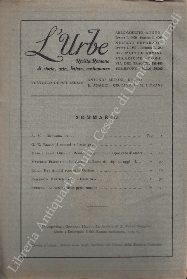 L'Urbe. Rivista romana. Fondata da Antonio Munoz, diretta da Emma Amadei Ceccarius e Mario Lizzani. Anno X - Nuova serie - 1947