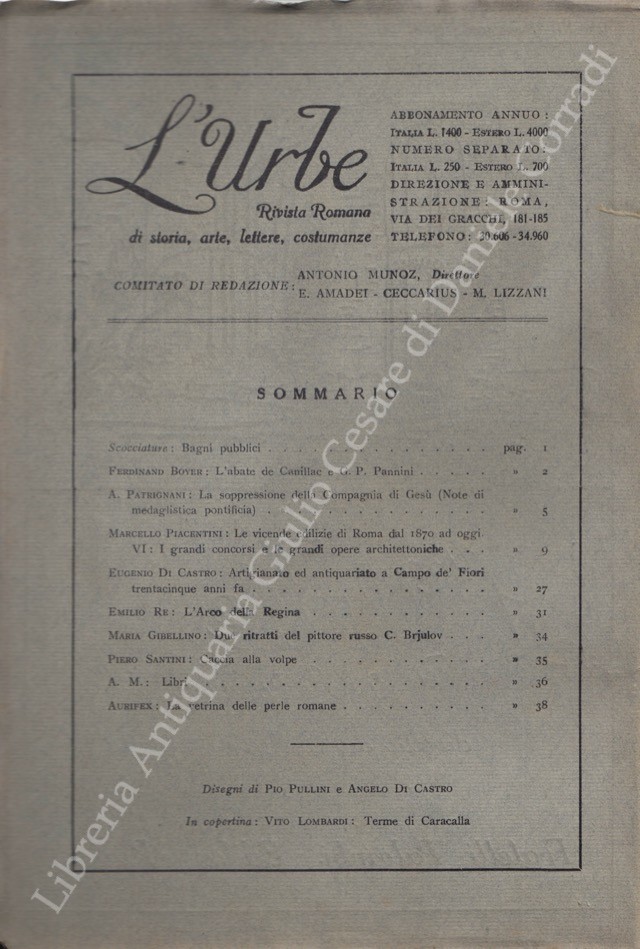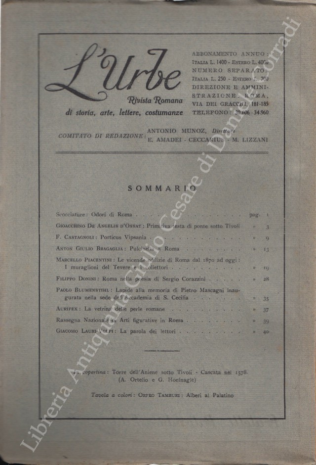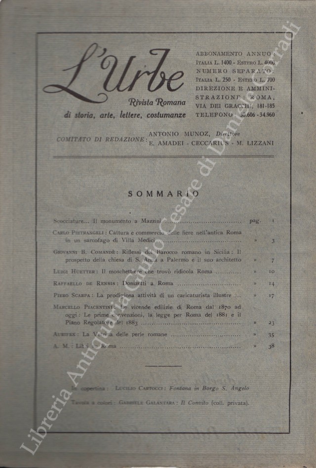 Scritti di: Aurifex, Blumenstihl, Boyer, Bragaglia, Brigante Colonna, Castagnoli, Comandè, De Angeli D'Ossat, De Rensis, Di Castro, Donini, Gibellino, Huetter, Jannattoni, Lauri-Volpi, Lefevre, Lizzani, Lodolini, Munoz, Paluzzi, Patrignani, Piacentini, Pietrangeli, Re, Santini, Scarpa, Segre, Veo