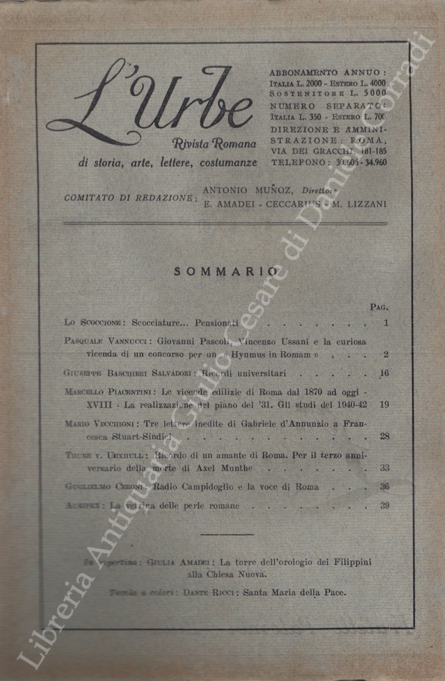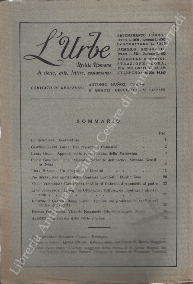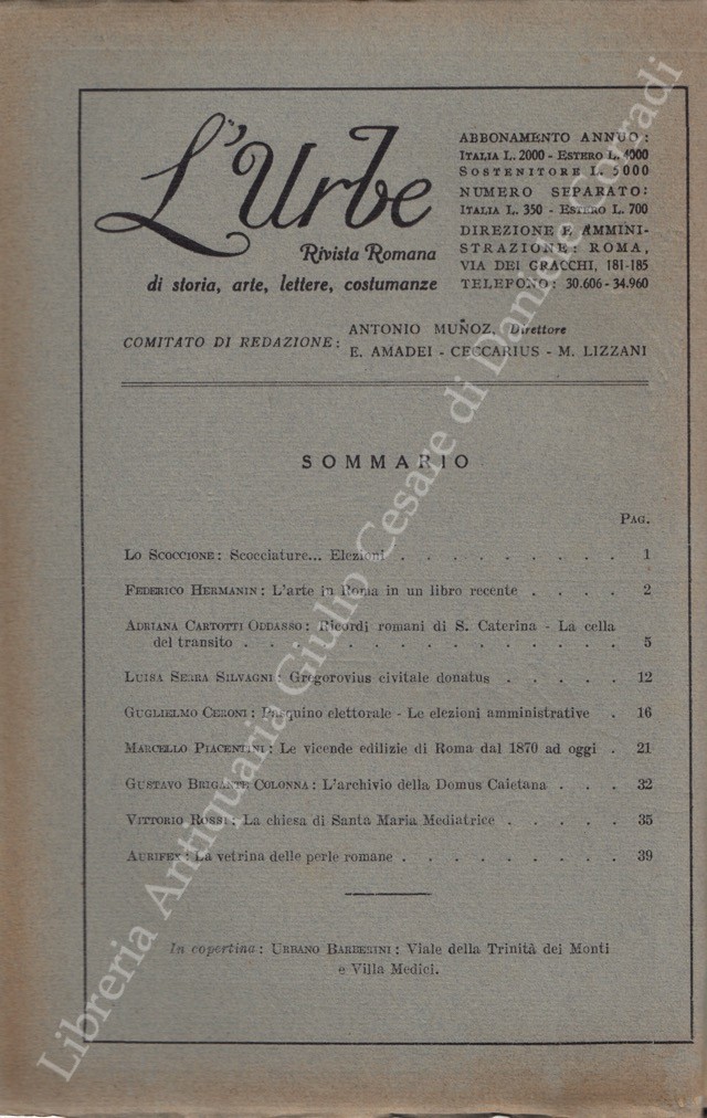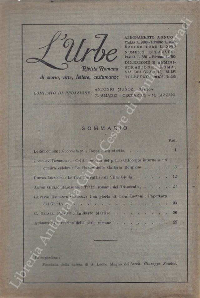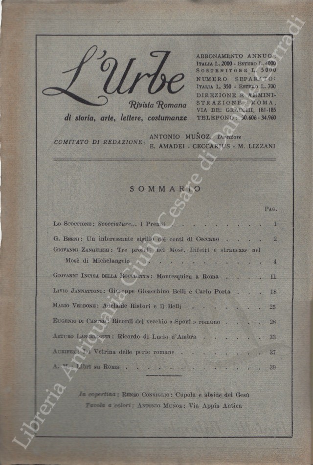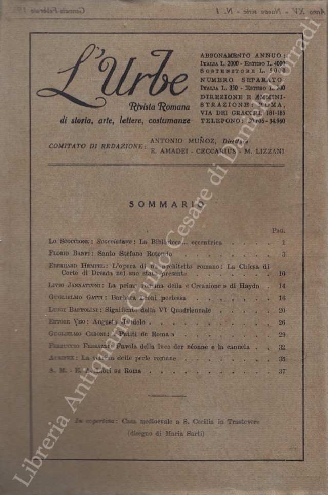 Scritti di: Aurifex, Banfi, Bartolini, Baschieri, Bendinelli, Berni, Bianchi, Bragaglia, Brigante Colonna, Ceroni, Certotti Oddasso, Di Castro, Ferrazzi, Galassi Paluzzi, Gatti, Gigli, Grigioni, Hempel, Hermanin, Incisa della Rocchetta, Jannattoni, Lancellotti, Lauri Volpi, Lojacono, Piacentini, Rossi, Serra Silvagni, Spezi, Uexhull, Vannucci, Vecchioni, Veo, Verdone, Zanghieri
