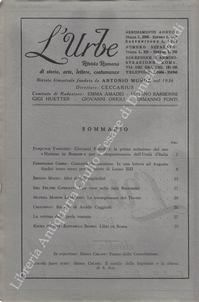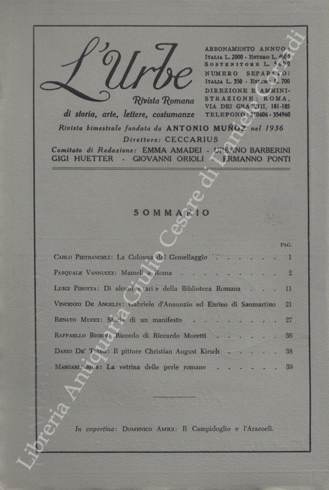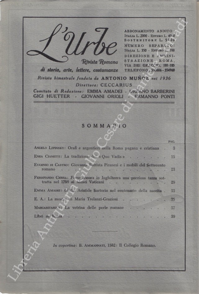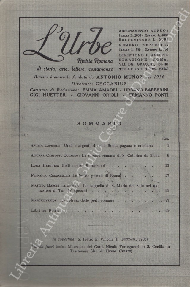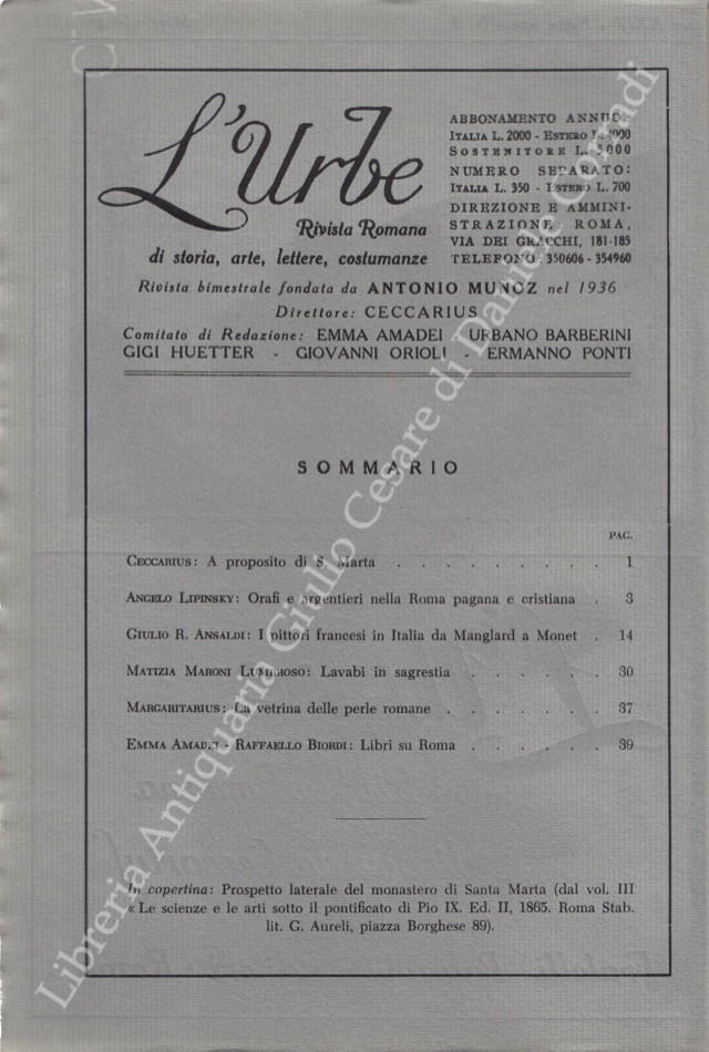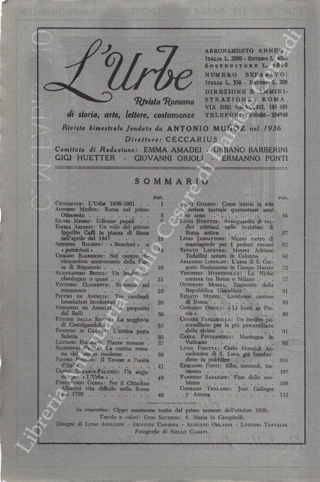 L'Urbe. Rivista romana. Fondata da Antonio Munoz, diretta da Ceccarius, comitato di redazione Emma Amadei, Urbano Barberini, Gigi Huetter, Giovanni Orioli, Ermanno Ponti. Anno XXIV - Nuova serie - 1961