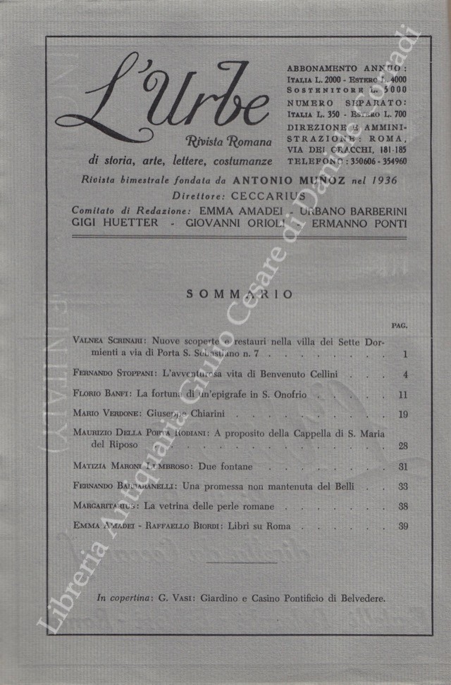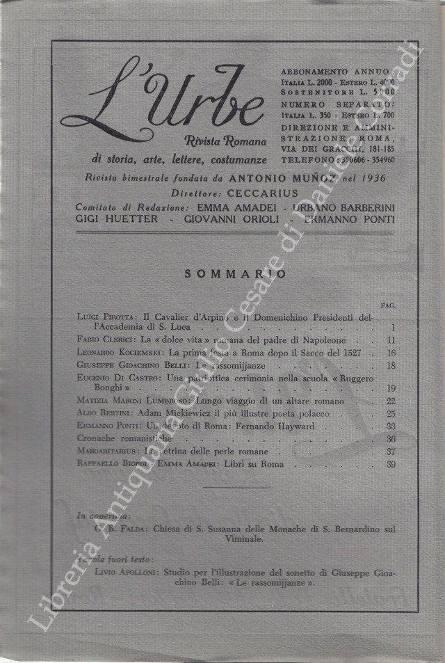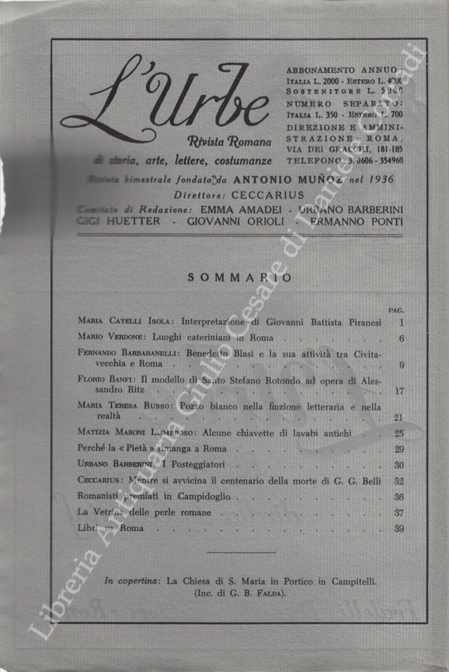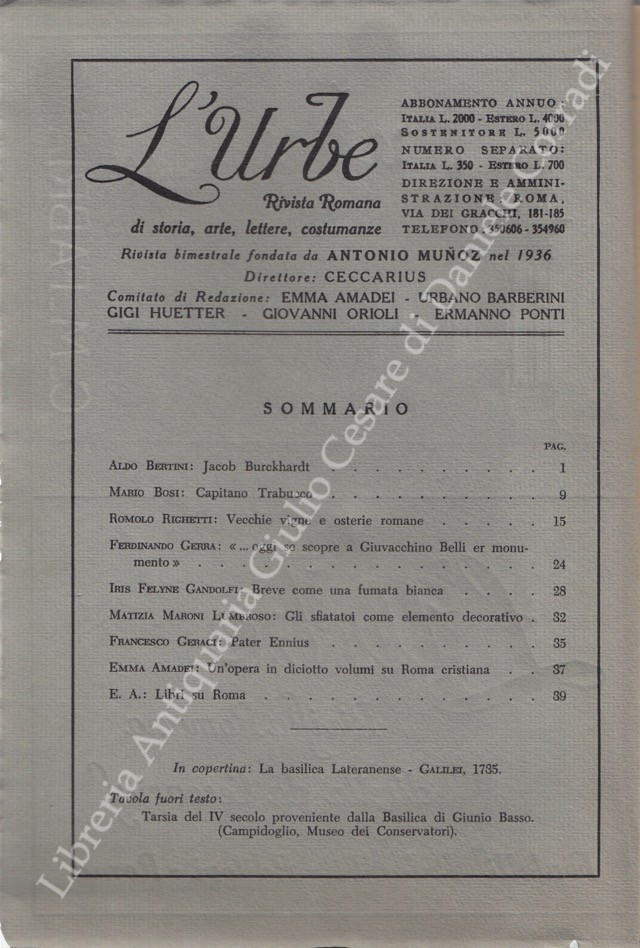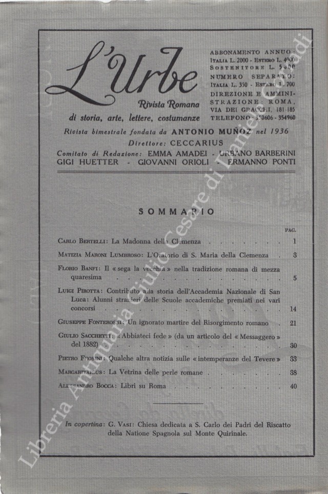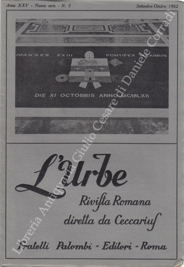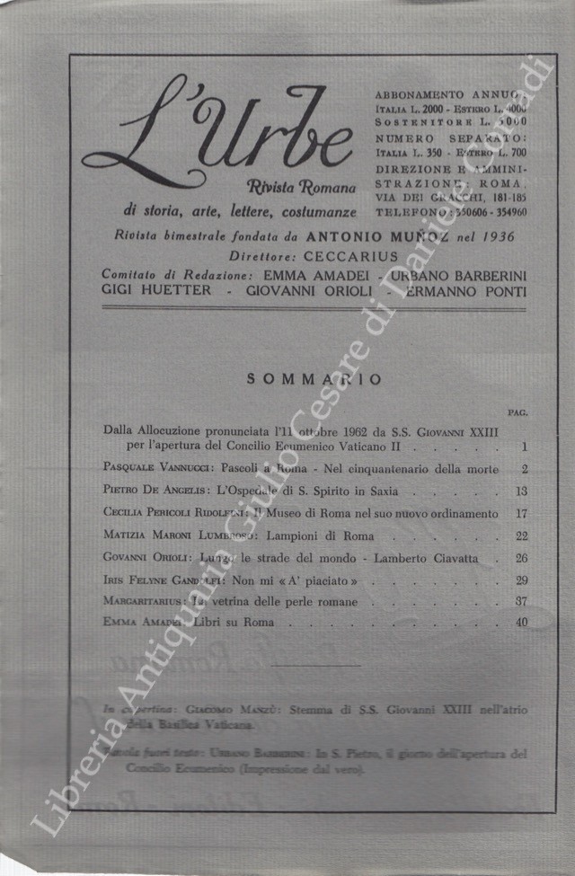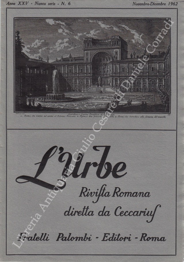 L'Urbe. Rivista romana. Fondata da Antonio Munoz, diretta da Ceccarius, comitato di redazione Emma Amadei, Urbano Barberini, Gigi Huetter, Giovanni Orioli, Ermanno Ponti. Anno XXV - Nuova serie - 1962
