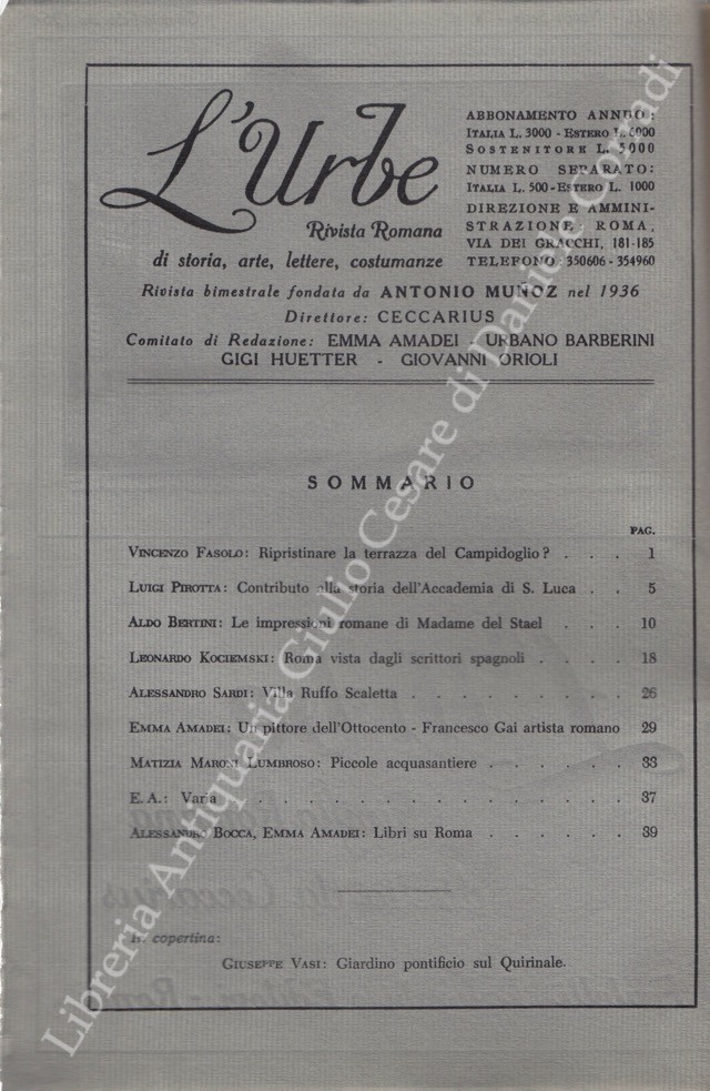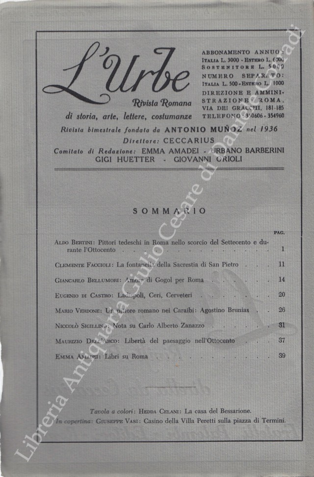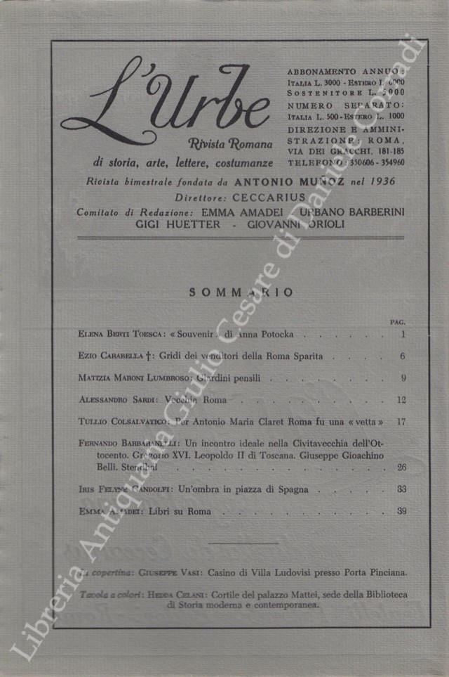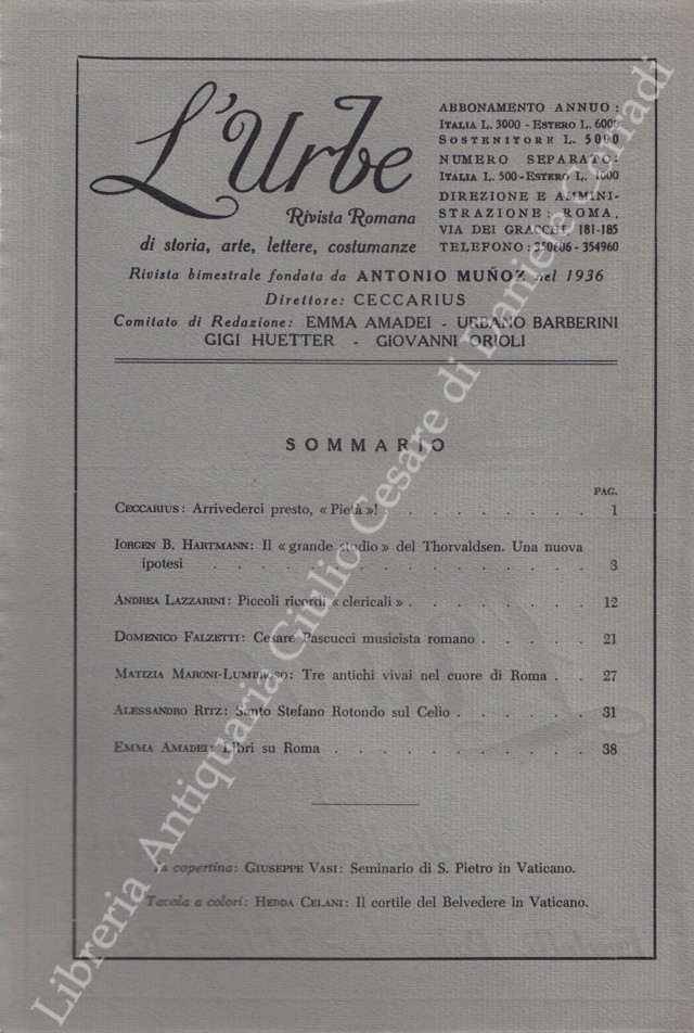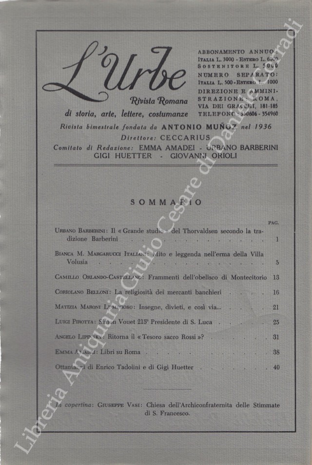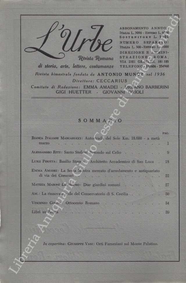L'Urbe. Rivista romana. Fondata da Antonio Munoz, diretta da Ceccarius, comitato di redazione Emma Amadei, Urbano Barberini, Gigi Huetter, Giovanni Orioli, Ermanno Ponti. Anno XXVII - Nuova serie - 1964