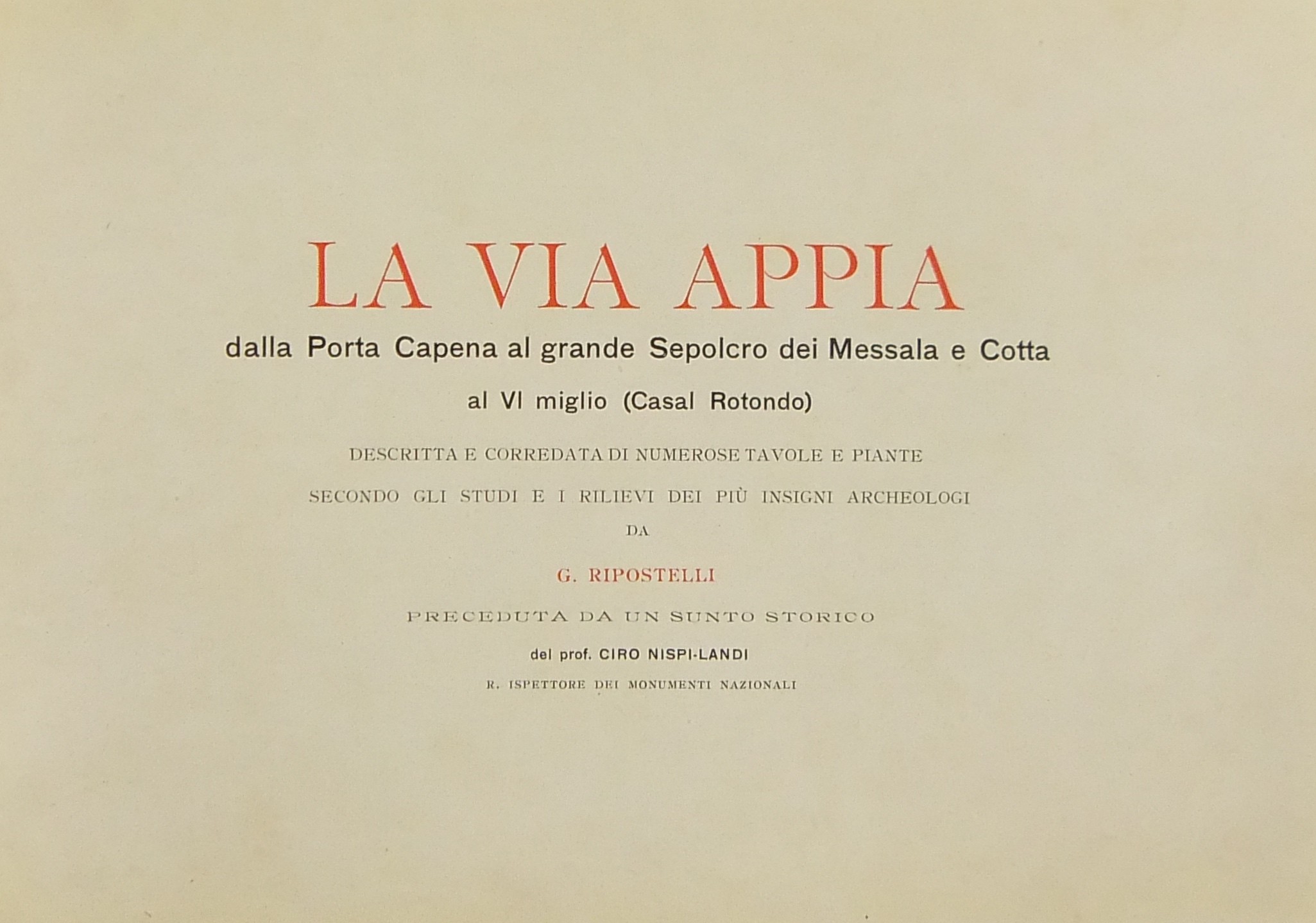 La Via Appia dalla Porta Capena al grande Sepolcro dei Messala e Cotta al VI miglio (Casal Rotondo). Descritta e corredata di numerose tavole e piante secondo gli studi e i rilievi dei più insigni archeologi ..