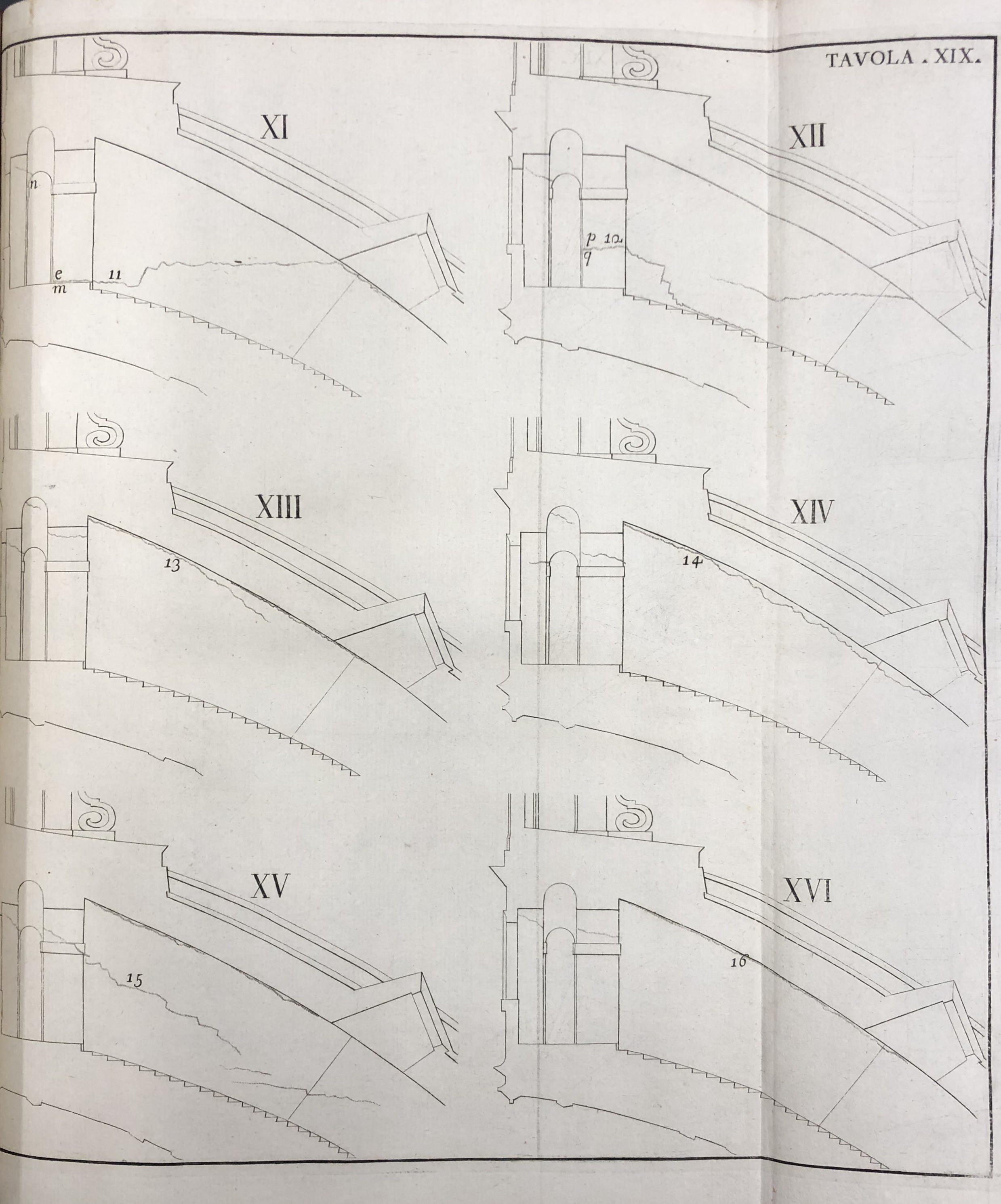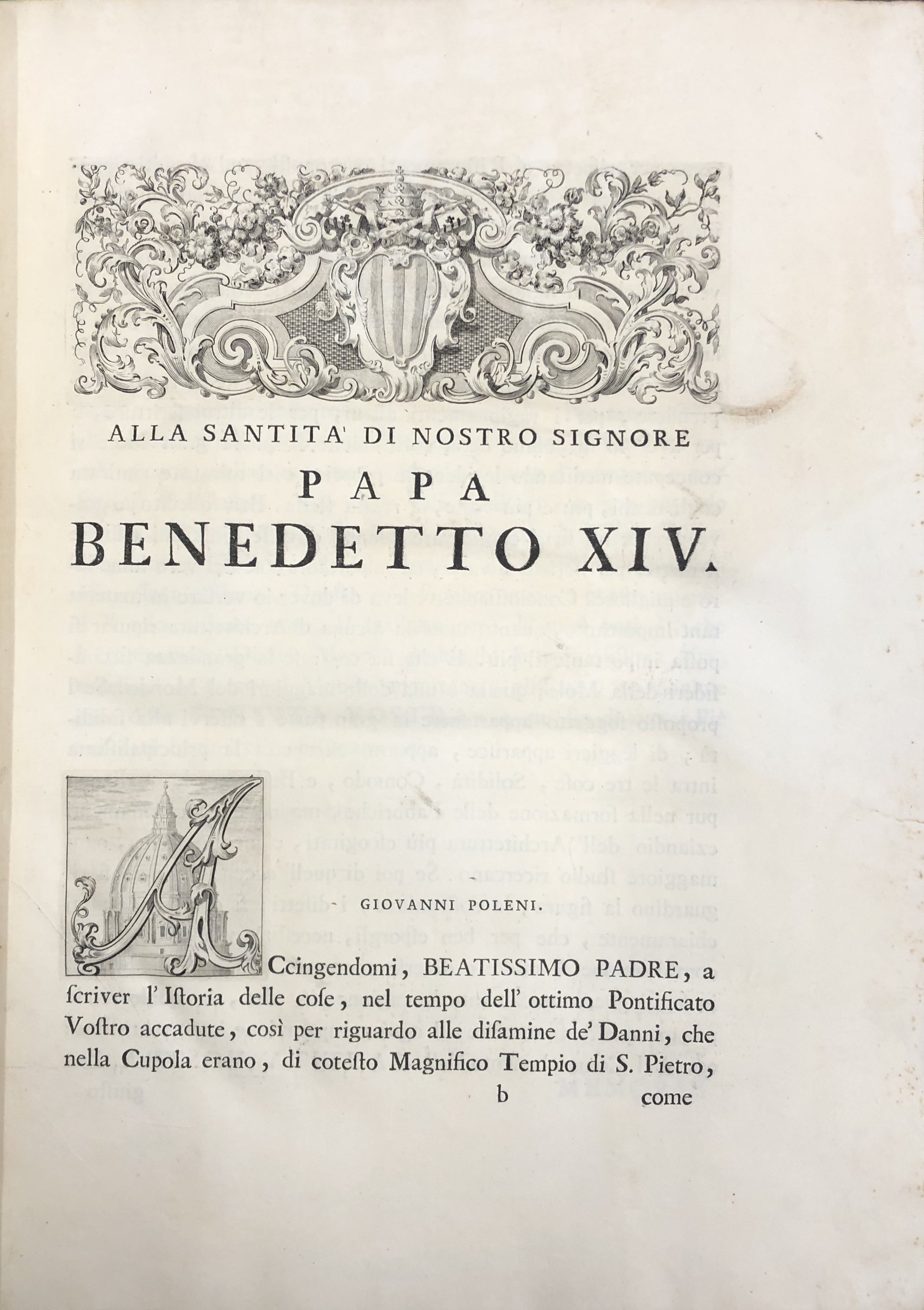 Giovanni Poleni fu convocato a Roma da Papa Benedetto XIV per esaminare la cupola della Basilica di San Pietro che rischiava il crollo. I lavori furono eseguiti tra il 1743 e il 1744 sotto la supervisione dell’Architetto Luigi Vanvitelli. Papa Benedetto XIV commissionò la stampa della presente opera in 700 esemplari
