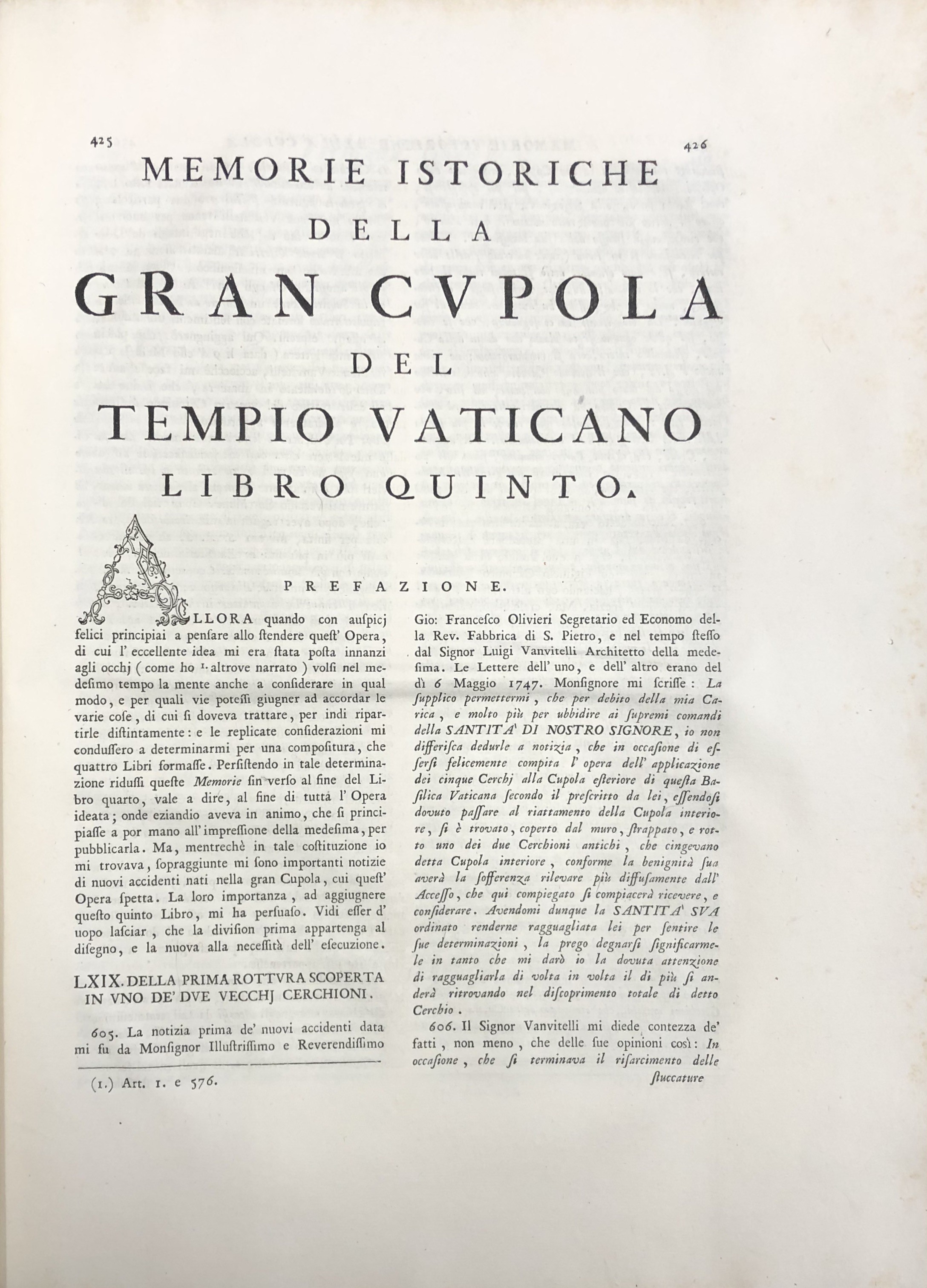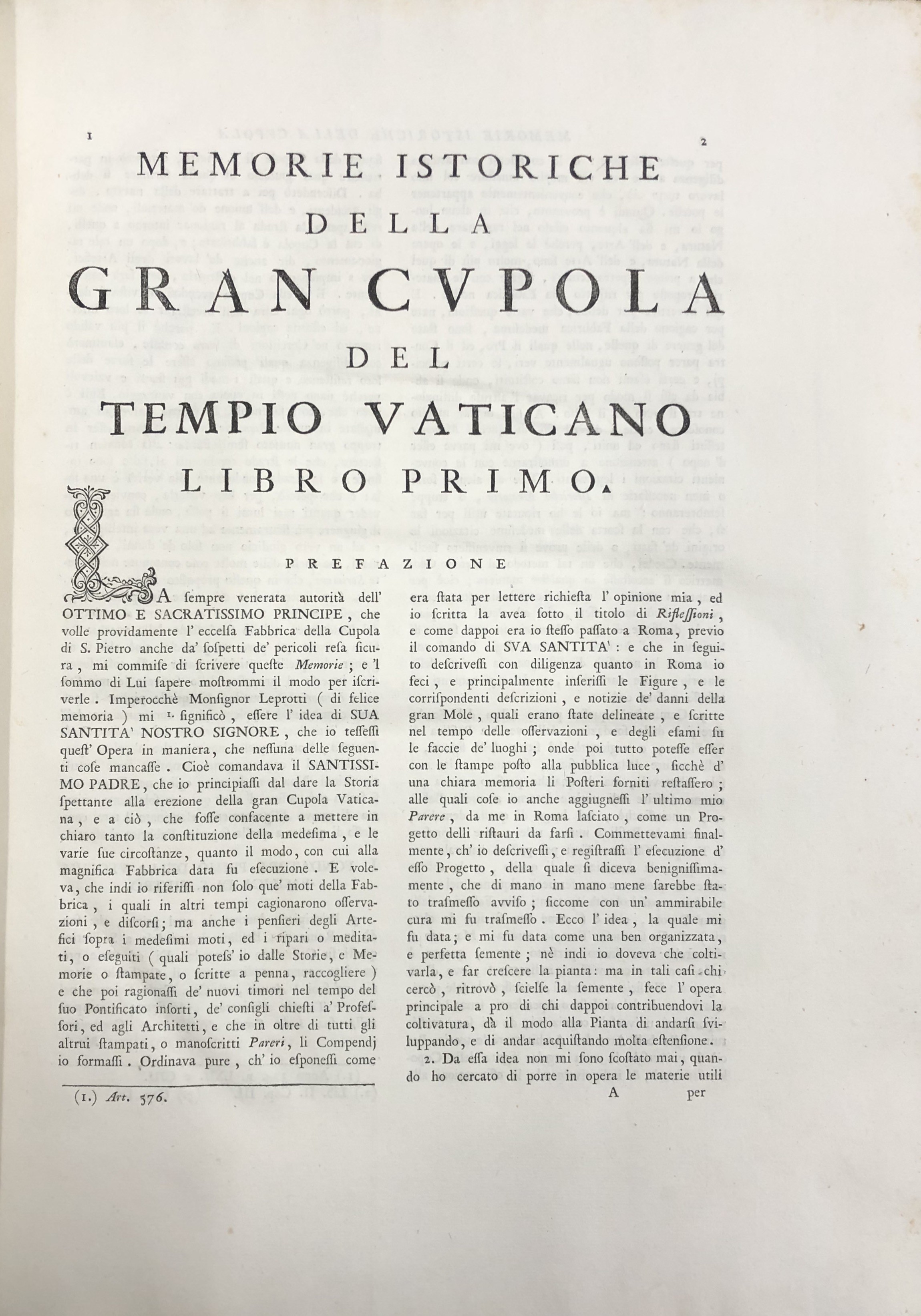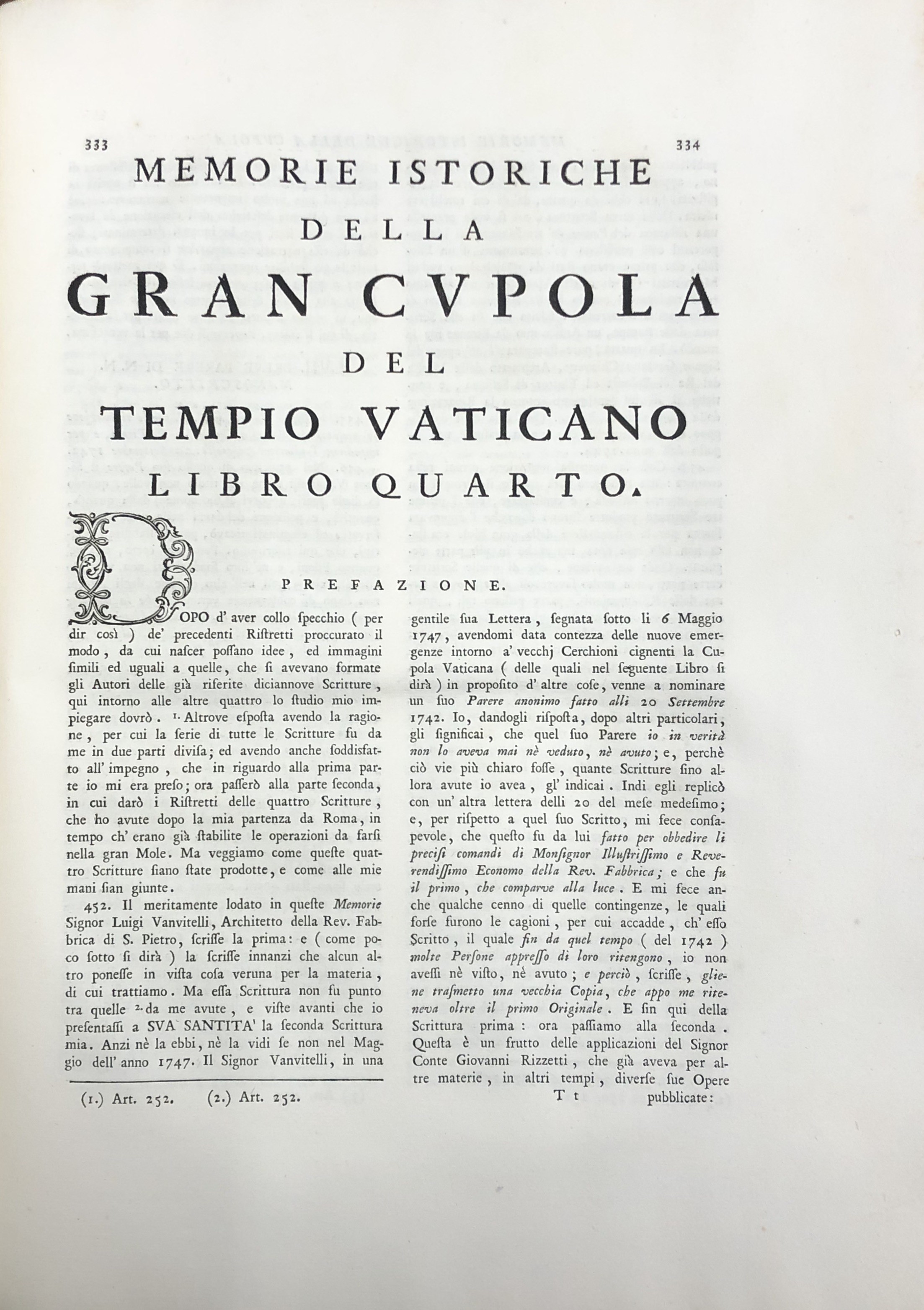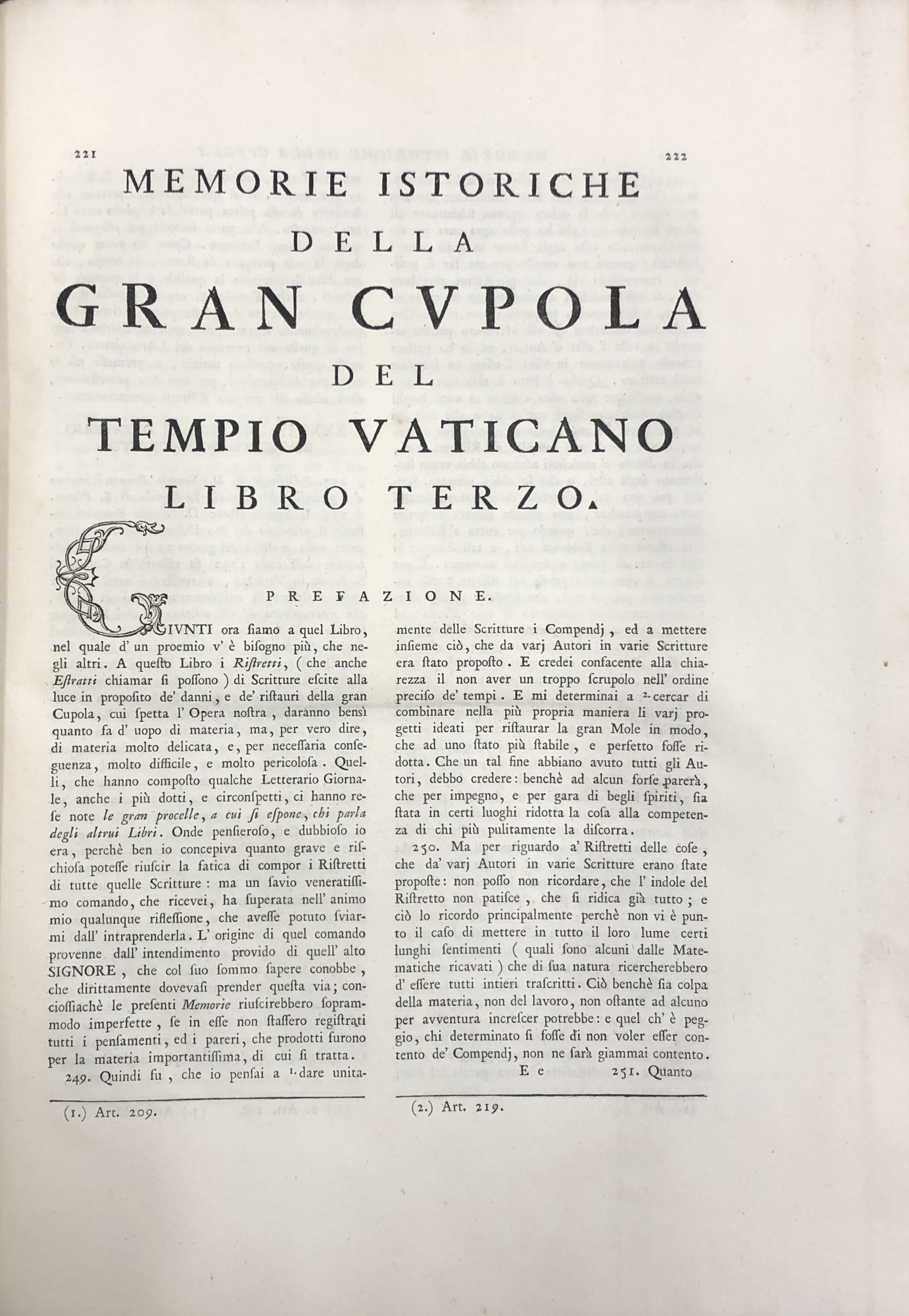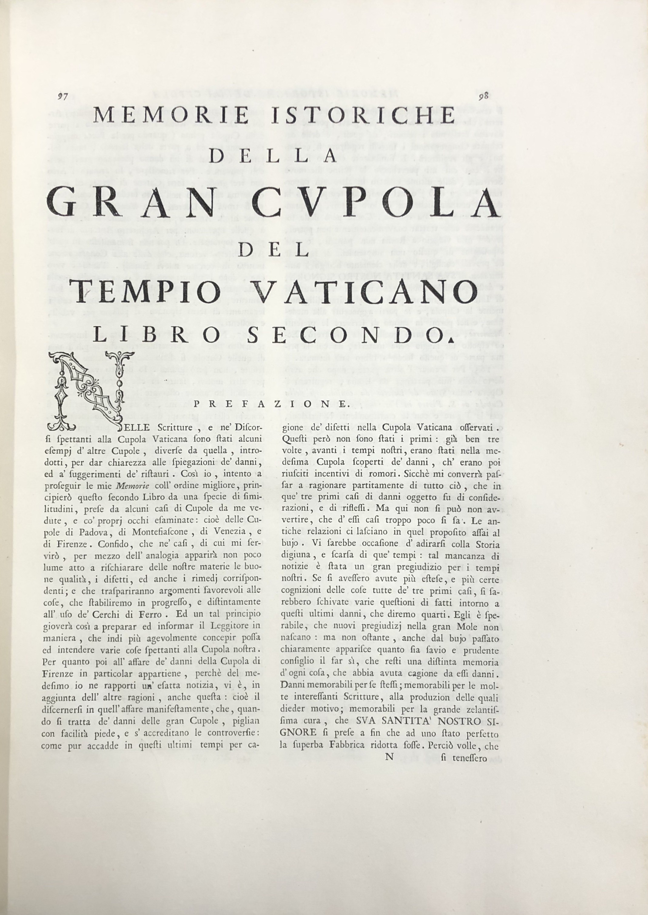 Memorie Istoriche della Gran Cupola del Tempio e de' danni di essa, e de' ristoramenti loro, divise in libri cinque. Alla Santità di Nostro Signore Papa Benedetto XIV