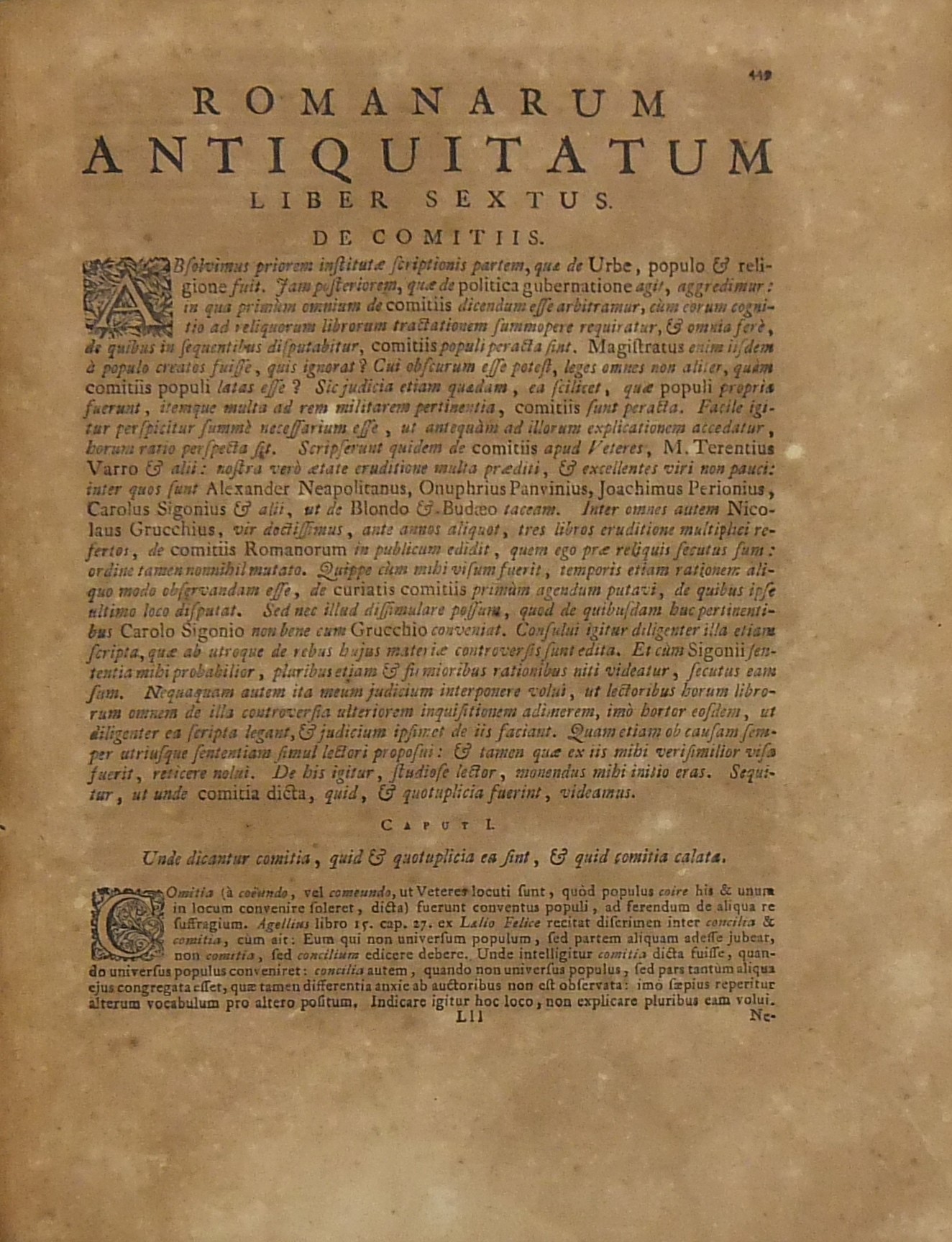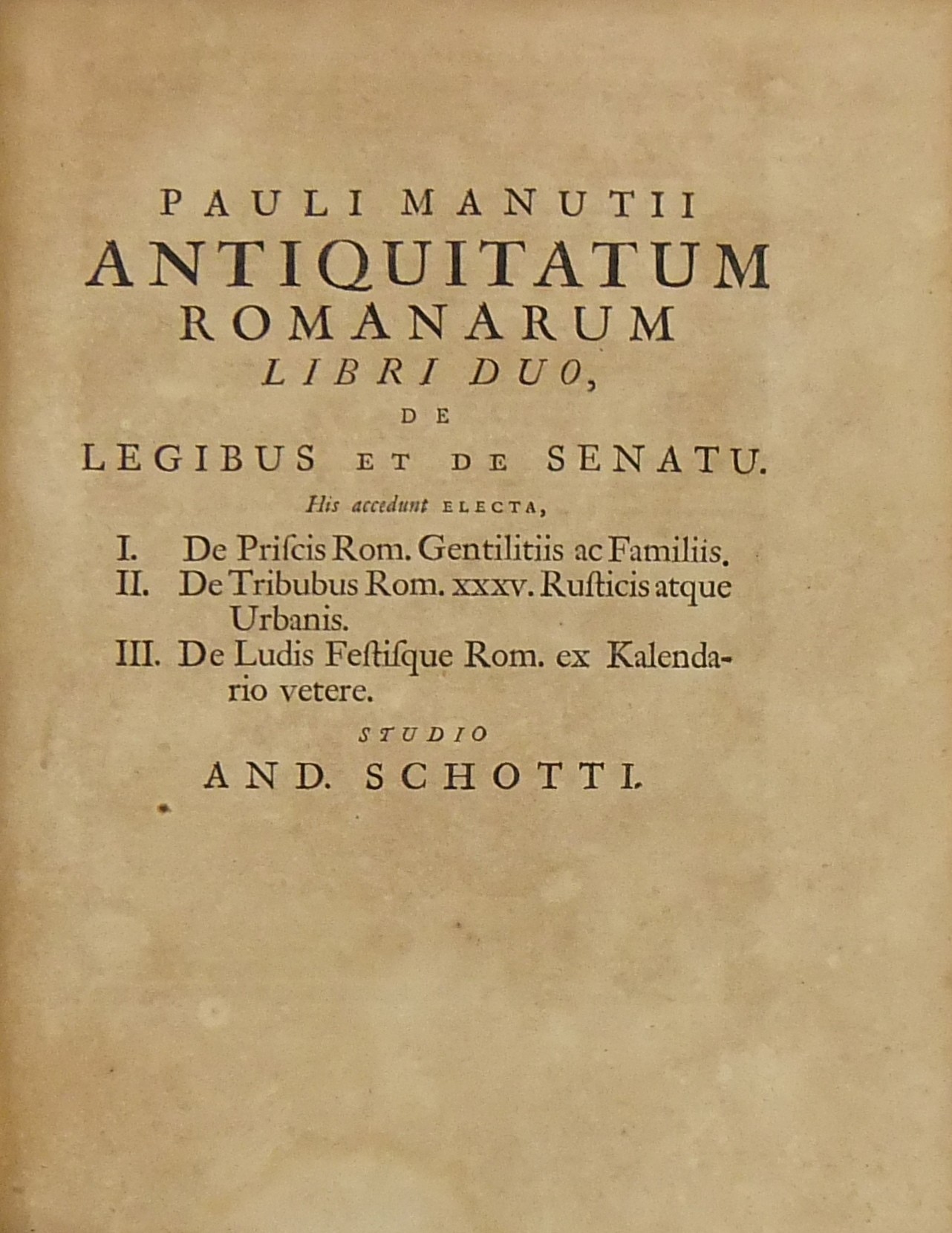 Antiquitatum Romanarum Corpus Absolutissimum, cum Notis Doctissimis ac locupletissimis Thomae Dempsteri J.C. Cui accedunt Pauli Manutii Libri II De Legibus, et de Senatu, cum Andreae Schotti Electis. I - De Priscis Roman. Gentibus ac Familiis. II - De Tribubus Rom. XXXV Rusticis atque Urbanis. III - De Ludis Festisque Rom. Ex Kalendario vetere