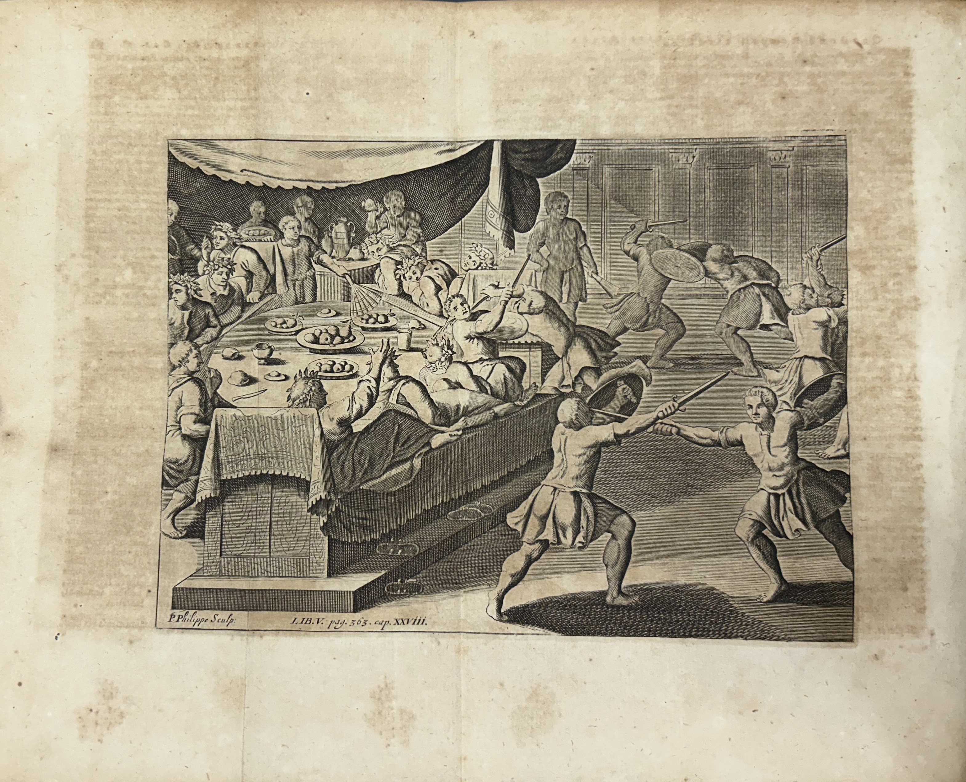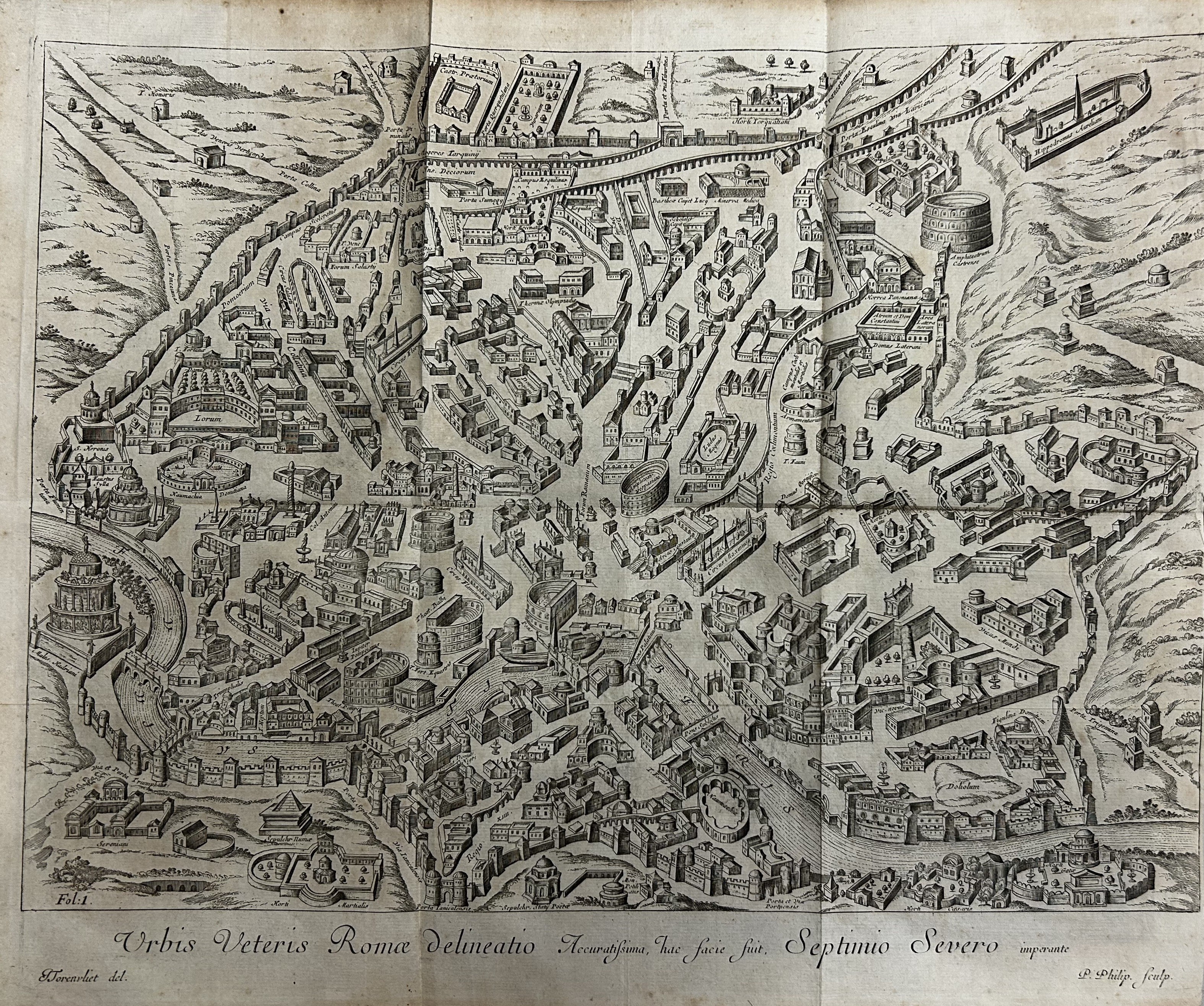 Bella antiporta calcografica con veduta di Roma e in primo piano personificazioni del Tevere e della Lupa capitolina. Frontespizio a caratteri neri e rossi, finalini e capilettera ornati. Impreziosiscono l’opera 8 tavole calcografiche tra le quali due doppie ripiegate con scene di vita romana e una tripla ripiegata con la pianta della città di Roma ai tempi di Settimio Severo con veduta a volo d’uccello