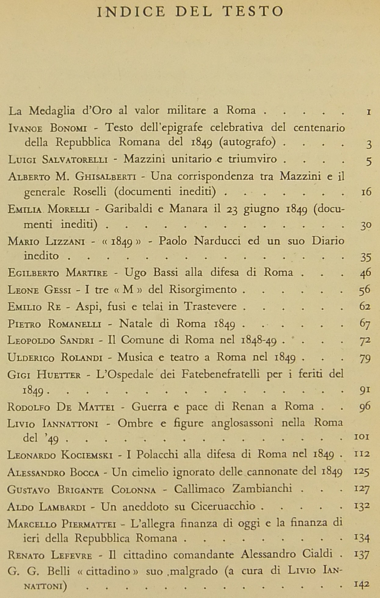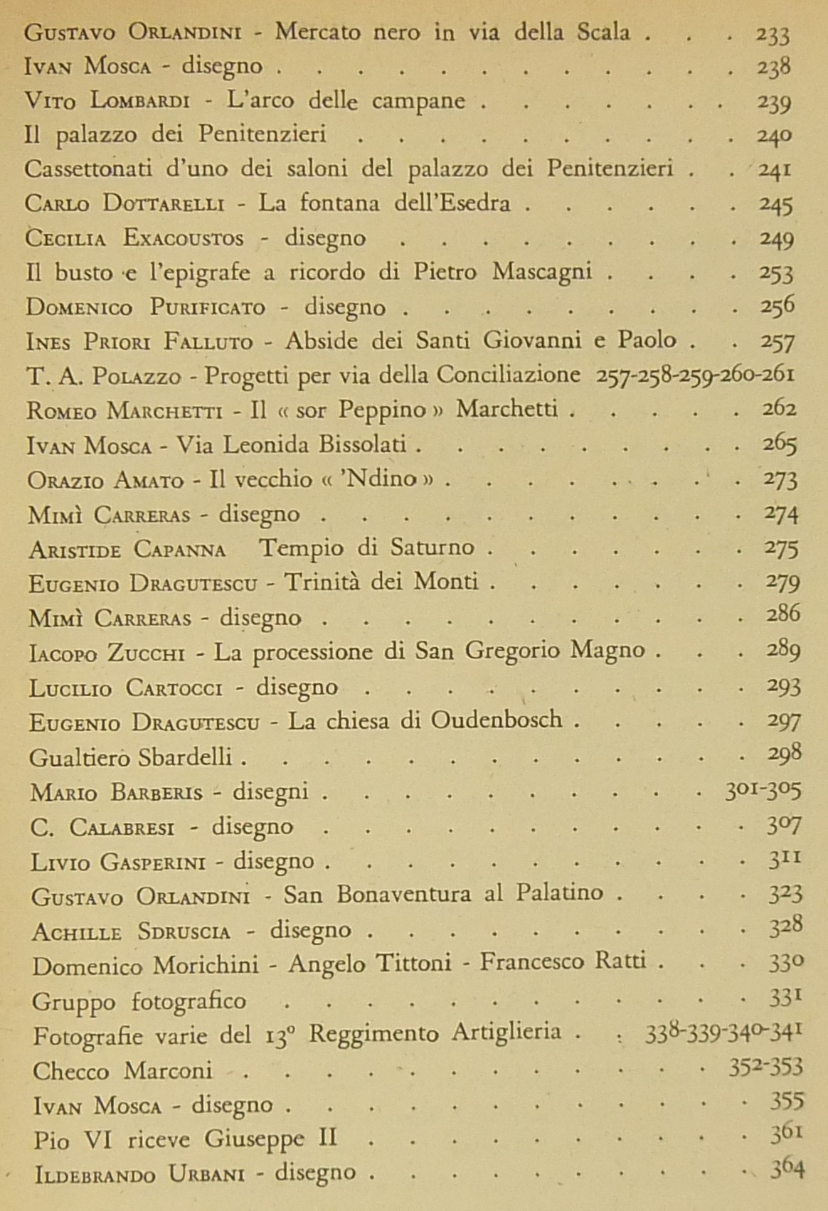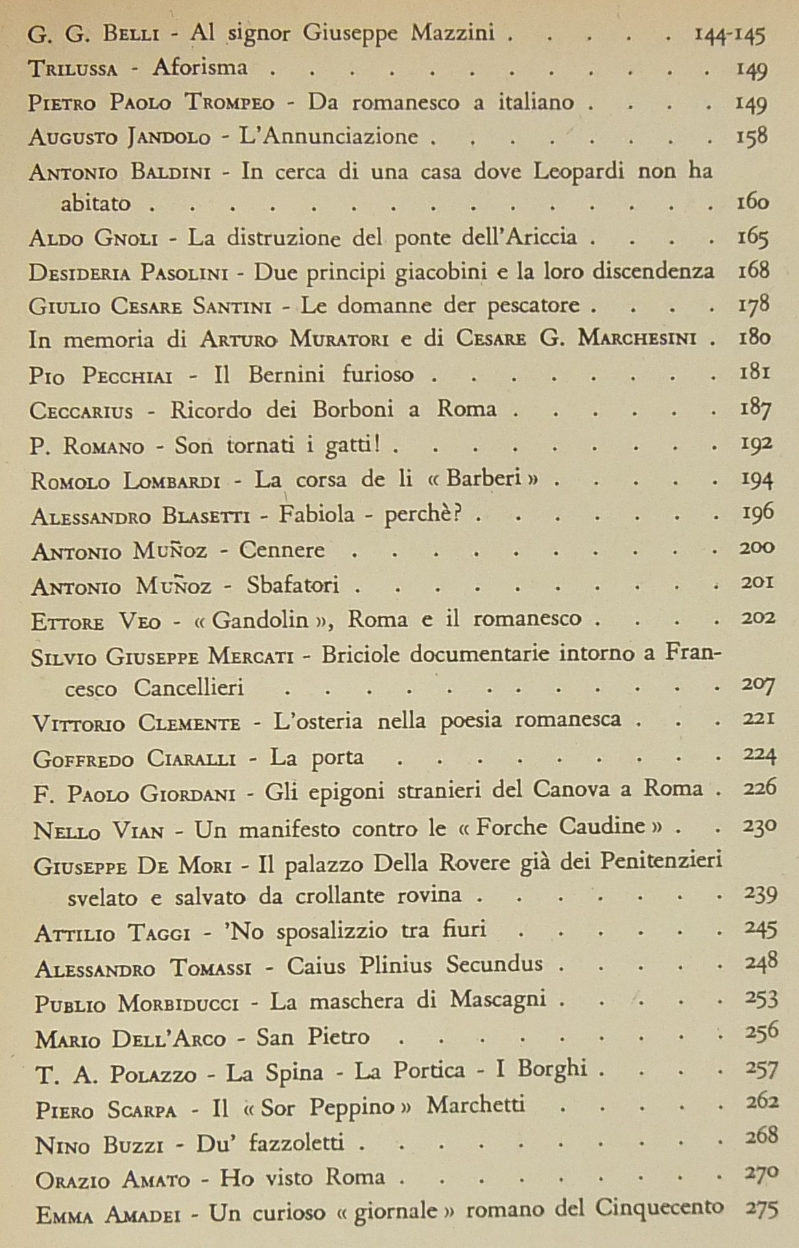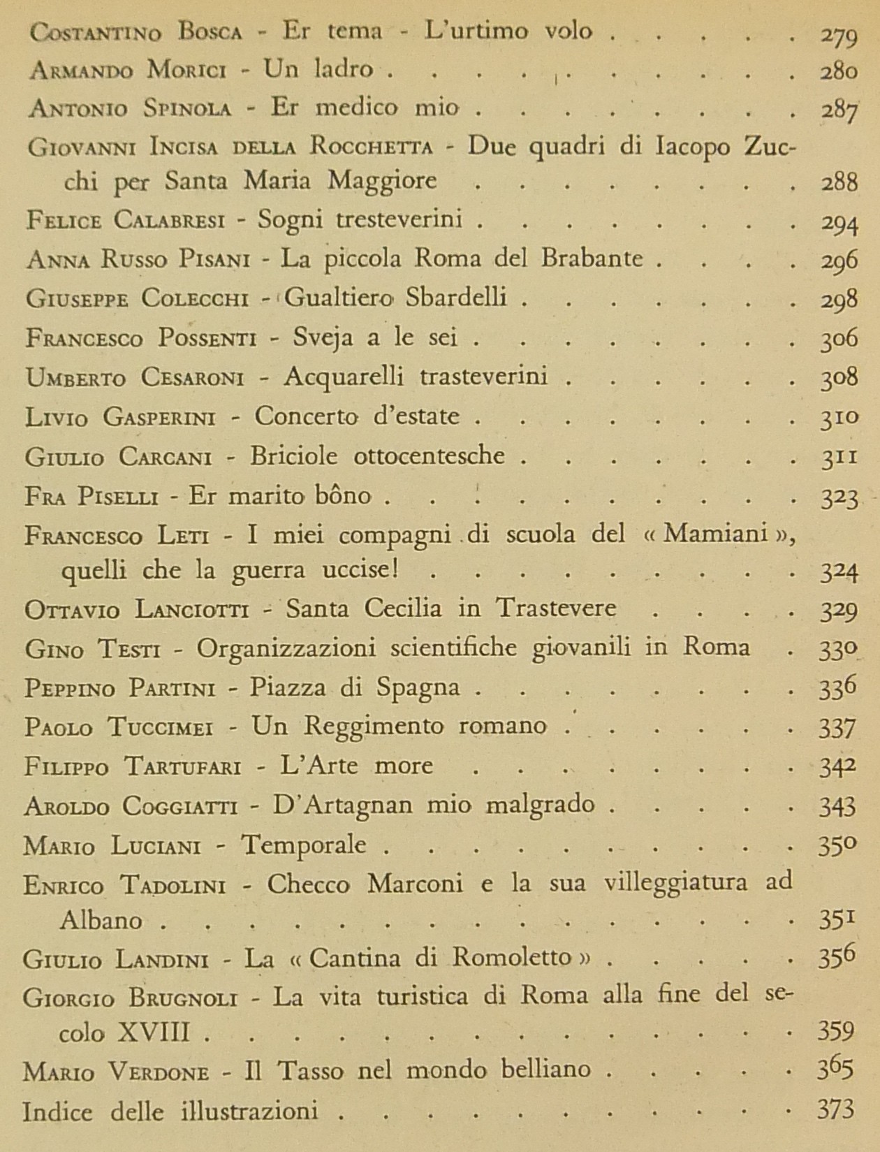 Testi di Ivanoe Bonomi, Luigi Salvatorelli, Emilia Morelli, Mario Lizzani, Leone Gessi, Emilio Re, Gigi Huetter, Rodolfo de Mattei, Gustavo Brigante Colonna, Marcello Piermattei, G. G. Belli, Trilussa, Augusto Jandolo, Antonio Baldini, Desideria Pasolini, Giulio Cesare Santini, Pio Pecchiai, Ceccarius, Alessandro Blasetti, Antonio Munoz, Ettore Veo, Silvio Giuseppe Mercati, Vittorio Clemente, F. Paolo Giordani, Mario dell’Arco, Piero Scarpa, Nino Buzzi, Orazio Amato, Emma Amadei, Antonio Spinola, Giovanni Incisa della Rocchetta, Fra Piselli, Ottavio Lanciotti, Enrico Tadolini, Giulio Landini, Mario Verdone et al.