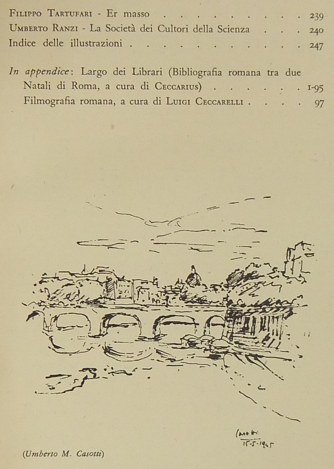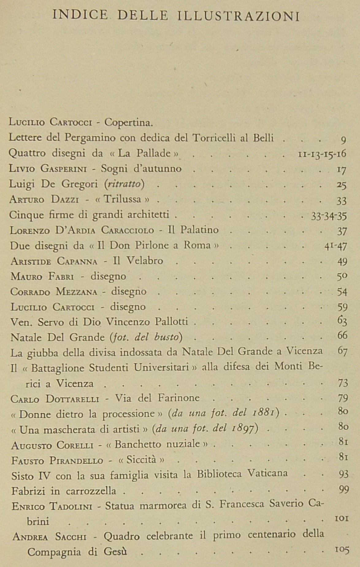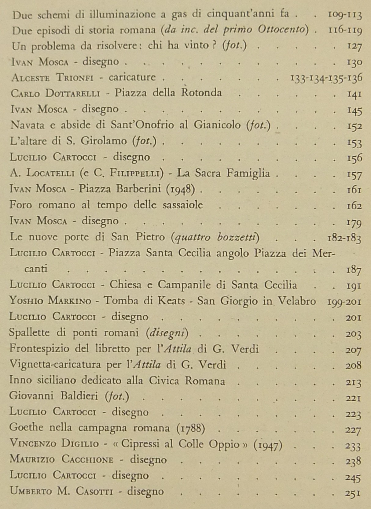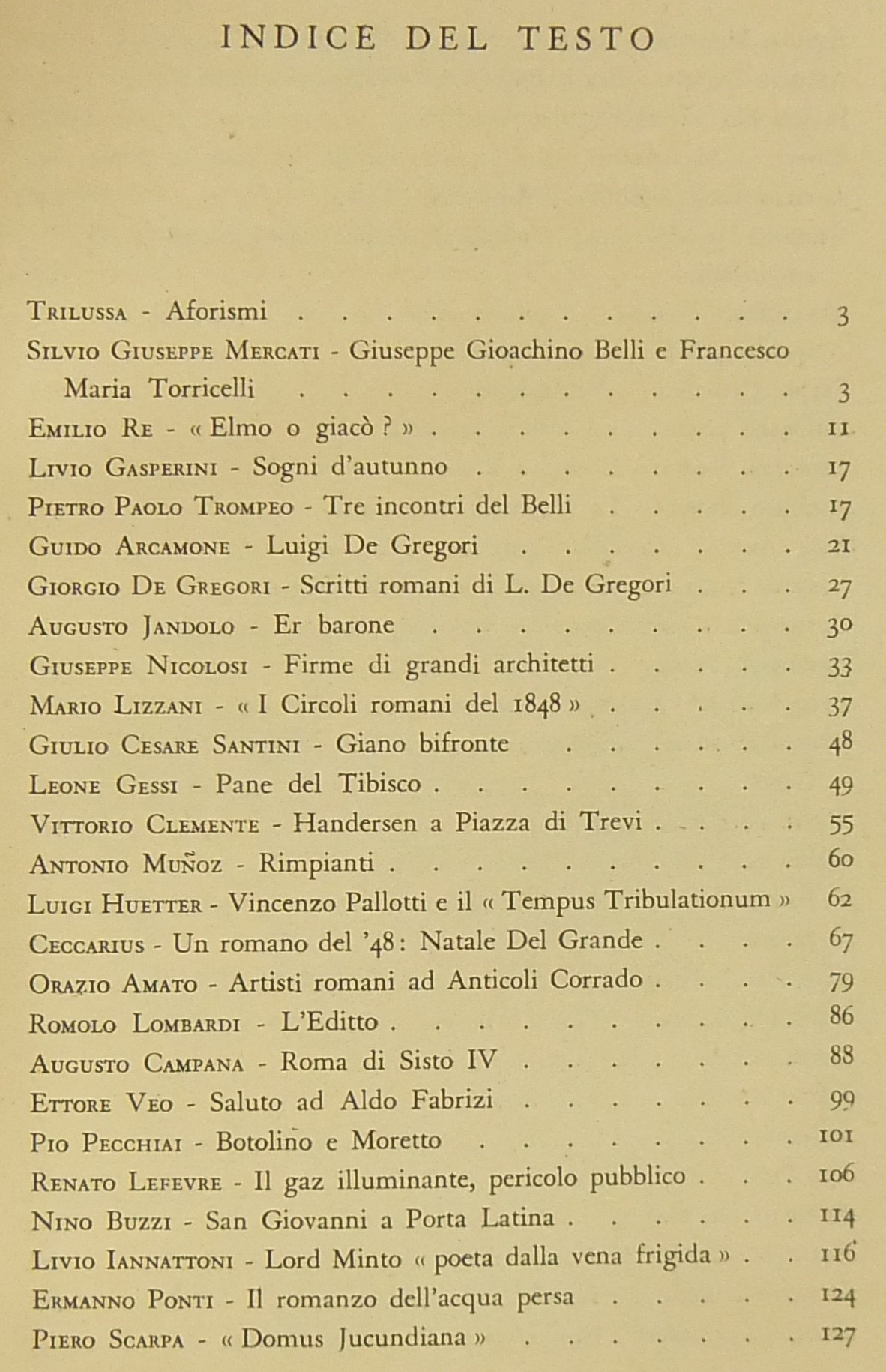 Testi di Trilussa, Giorgio de Gregori, Augusto Jandolo, Mario Lizzani, Giulio Cesare Santini, Leone Gessi, Vittorio Clemente, Antonio Munoz, Luigi Huetter, Ceccarius, Ettore Veo, Pio Pecchiai, Nino Buzzi, Ermanno Ponti, Piero Scarpa, Alceste Trionfi, Antonio Spinola, Emma Amadei, Gustavo Brigante Colonna, Mario dell’Arco, F. Paolo Giordani, Fra Piselli, Rodolfo de Mattei, Ottavio Lanciotti et al.