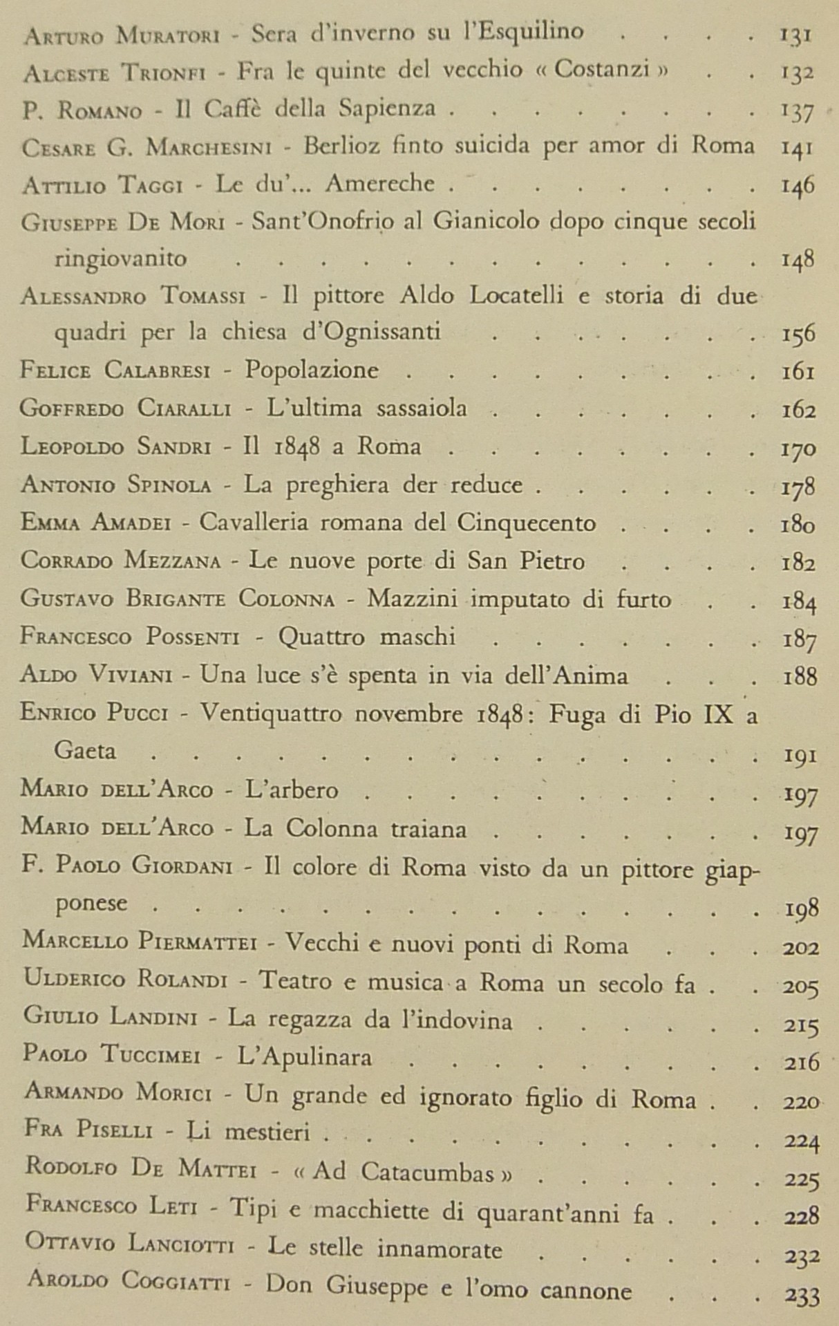 Testi di Trilussa, Giorgio de Gregori, Augusto Jandolo, Mario Lizzani, Giulio Cesare Santini, Leone Gessi, Vittorio Clemente, Antonio Munoz, Luigi Huetter, Ceccarius, Ettore Veo, Pio Pecchiai, Nino Buzzi, Ermanno Ponti, Piero Scarpa, Alceste Trionfi, Antonio Spinola, Emma Amadei, Gustavo Brigante Colonna, Mario dell'Arco, F. Paolo Giordani, Fra Piselli, Rodolfo de Mattei, Ottavio Lanciotti et al.