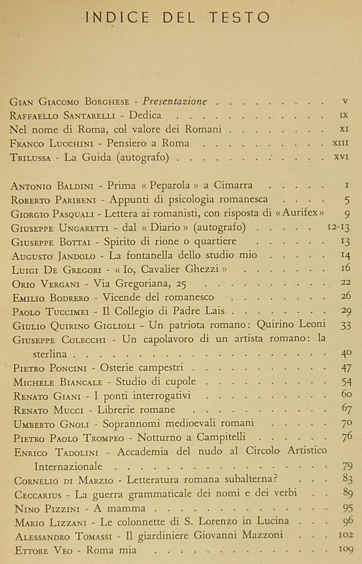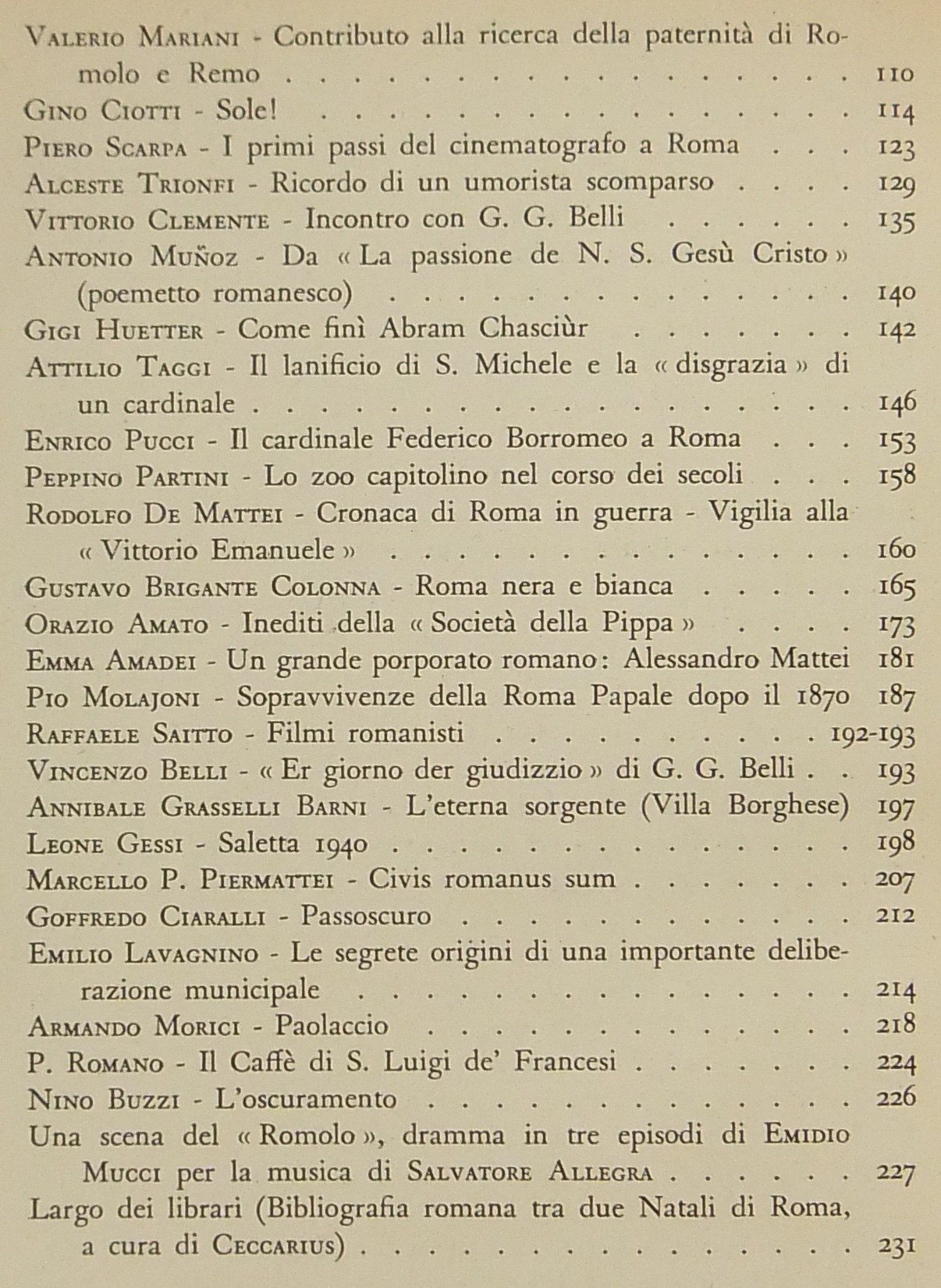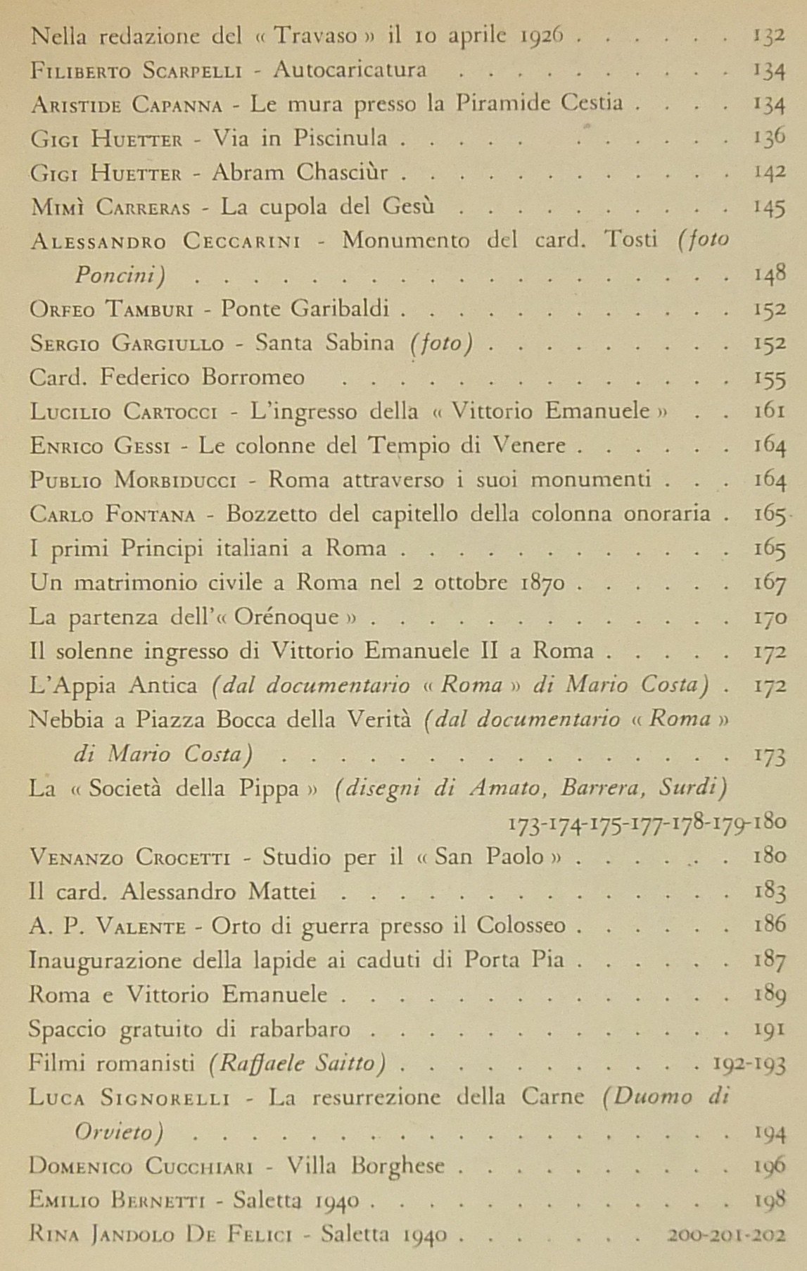 Testi di Gian Giacomo Borghese, Raffaello Santarelli, Franco Lucchini, Trilussa, Antonio Baldini, Giorgio Pasquali, Giuseppe Ungaretti, Giuseppe Bottai, Augusto Jandolo, Luigi De Gregori, Orio Vergani, Umberto Gnoli, Enrico Tadolini, Ceccarius, Mario Lizzani, Ettore Veo, Valerio Mariani, Piero Scarpa, Alceste Trionfi, Antonio Munoz, Rodolfo De Mattei, Gustavo Brigante Colonna, Emma Amadei, Pio Molajoni, Leone Gessi et al.