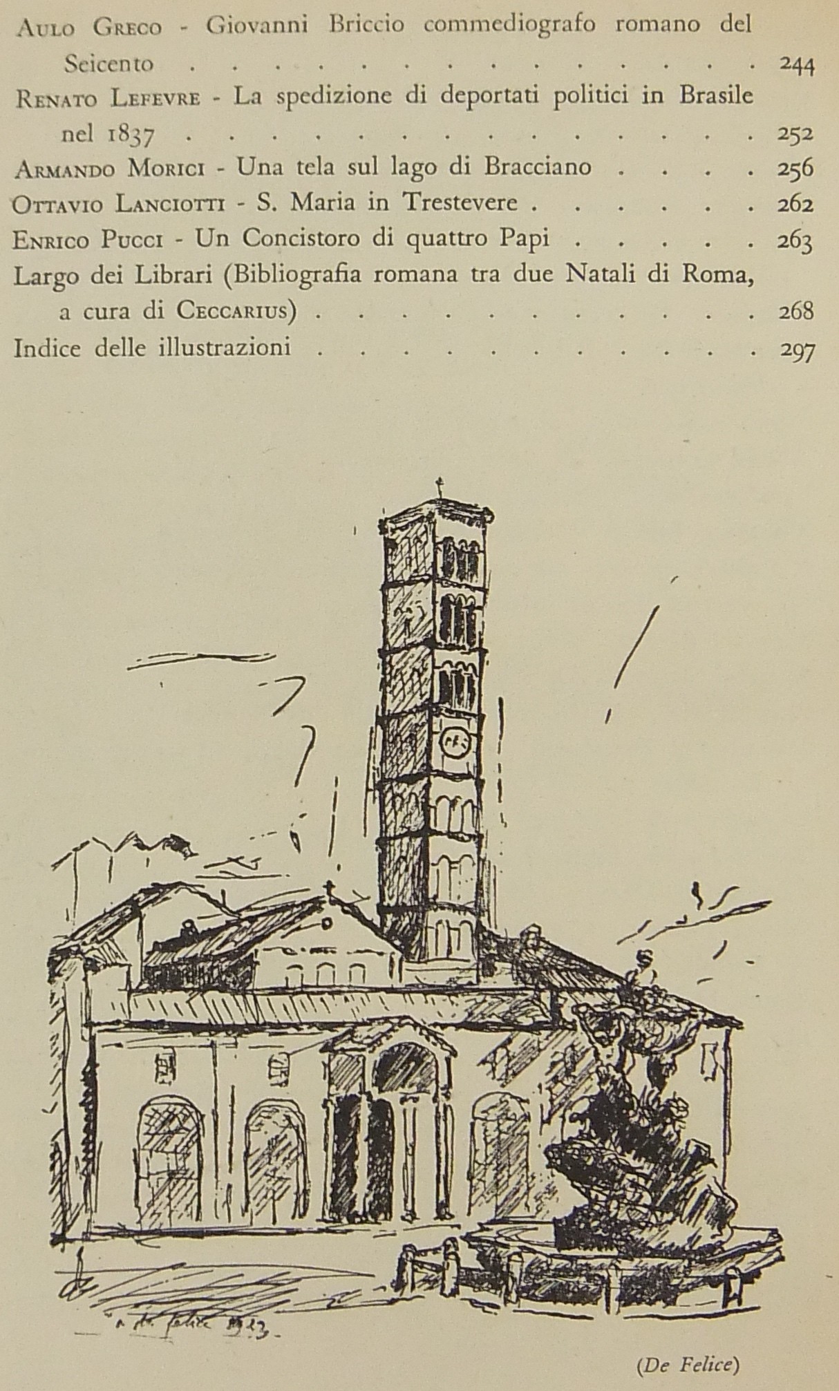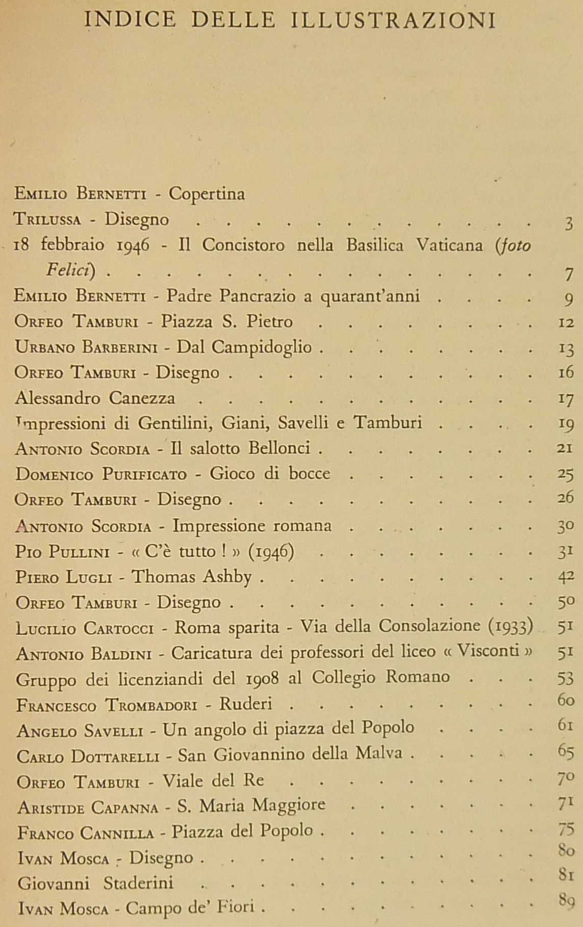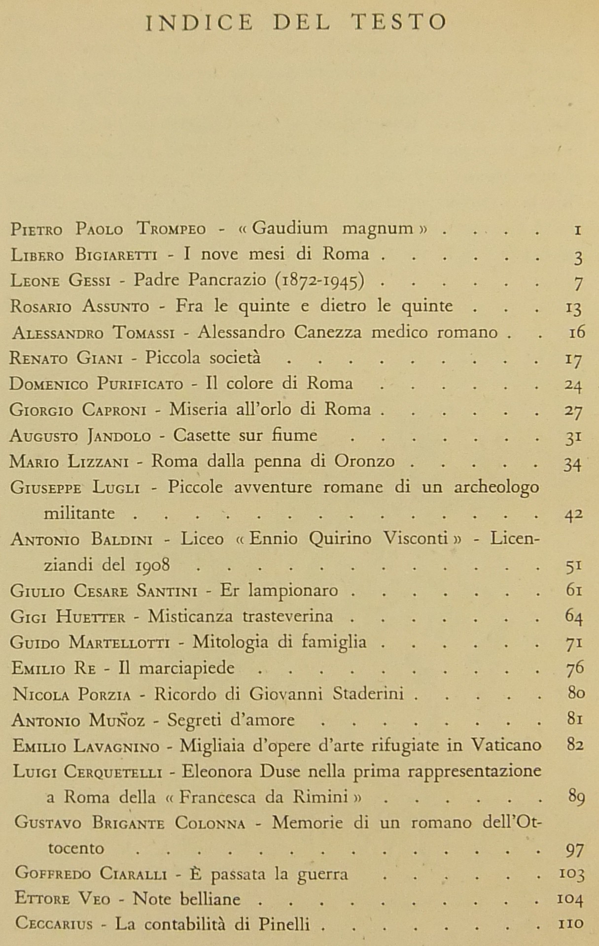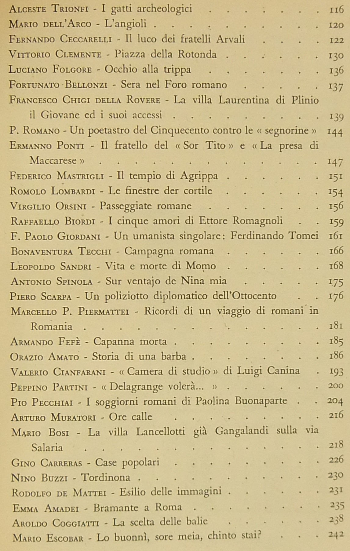 Testi di Libero Bigiaretti, Leone Gessi, Renato Giani, Giorgio Caproni, Augusto Jandolo, Mario Lizzani, Giuseppe Lugli, Antonio Baldini, Giulio Cesare Santini, Gigi Huetter, Guido Martellotti, Antonio Munoz, Gustavo Brigante Colonna, Ettore Veo, Ceccarius, Alceste Trionfi, Mario dell'Arco, Luciano Folgore, Francesco Chigi della Rovere, Ermanno Ponti, Virgilio Orsini, F. Paolo Giordani, Bonaventura Tecchi, Piero Scarpa, Pio Pecchiai, Nino Buzzi, Rodolfo De Mattei, Emma Amadei et al.
