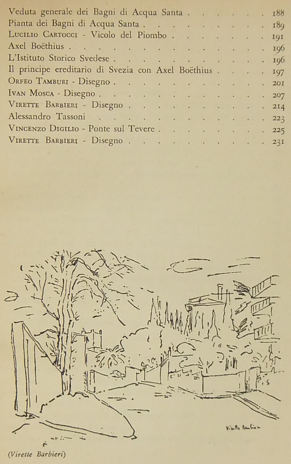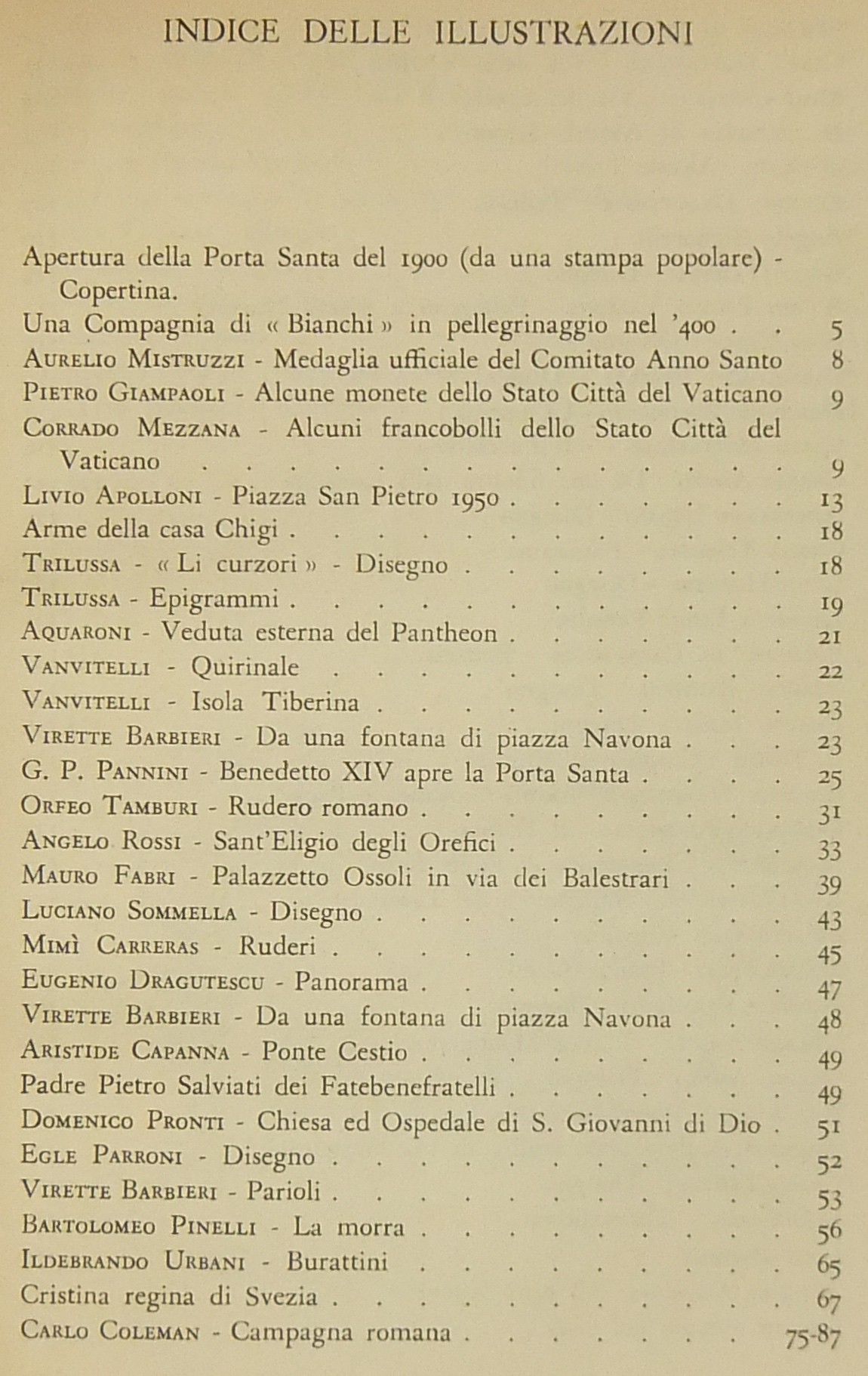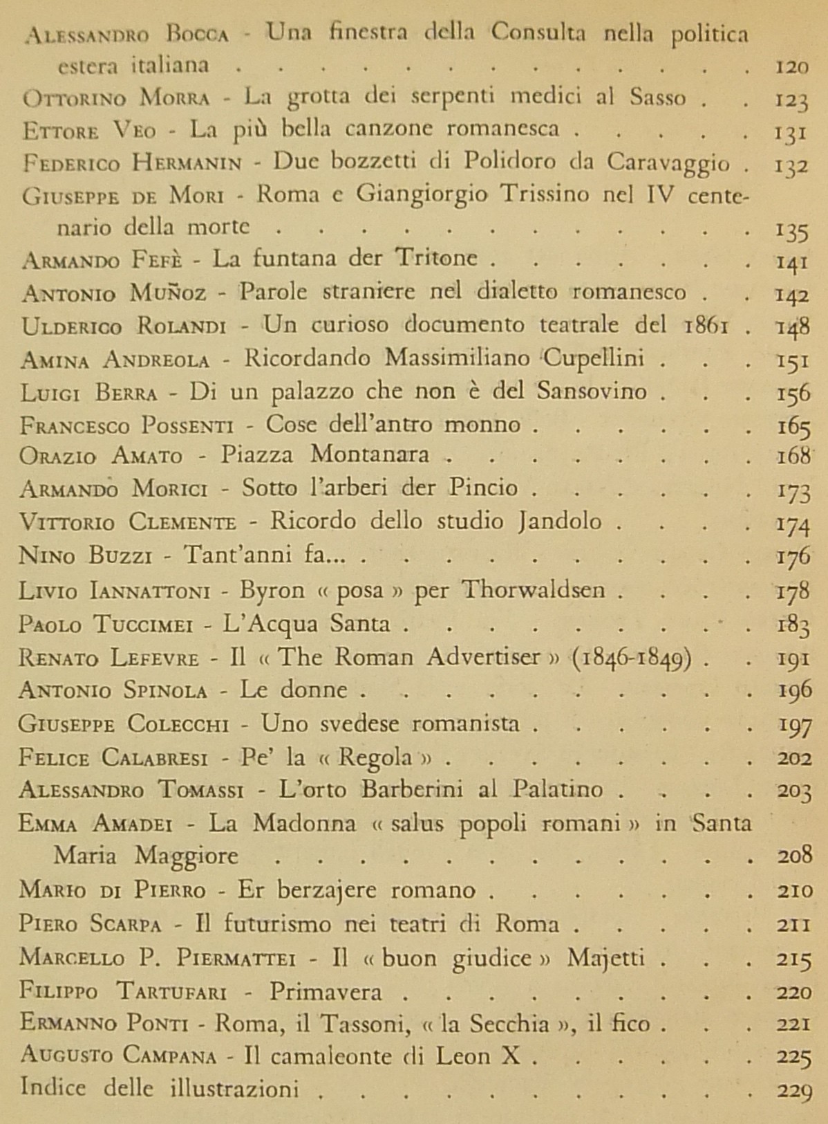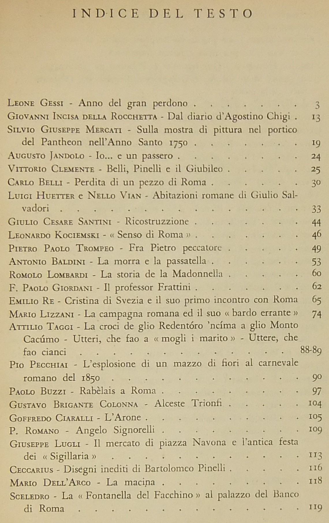Testi di Leone Gessi, Giovanni Incisa della Rocchetta, Silvio Giuseppe Mercati, Augusto Jandolo, Vittorio Clemente, Luigi Huetter, Giulio Cesare Santini, Antonio Baldini, F. Paolo Giordani, Emilio Re, Mario Lizzani, Attilio Taggi, Pio Pecchiai, Paolo Buzzi, Gustavo Brigante Colonna, Ceccarius, Mario dell’Arco, Ettore Veo, Antonio Munoz, Vittorio Clemente, Nino Buzzi, Antonio Spinola, Emma Amadei, Piero Scarpa, Ermanno Ponti, Augusto Campana et al.