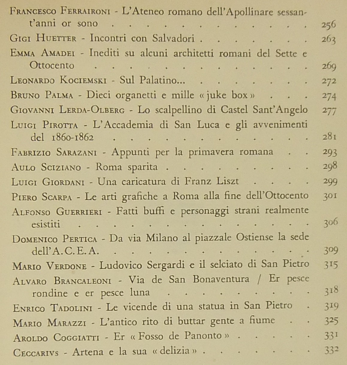 Testi di Antonio Baldini, Anton Giulio Bragaglia, Mario dell’Arco, Ettore Paratore, Marino Parenti, Mosca, Carlo A. Zanazzo, Luciano Folgore, Cesare Pascarella, Leone Gessi, Pio Pecchiai, Luciano Merlo, Romolo Trinchieri, Francesco Ferraironi, Emma Amadei, Piero Scarpa, Mario Verdone, Aroldo Coggiatti, Ceccarius et al.