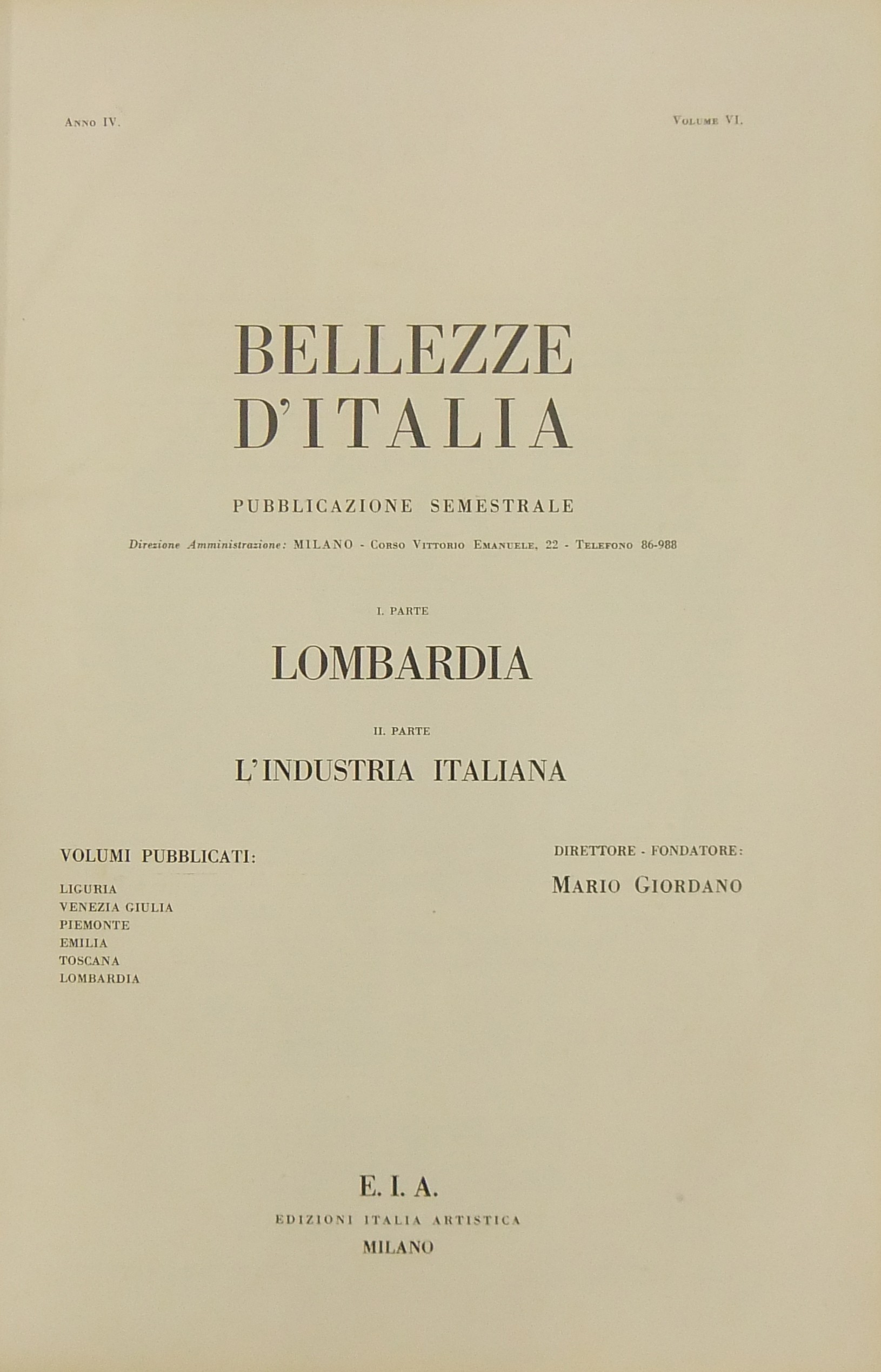 Bellezze d'Italia. Direttore-fondatore Mario Giordano. Anno IV vol. VI - Parte I - Lombardia. Parte II - L'industria italiana