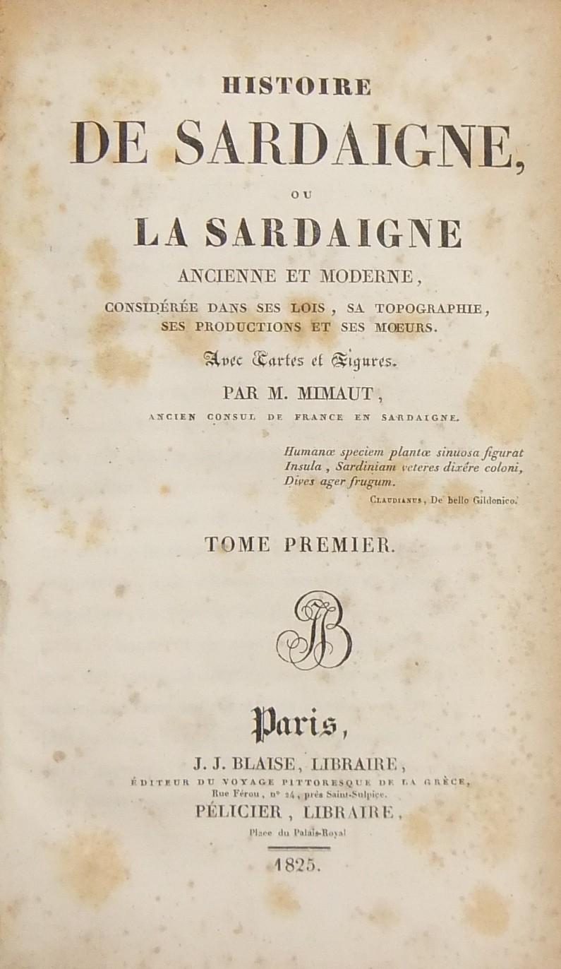 Histoire de Sardaigne, ou la Sardaigne ancienne et moderne, considerée dans ses lois, sa topographie, ses productions et ses moeurs. Avec cartes et figures