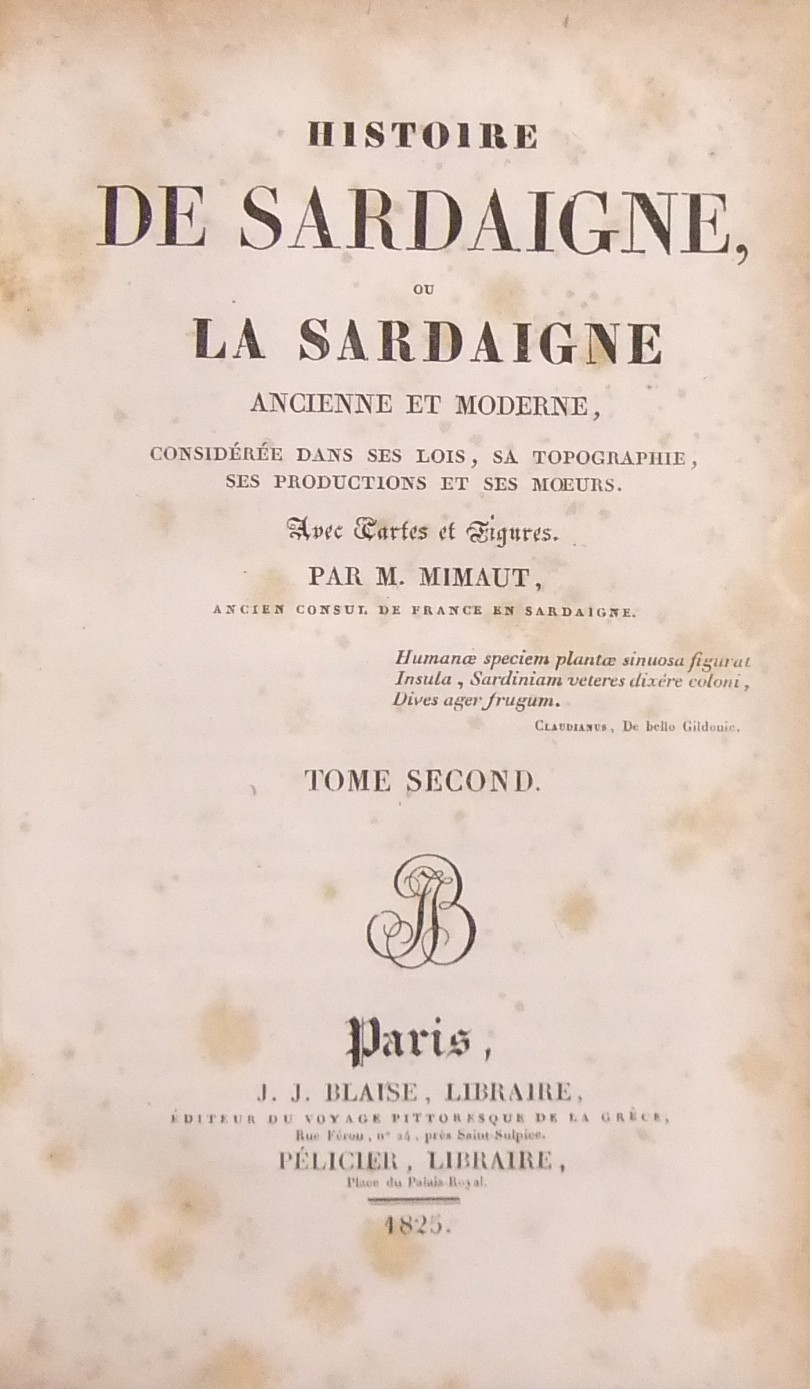 L'Autore fu Console in Sardegna fino al 1829. Rara edizione di una delle opere più apprezzate sulla Sardegna. Con 2 carte geografiche grandi ripiegate dell'isola, 2 tavole di costumi sardi e una di monete.