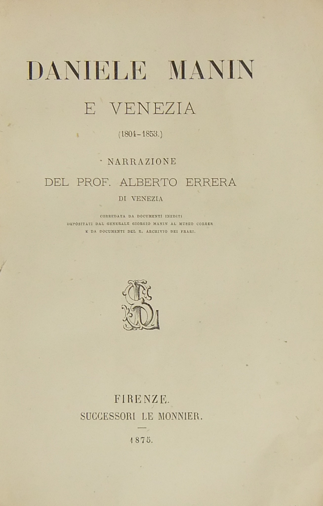 Daniele Manin e Venezia (1804-1853). Narrazione.. Corredata da documenti inediti depositati dal generale Giorgio Manin al Museo Correr e da documenti del R. Archivio dei Frari