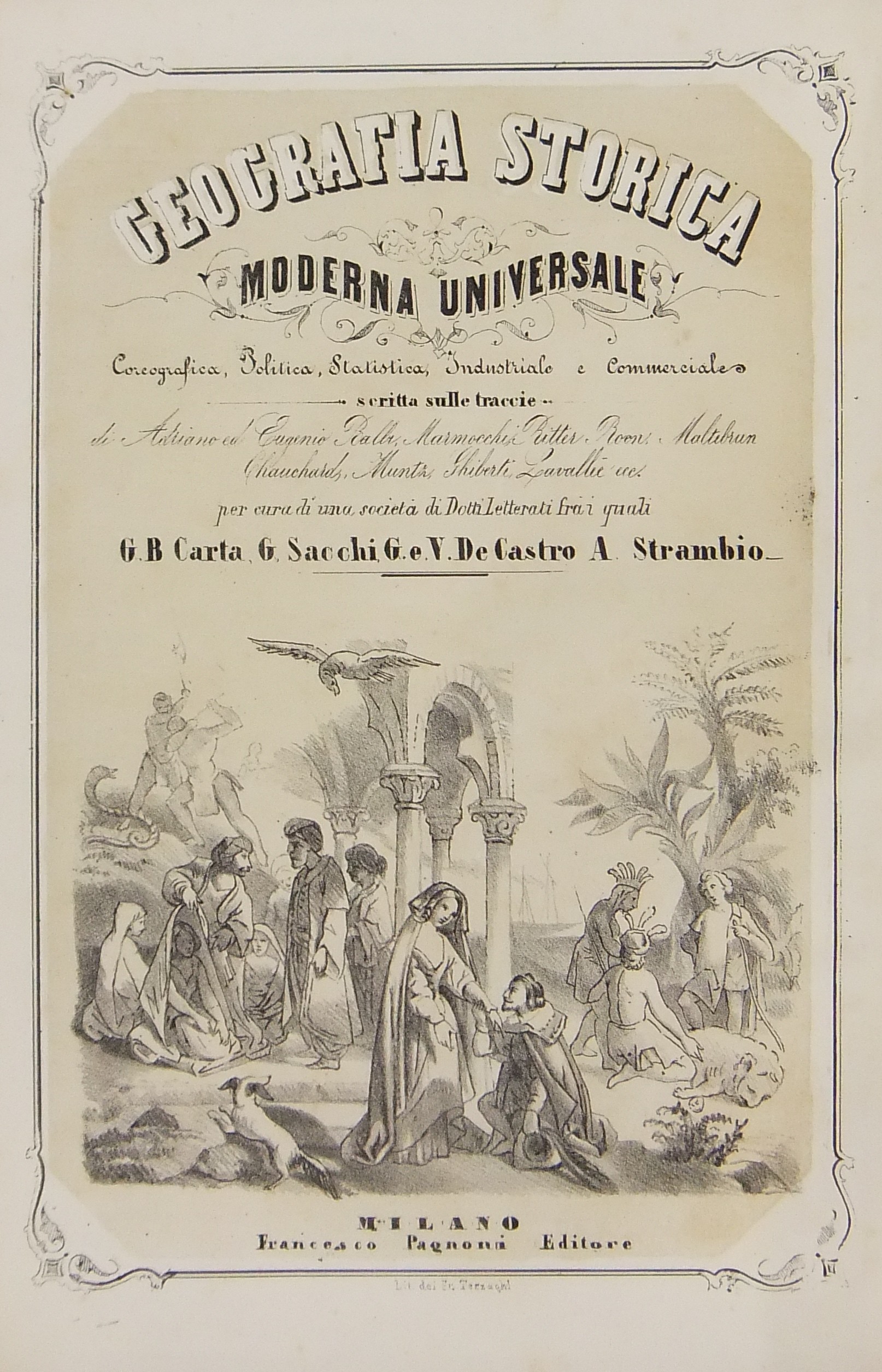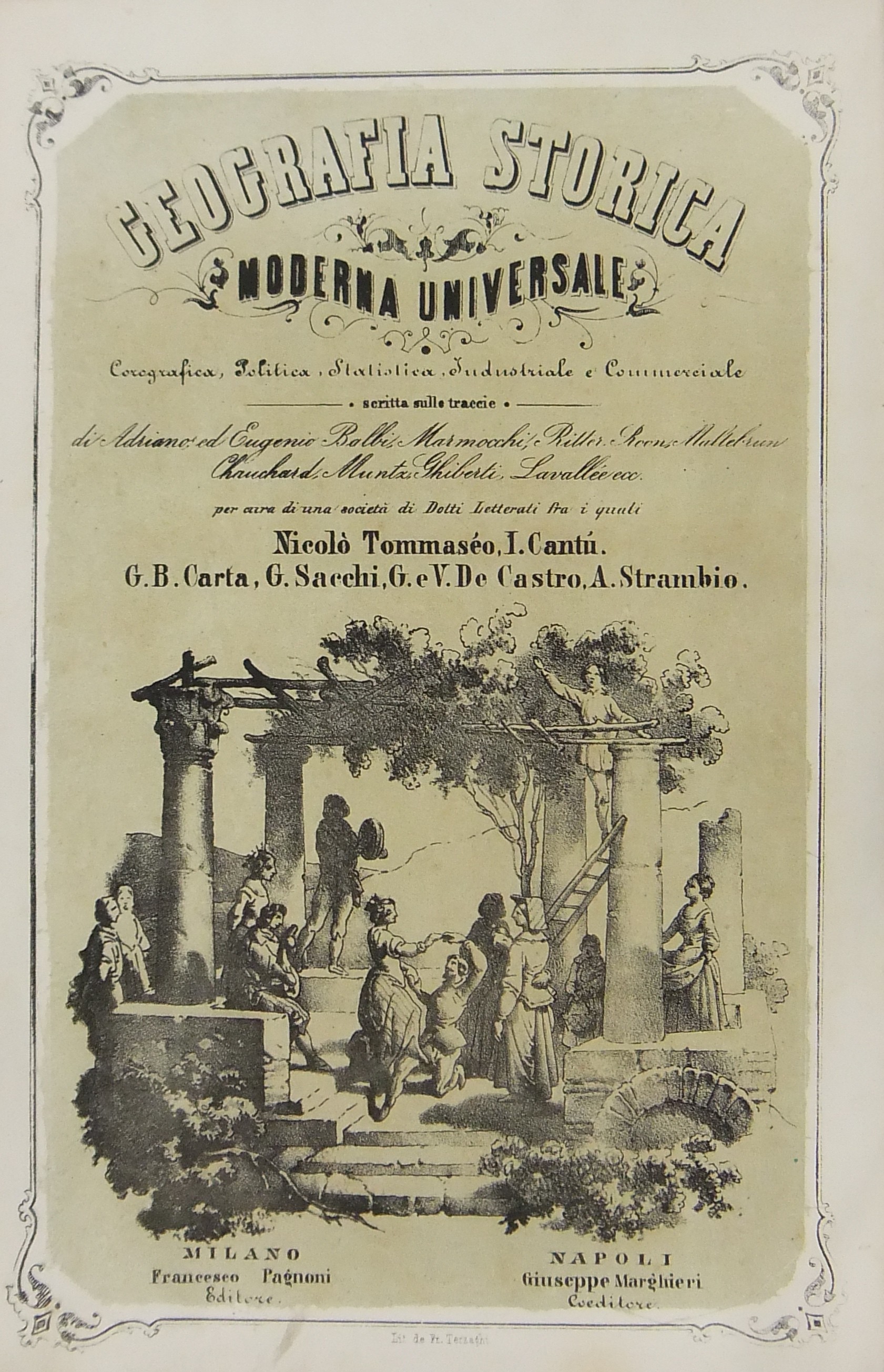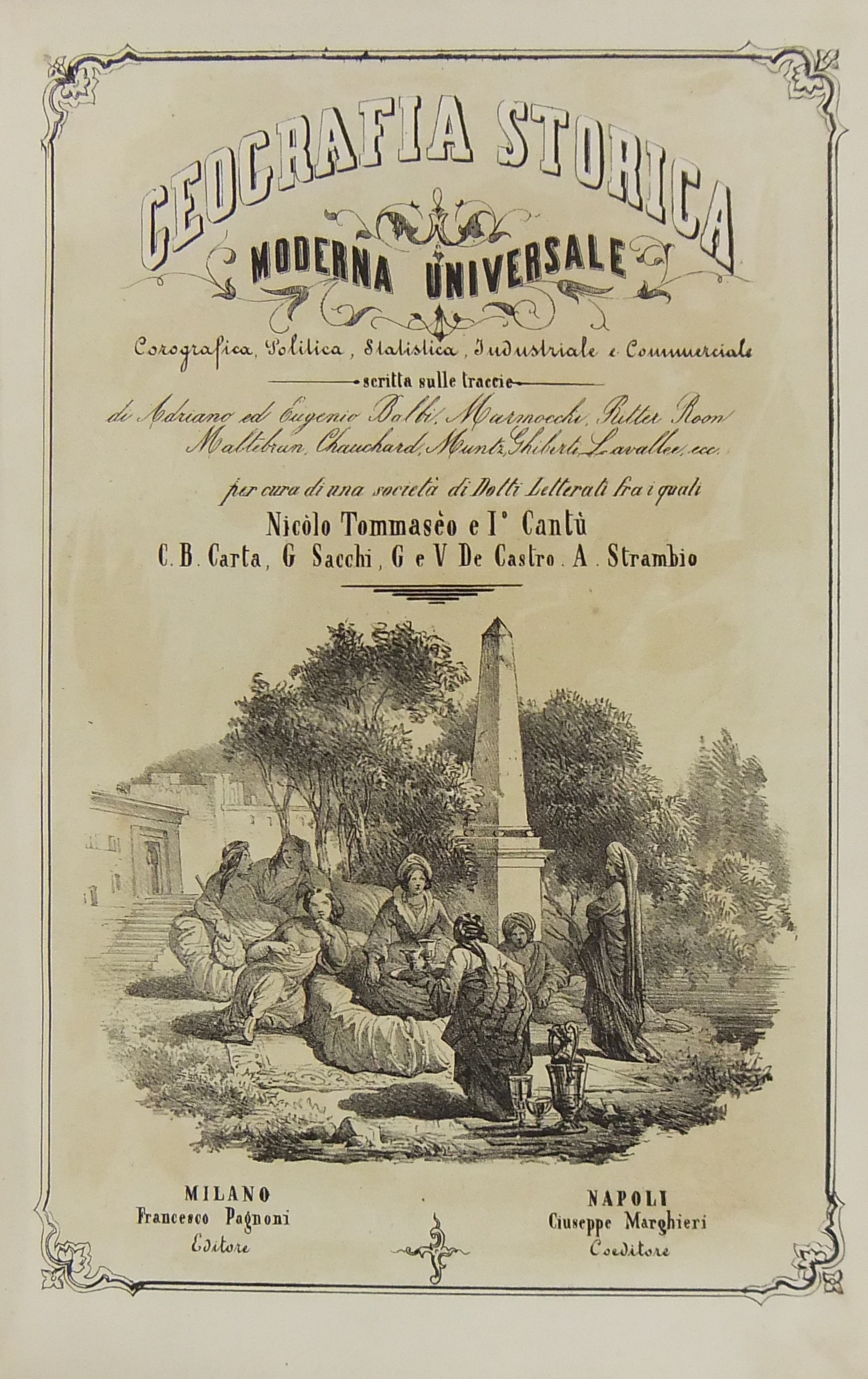 Geografia storica moderna universale. Corografica, politica, statistica, industriale e commerciale. Scritta sulle tracce di Adriano ed Eugenio Balbi, Marmocchi, Ritter.. Ecc.. per cura di una società di Dotti Letterati fra i quali Nicolò Tommaseo, I. Cantù, G. B. Carta, G. Sacchi, G. e V. De Castro, A. Strambio