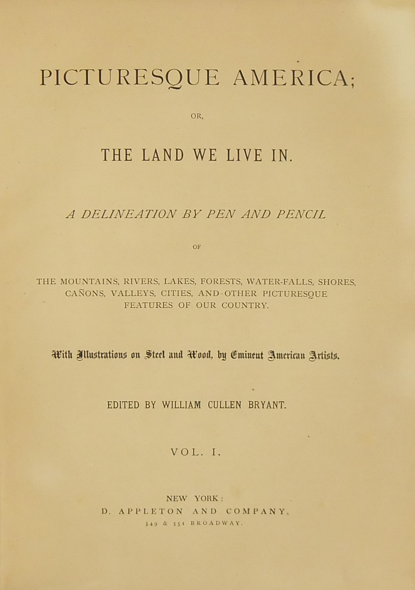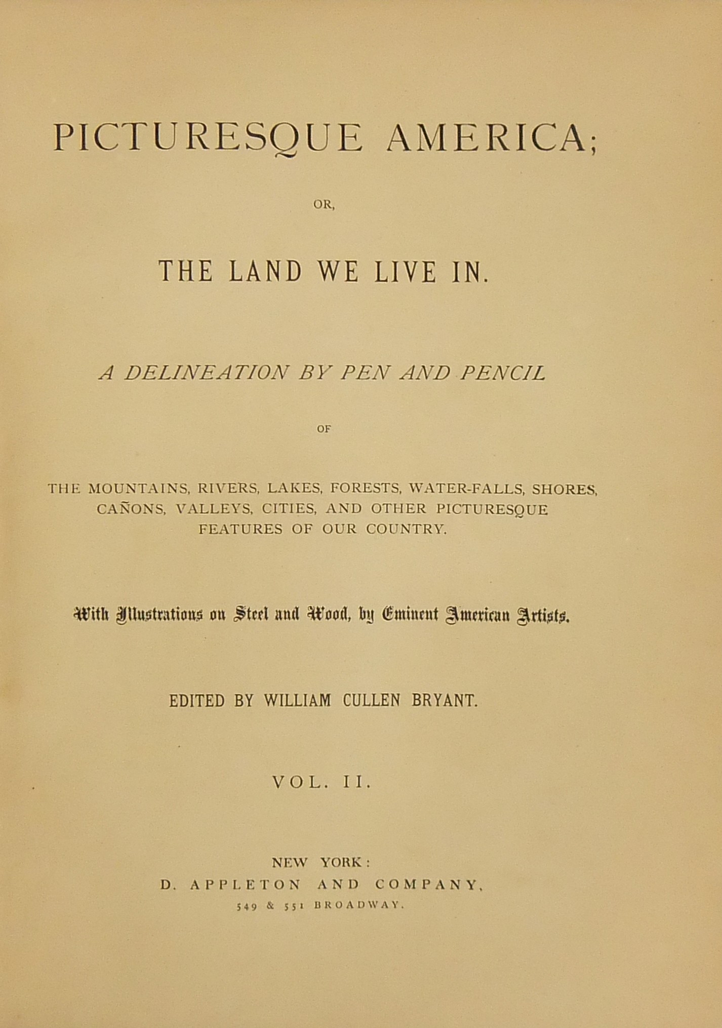 Picturesque America or the land we live in. A delineation by pen and pensil of montains rivers lakes forests water-falls shores canons valleys cities and other picturesque features of our country. With illustrations on steel and wood by Eminent American Artists.