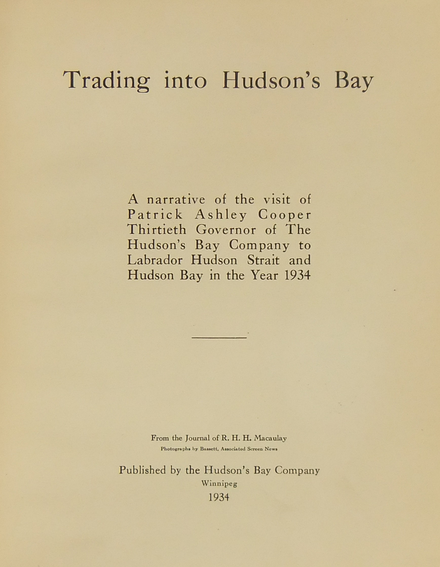 Trading into Hudson's Bay. A Narrative of the visit of Patrick Ashley Cooper Thirtieth Governor of The Hudson's Bay Company to Labrador Hudson Strait and Hudson Bay in the Year 1934