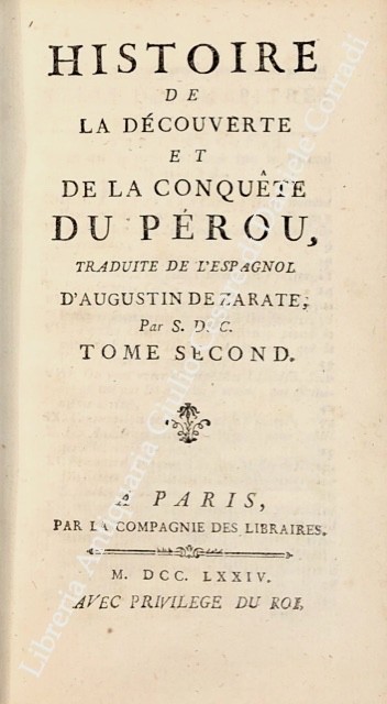 Histoire de la decouverte et de la conquete du Perou, traduite de l'espagnol d'Augustin de Zarate, par S. D. C. Tomo secondo