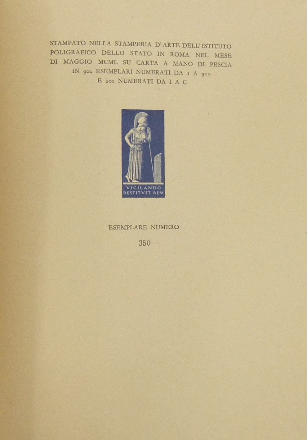 Stampato nella stamperia d'arte dell'Istituto Poligrafico dello Stato su carta a mano di Pescia in 900 esemplari numerati. Nostro esemplare n. 350