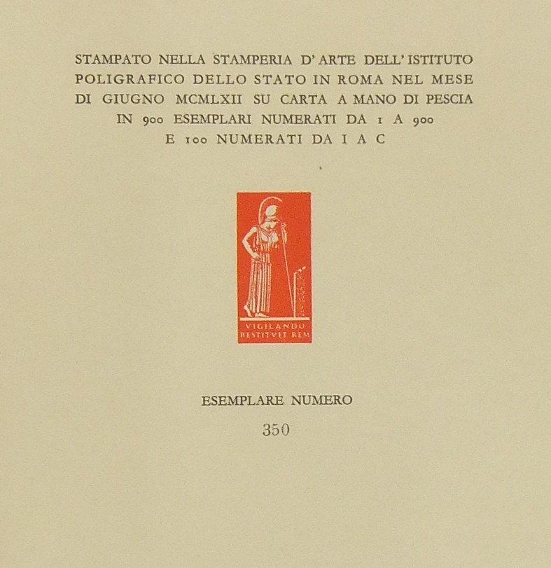 Stampato nella stamperia d'arte dell'Istituto Poligrafico dello Stato su carta a mano di Pescia in 900 esemplari numerati. Nostro esemplare n. 350