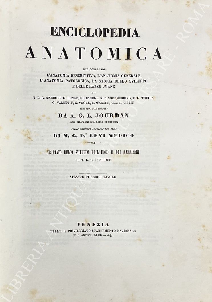 Enciclopedia anatomica che comprende l'anatomia descrittiva, l'anatomia generale, l'anatomia patologica, la storia dello sviluppo e delle razze umane. Tradotta dal tedesco da A.G.L. Jourdan. Prima traduzione italiana di M.G.Dr. Levi Medico. Vol. I - Trattato di osteologia e di sindesmologia di S.T. Soemmerring; Trattato della meccanica degli organi della locomozione di G. ed E. Weber. Vol. II - Trattato dello sviluppo dell'uomo e dei mammiferi di T.L.G. Bischoff