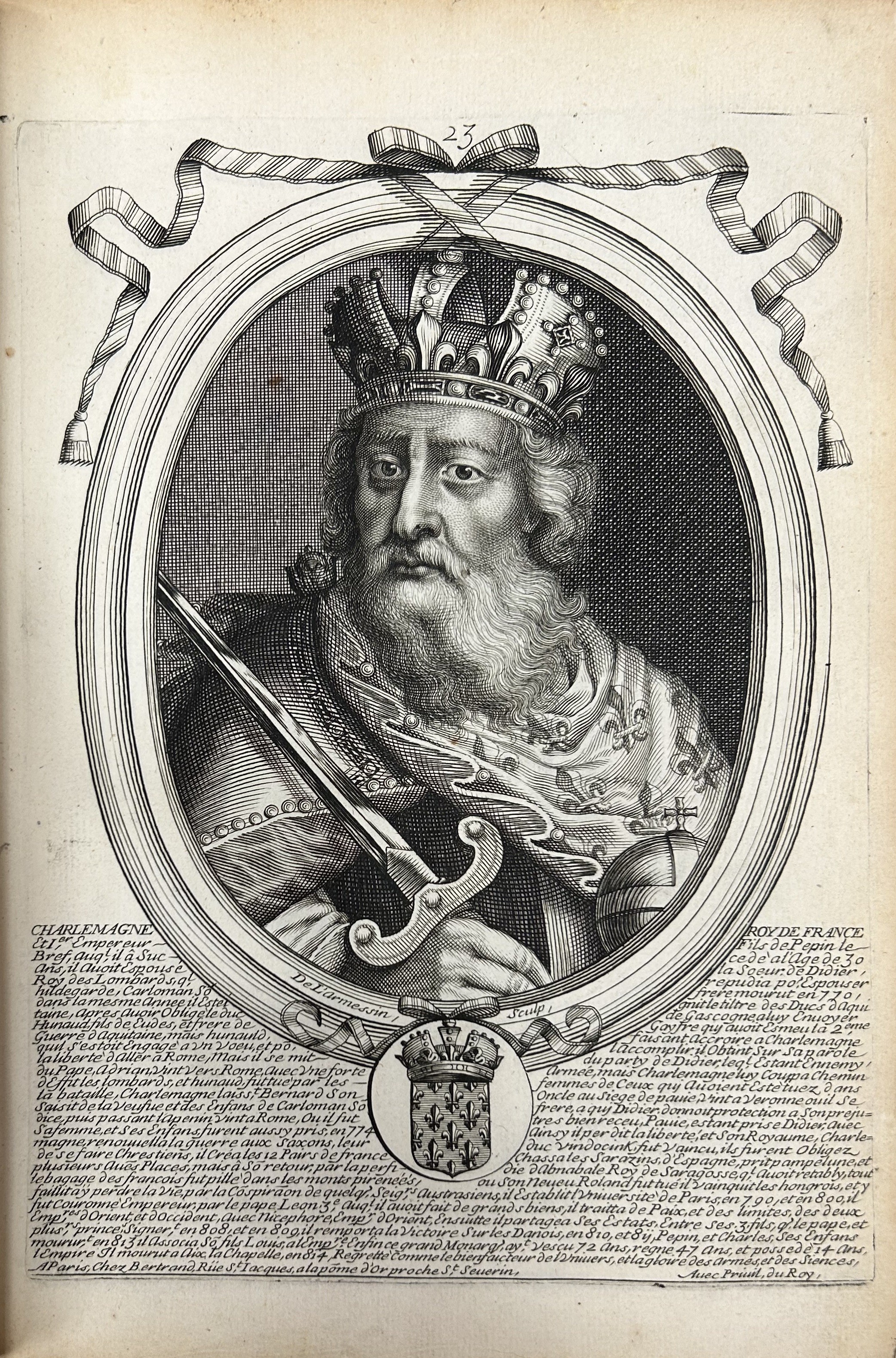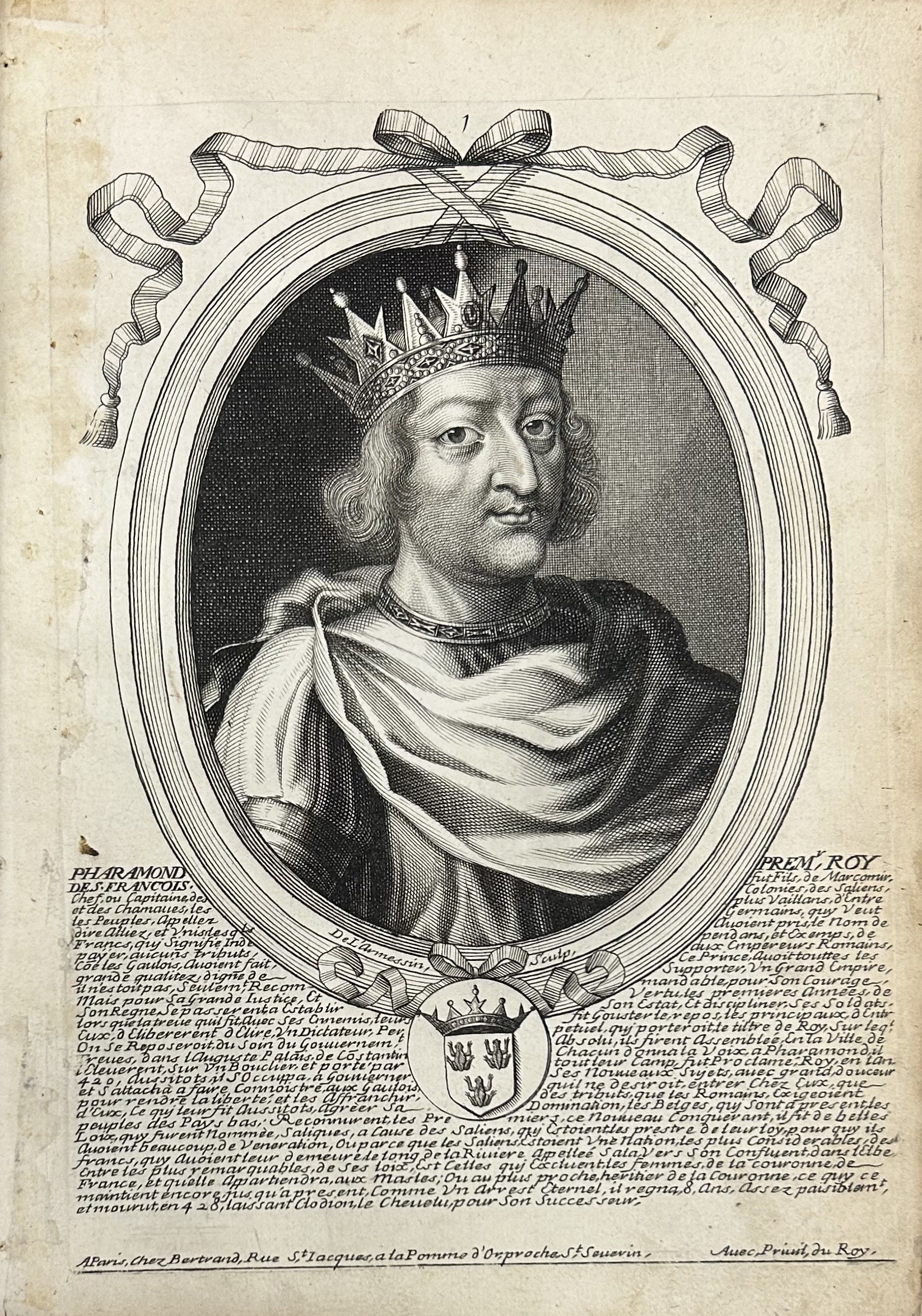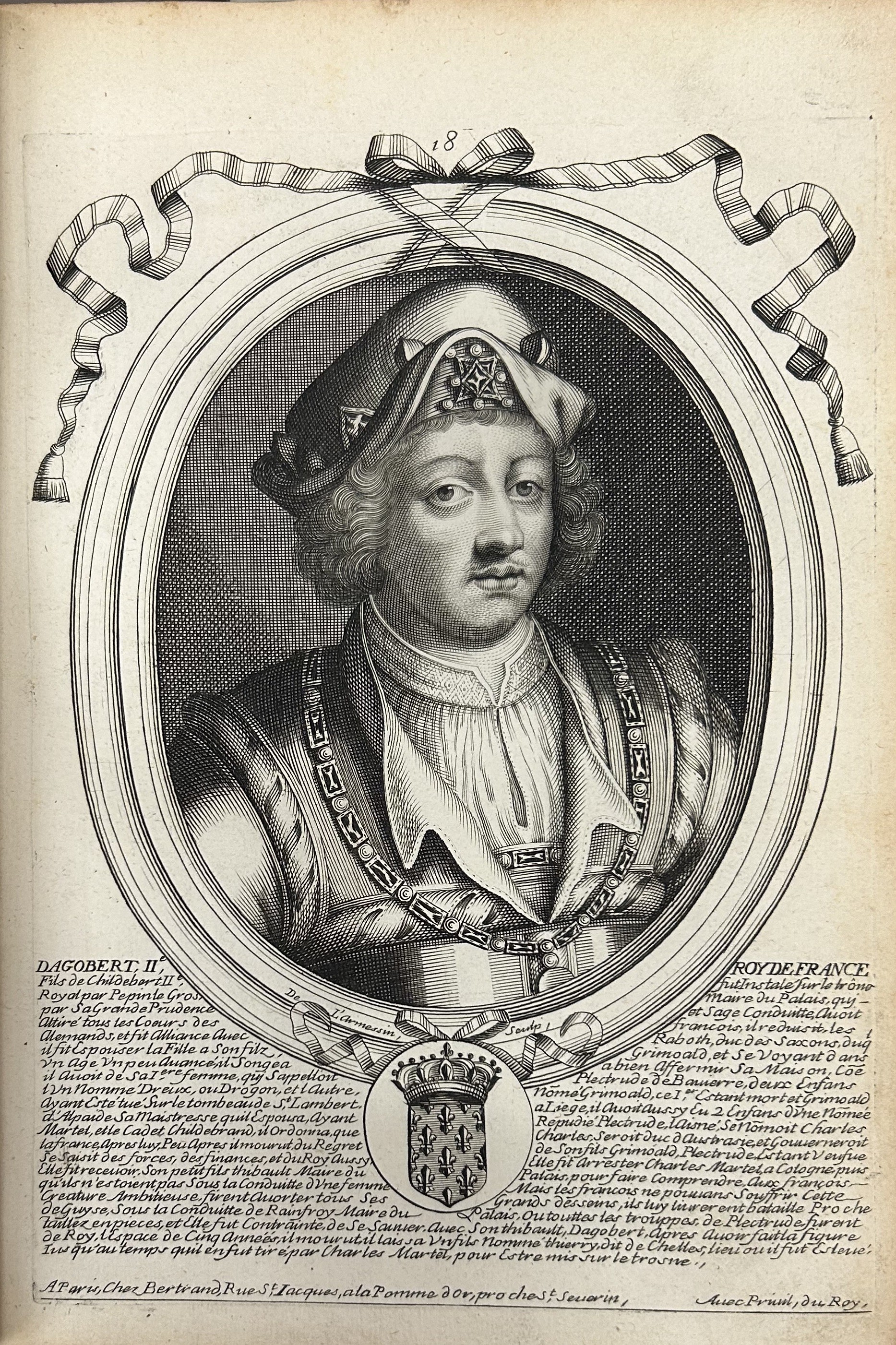 Les augustes representations de tous les roys de France depuis Pharamond iusqu'a Louys XIIII dit le Grand a present regnant, 1679. Avec un abrege historique sous chacun. Contenant leur naissances, inclinations et actions plus remarquables pendant leurs regnes. De Larmessin sculp. 1679