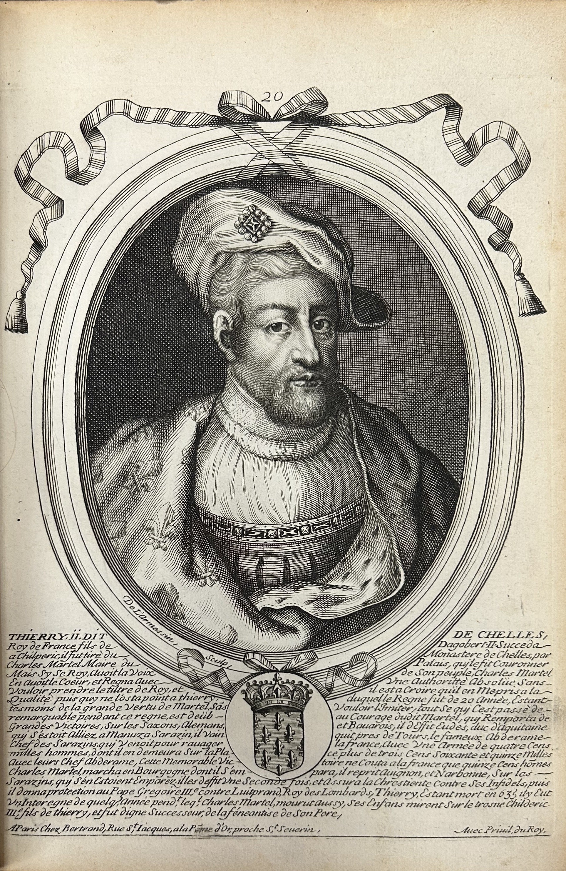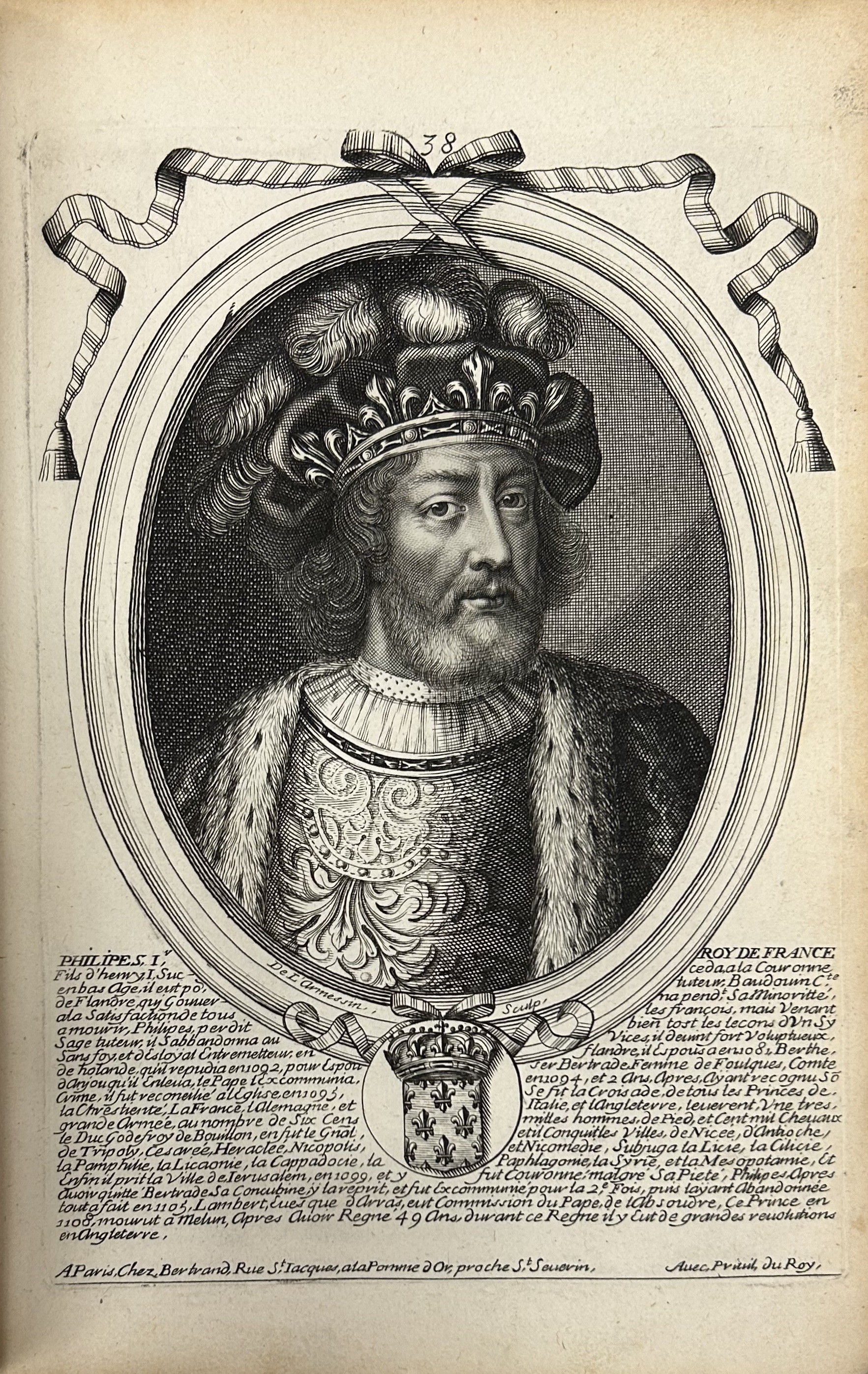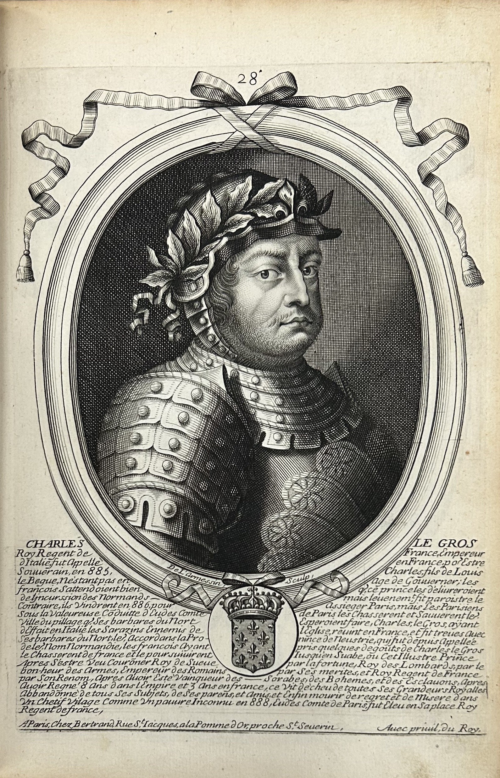 Les augustes representations de tous les roys de France depuis Pharamond iusqu'a Louys XIIII dit le Grand a present regnant, 1679. Avec un abrege historique sous chacun. Contenant leur naissances, inclinations et actions plus remarquables pendant leurs regnes. De Larmessin sculp. 1679