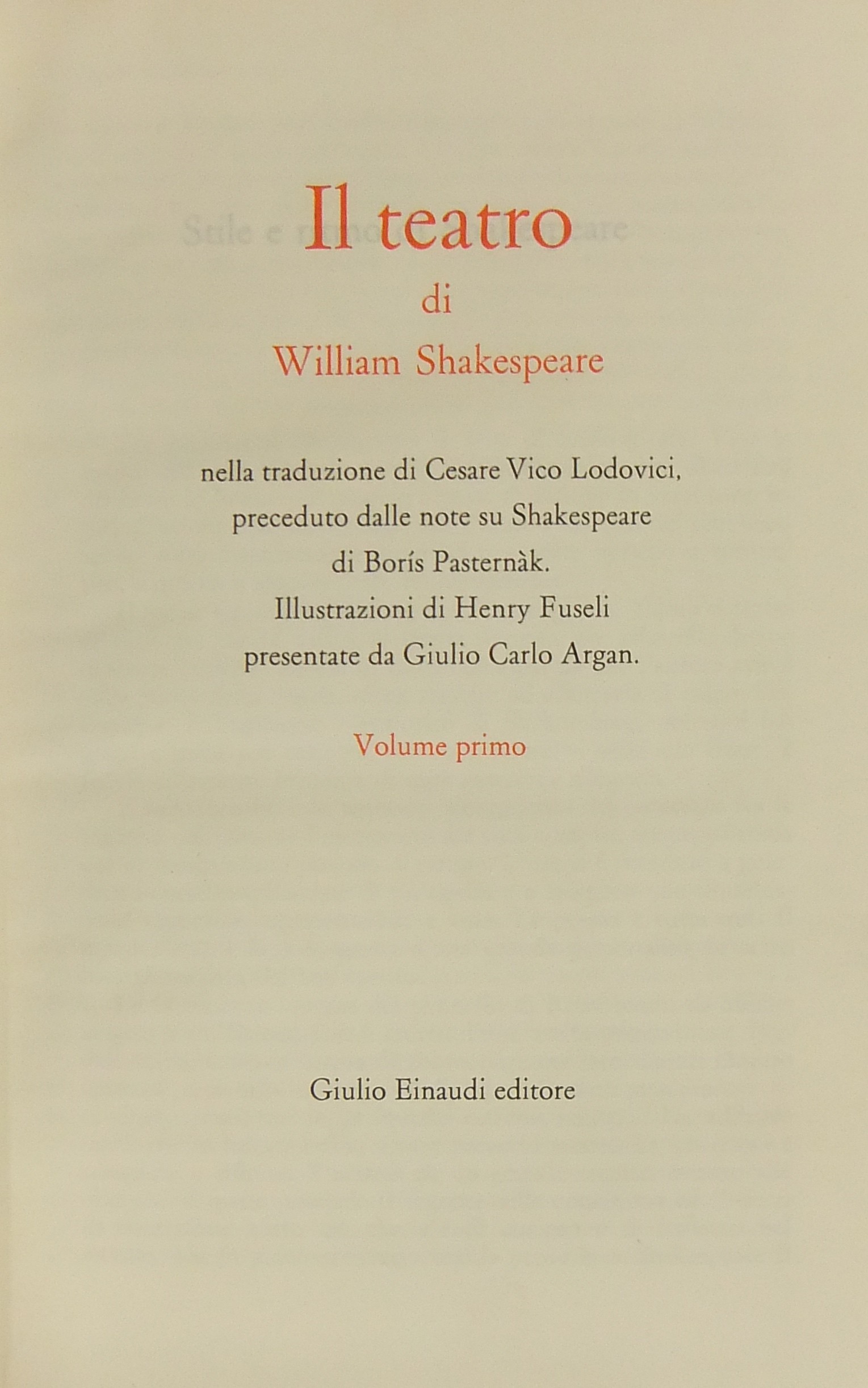 Il teatro di William Shakespeare nella traduzione di Cesare Vico Lodovici preceduto dalle note su Shakespeare di Boris Pasternak. Illustrazioni di Henry Fuseli presentate da Giulio Carlo Argan