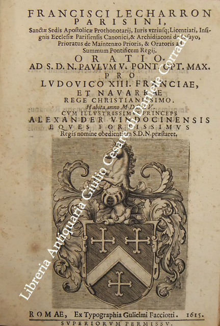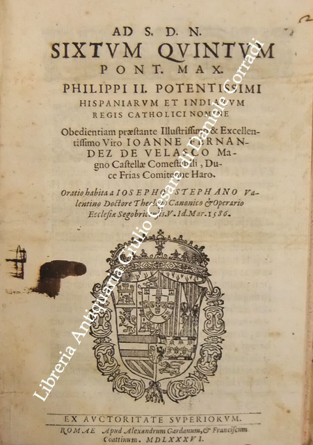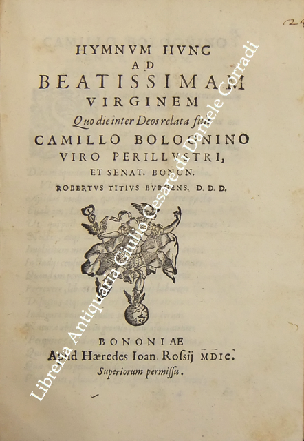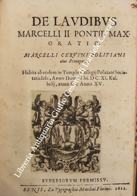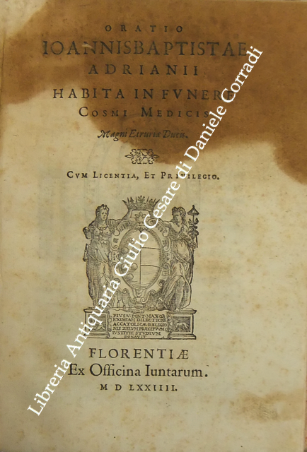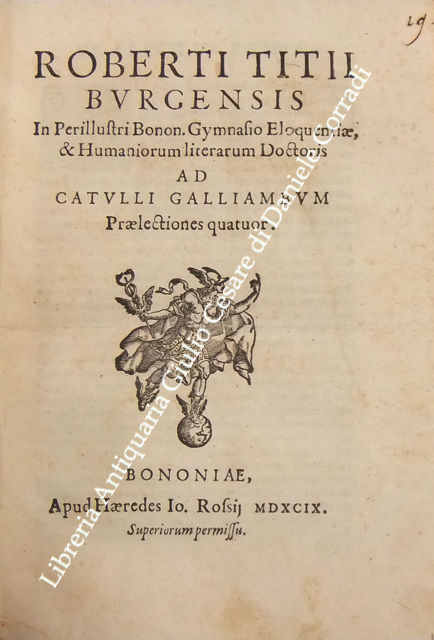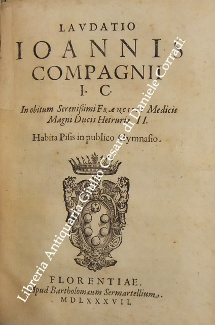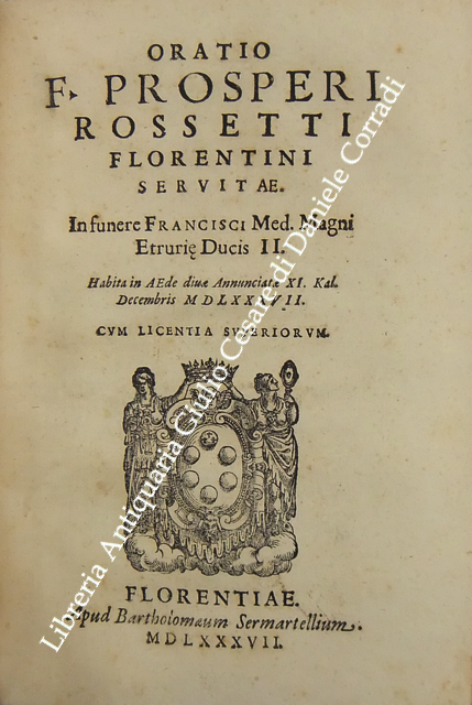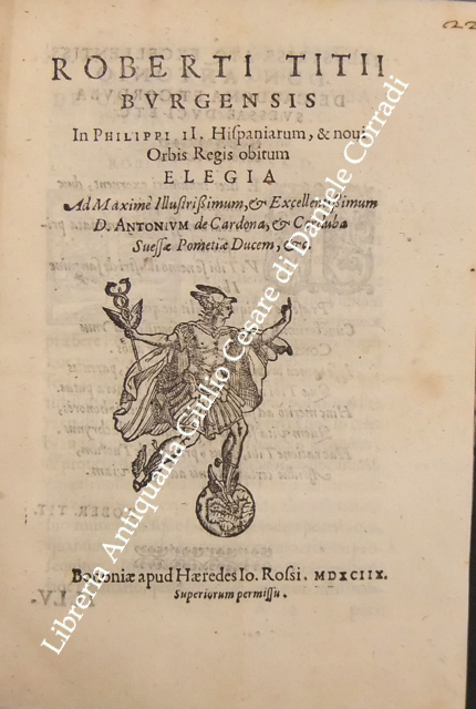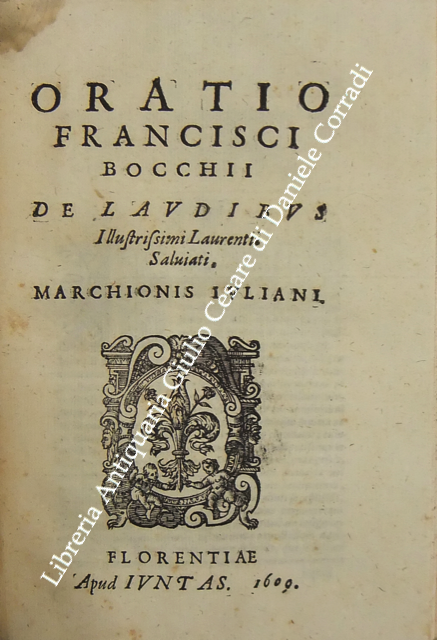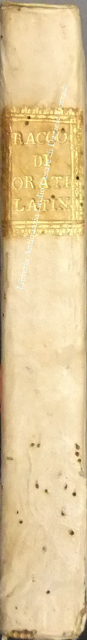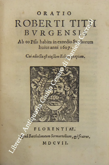 Roberto Titi... Roberti Titii Burgopolitani, Ad Georgica Virgilii paelectiones quatuor. Bononiae, Apud Haeredes Io. Rossij, 1597, pp. 45. UNITO A: Roberti Titii Burgensis, In Philippi II. Hispaniarum, & noui Orbis Regis obitum Elegia.. 1598, pp. (8). UNITO A: Roberti Titii Burgensis, Ad Caesaris commentarios de bello Gallico praelectiones quatuor. 1598, pp. 48. UNITO A: Roberti Titii Burgensis, Ad Catulli Galliambum praelectiones quatuor. 1599, pp. 34. UNITO A: Roberti Titii Burgensis, Oratio ab eo pisis habita in exordio studiorum. Florentiae, apud Bartholomaeum Sermartellium, 1607, pp. (20). UNITO A: Roberti Titii Burgensis, Hymnum hunc ad beatissimam Virginem Quo die inter Deos relata fuit Camillo Bolognino viro perillustri. Bononiae, Haeredes Ioan. Rossij, 1599, pp. 12. UNITO A: Francois Lecharron.., Francisci Lecharron, Oratio pro Ludovico XIII Franciae et Navarra. Romae, ex tipographia Gulielmi Facciotti, 1615, pp. 12. UNITO A: Francesco Maria D'Amato.., Marcelli Cervini Politiani De laudibus Marcelli II Pontif. max. Oratio. Senis, Matthei Florimi, 1611, (2) + 47 + (4). UNITO A: Jose Esteve.., Ad S.D.N. Sixtum quintum Pont. Max. Philippi 2. potentissimi Hispaniarum et Indiarum regis catholici nomine obedientiam praestante... Ioanne Fernandez de Velasco.. Oratio habita a Iosepho Stephano Valentino. Romae, Alexandrum Gardanum, 1586, pp. (10). UNITO A: Giovanni Battista Adriani.., Oratio Ioannisbaptistae Adrianii habita in funere Cosmi Medicis. Florientae, Iuntarum, 1574, pp. (40). UNITO A: Francesco Bocchi.., Oratio Francisci Bocchii De laudibus illustrissimi Laurentii Saluiati, Marchionis Iuliani. Florientae, Iuntas, 1609, pp. (4) + 15. UNITO A: Prospero Rossetti.., Oratio f. Prosperi Rossetti Florentini seruiae. In funere Francisci Med. Magni Etrurae ducis II. Florentiae, Bartholomaum Sermartellium, 1587, pp. (24). UNITO A: Giovanni Compagni.., Laudatio Ioannis Compagnii I.C. in obitum serenissimi Francisci Medicis Magni ducis Hetrurae II. Florentiae, Bartholomaum Sermartellium, 1587, pp. 15