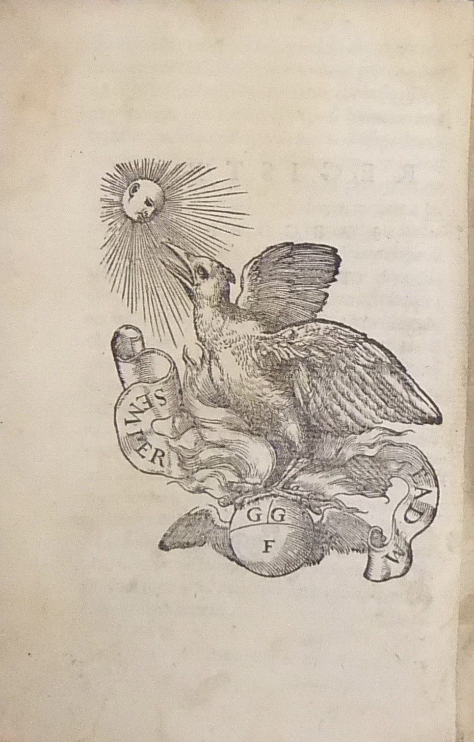 Rara edizione. Pregevole marca tipografica con Fenice su globo con iniziali "GGF" e motto: "Semper eadem" xilografata al frontespizio, capilettera incisi.