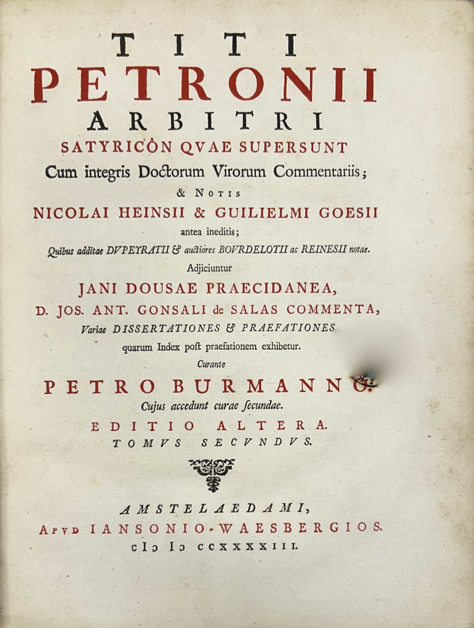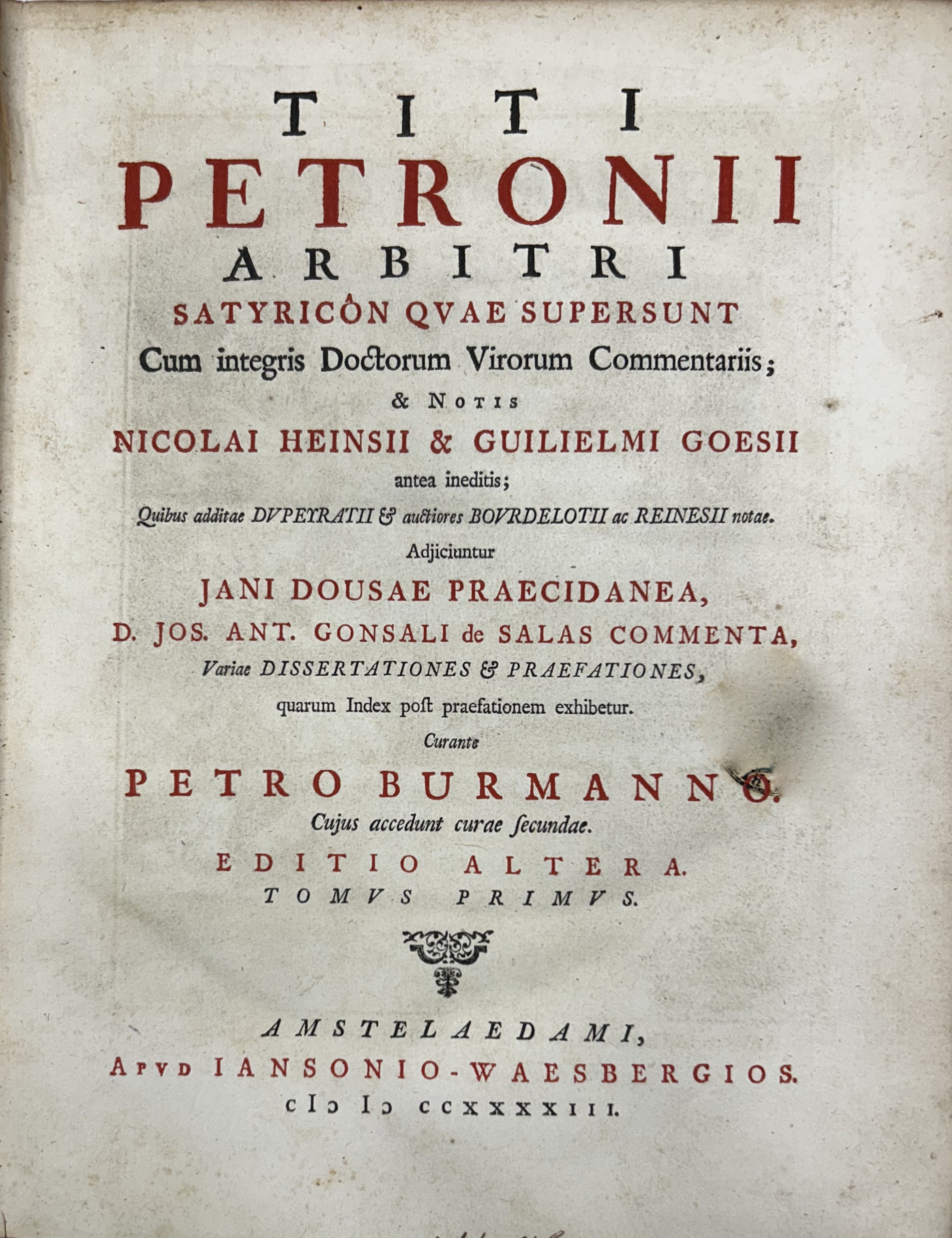 Titi Petronii Arbitri Satyricon quae suipersunt cum integris Doctorum Virorum Commentariis; & notis Nicolai Hensii & Guilielmi Goesii... Curante Petro Burmanno