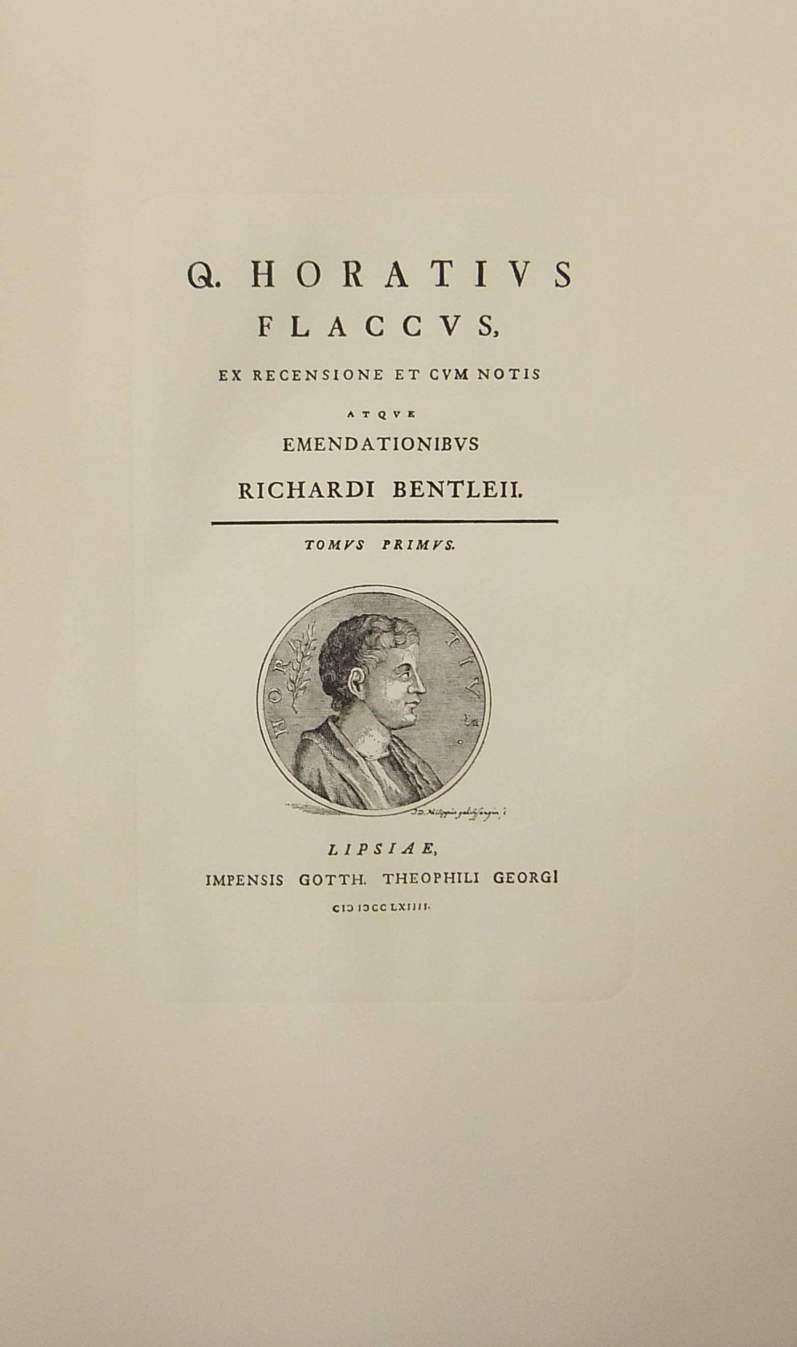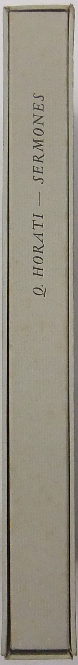 Bella edizione di lusso per il bimillenario della morte di Orazio. Stampata a mano su carta forte in tiratura limitata di 470 esemplari. La tavola fuori testo riproduce il frontespizio della edizione di Lipsia 1764 con il medaglione ritratto del poeta