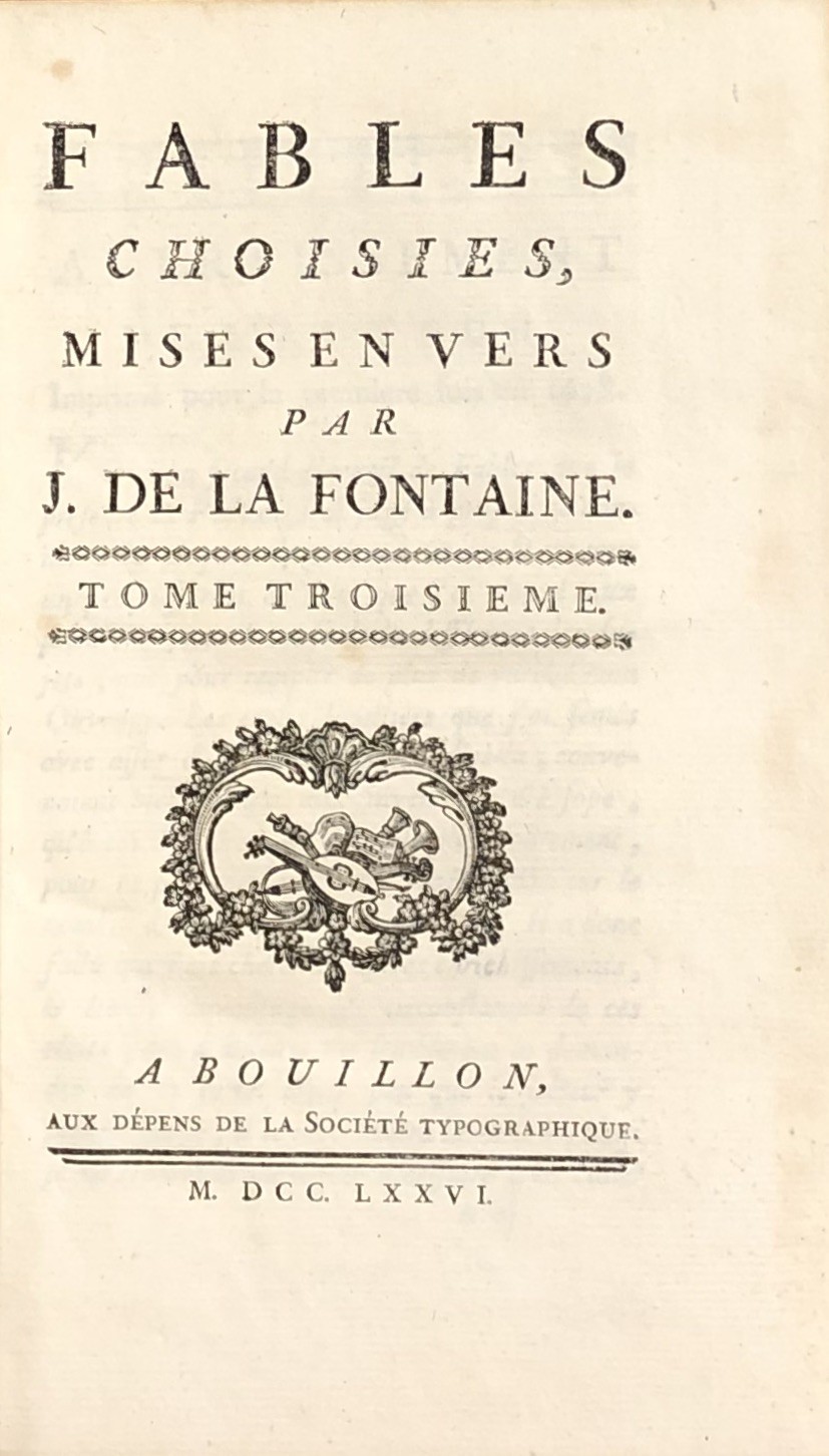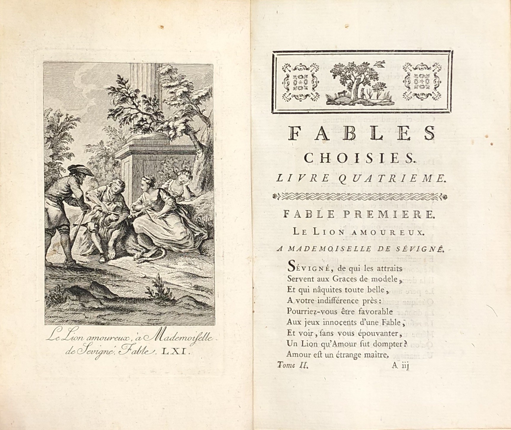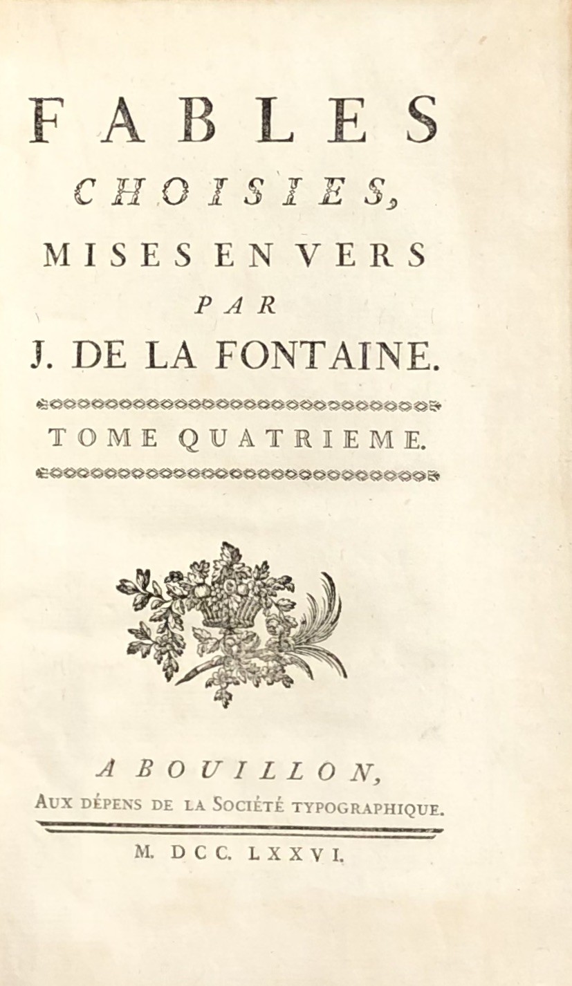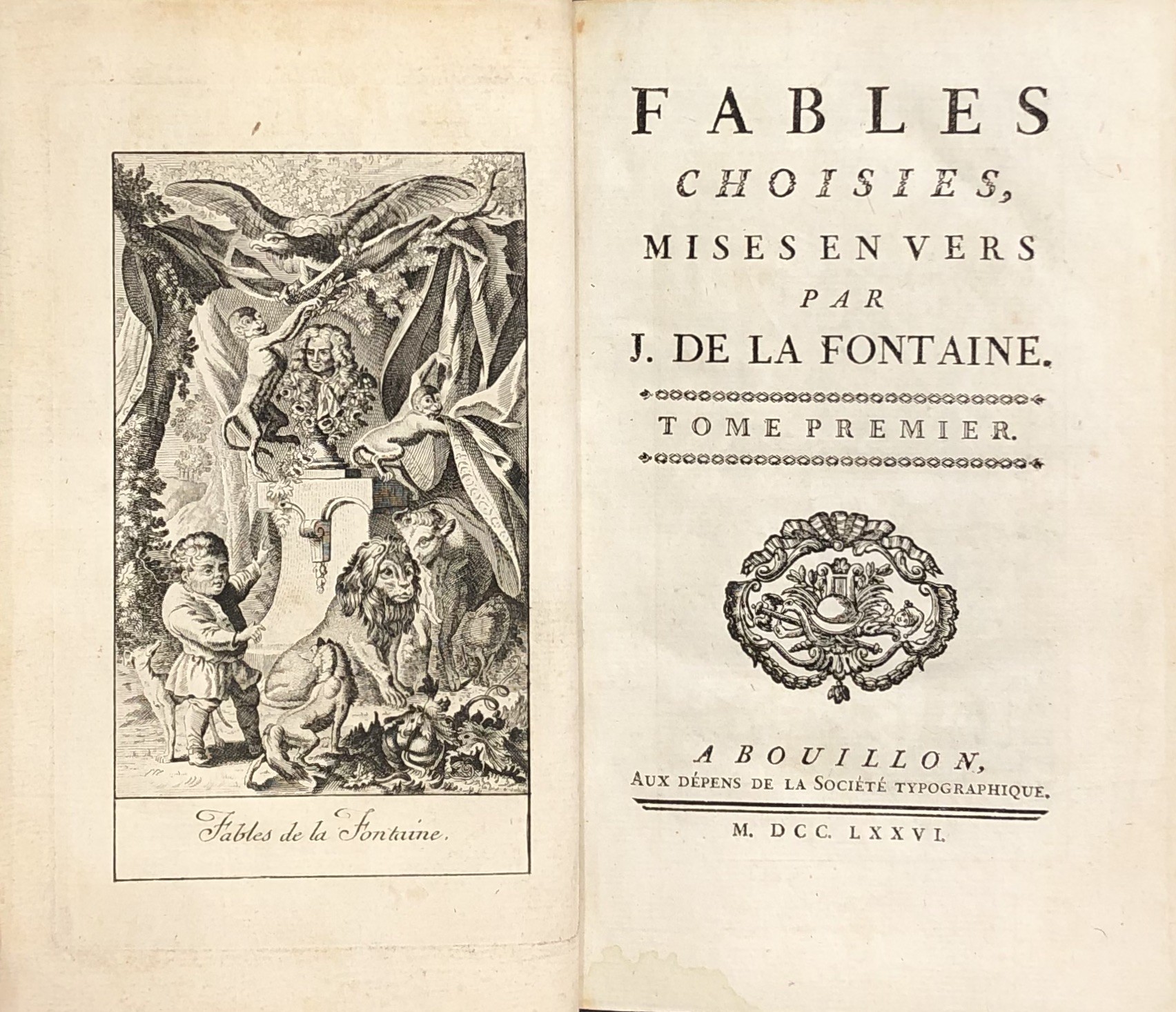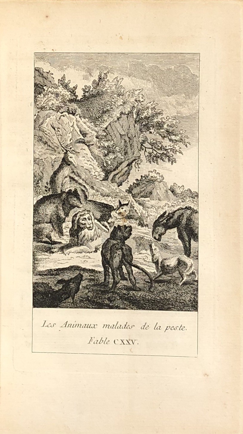 Opera completa con antiporta figurata al primo volume e altre 249 incisioni fuori testo in rame finemente incise. Pregiata edizione settecentesca impreziosita dall'ampia iconografia basata su figure di Oudry, Alard, Bertin, Crescent, Savart ed altri