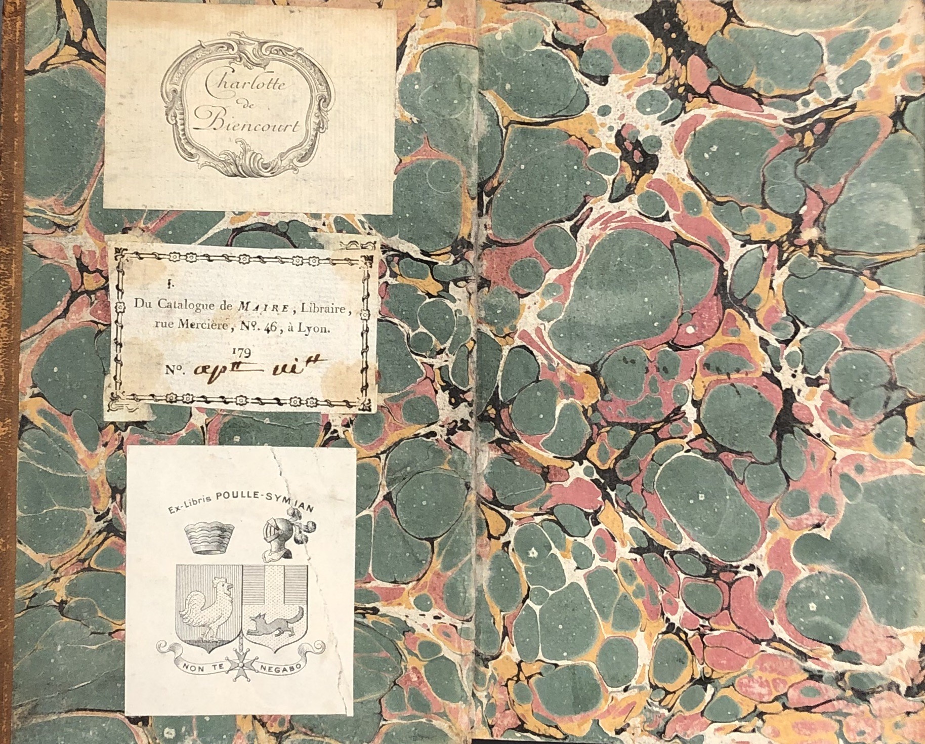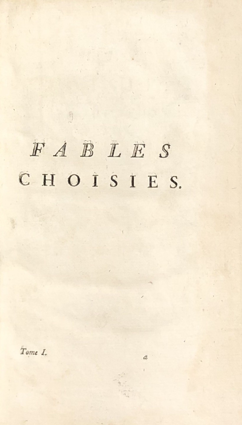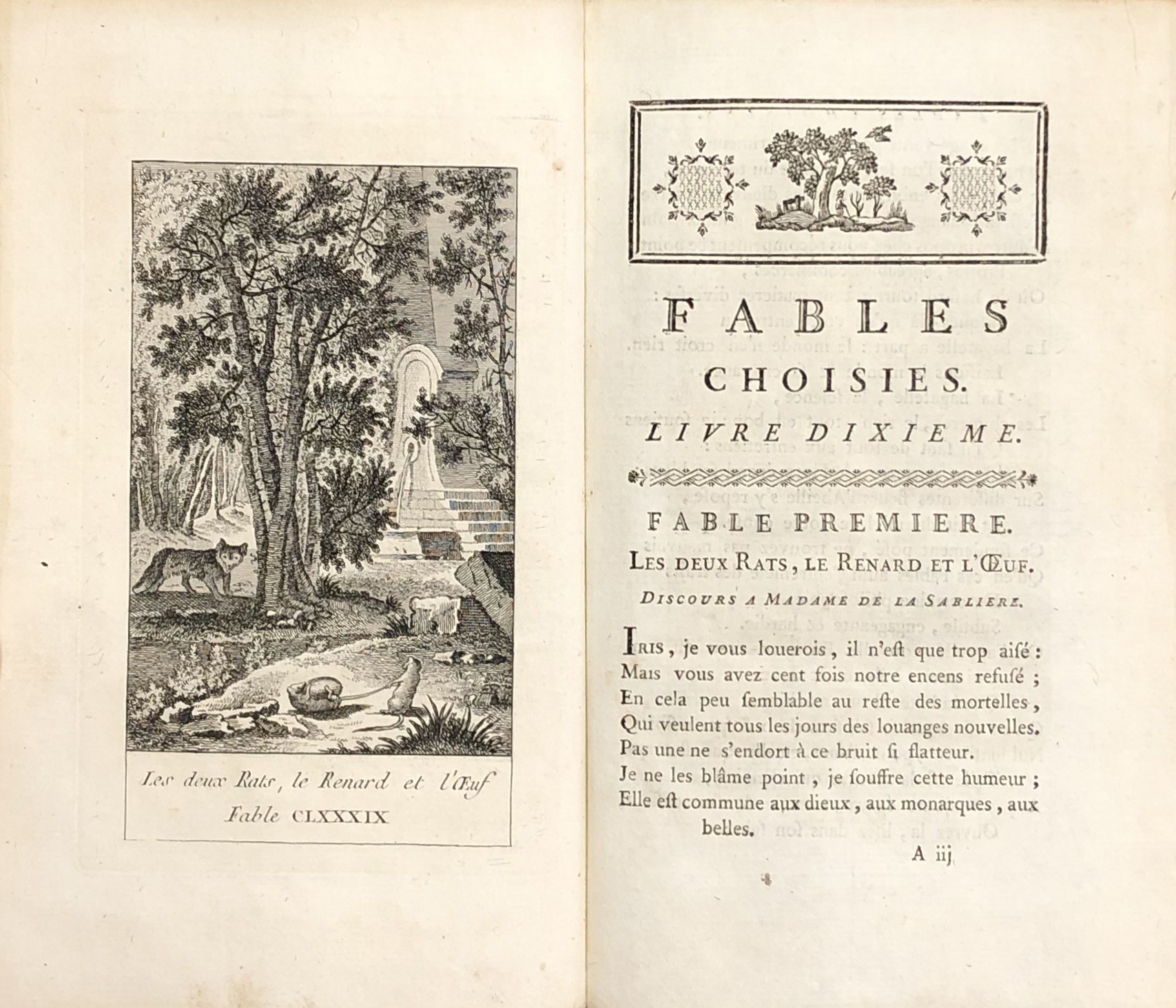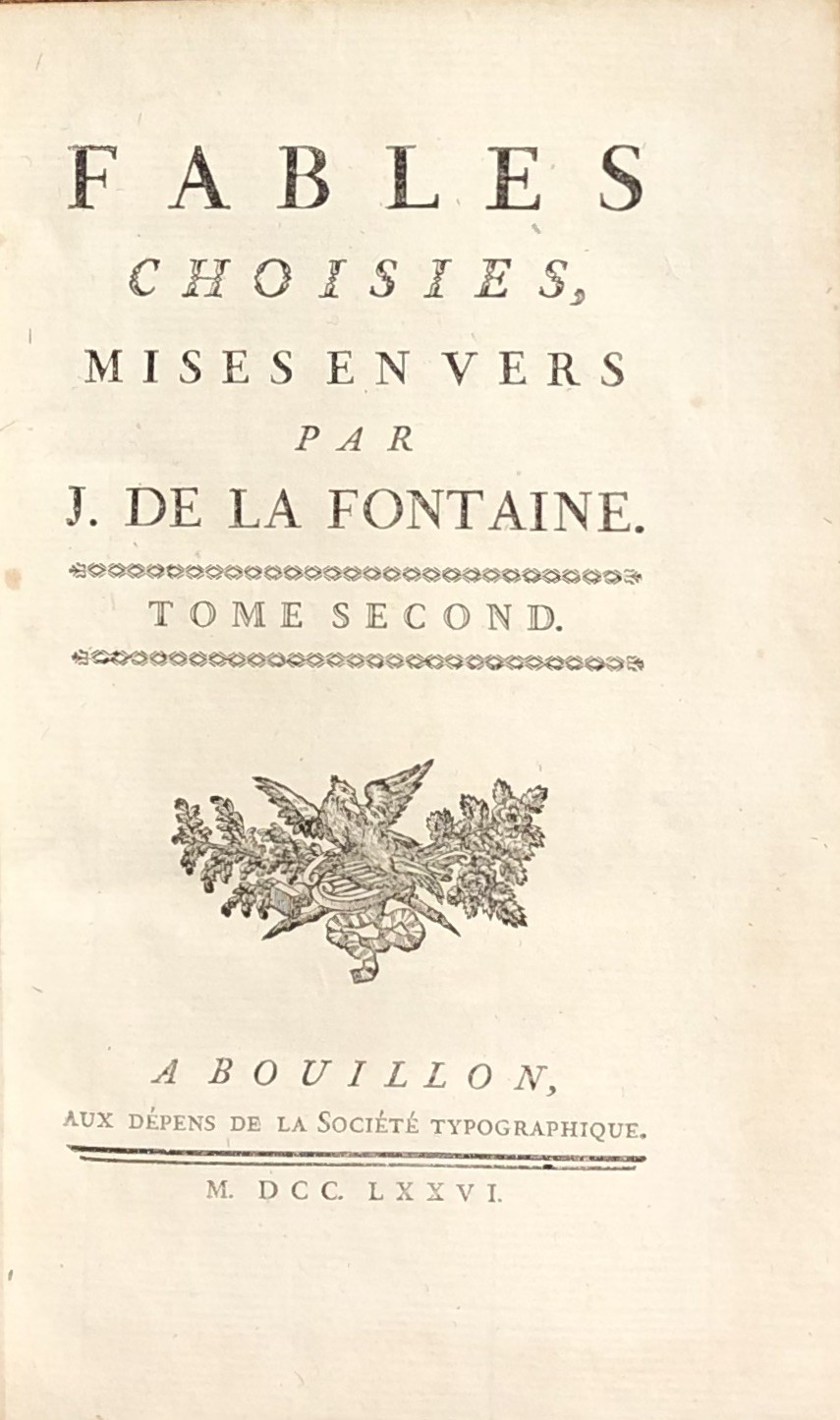Opera completa con antiporta figurata al primo volume e altre 249 incisioni fuori testo in rame finemente incise. Pregiata edizione settecentesca impreziosita dall'ampia iconografia basata su figure di Oudry, Alard, Bertin, Crescent, Savart ed altri