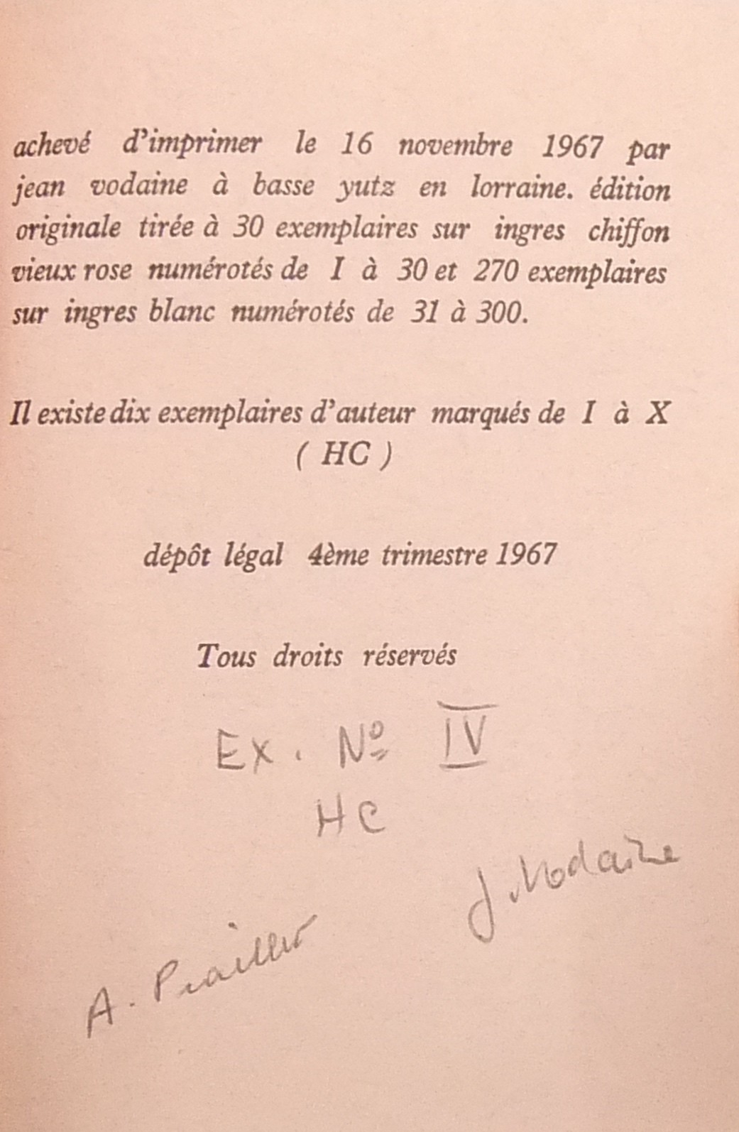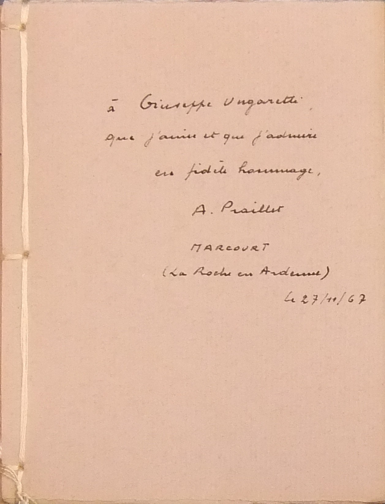 Nostro esemplare su carta rosa, numero IV delle 10 copie d\'auteur, con bella e lunga dedica dell\'Autore al Maestro Giuseppe Ungaretti. Intonso