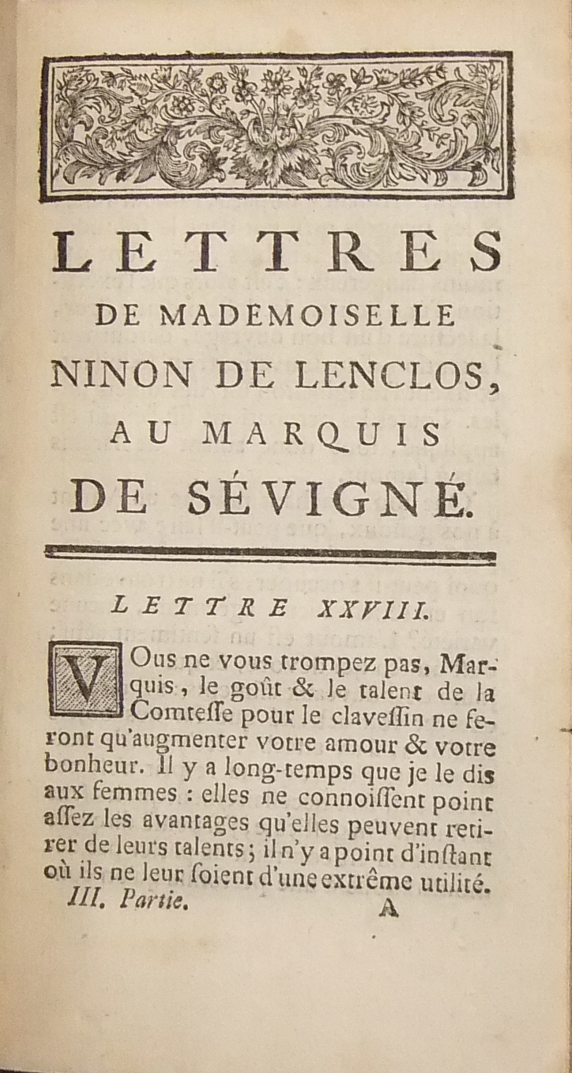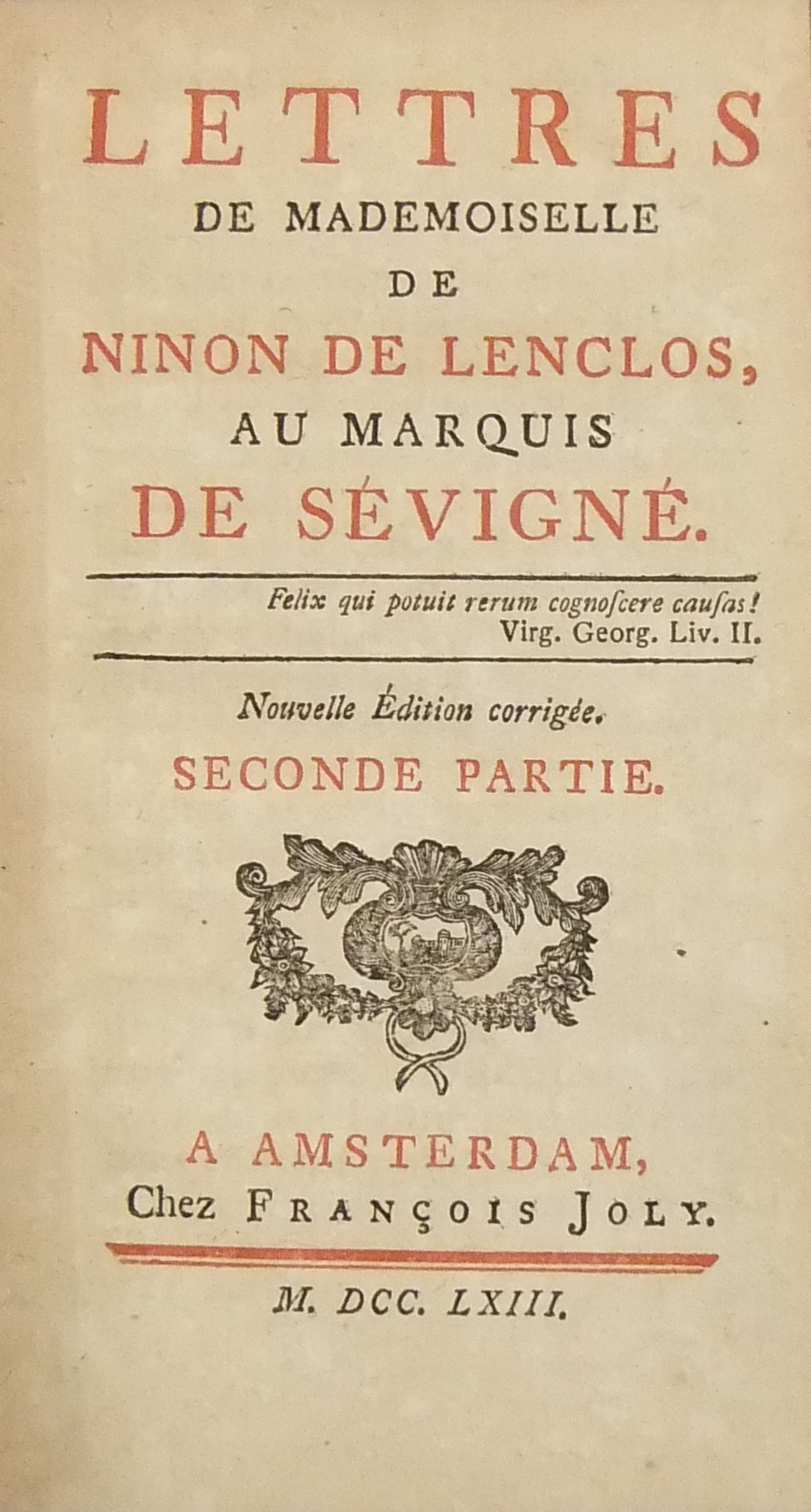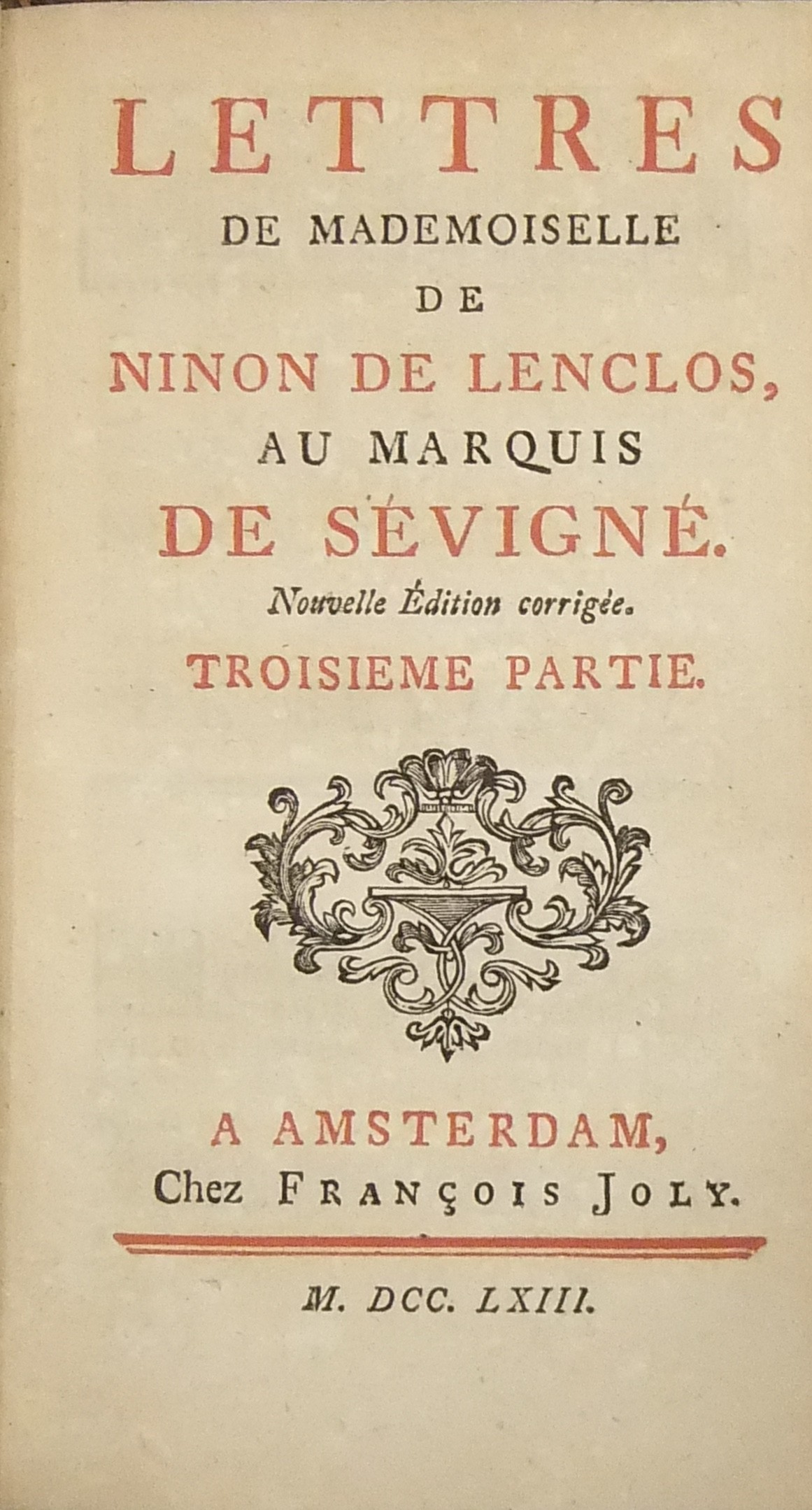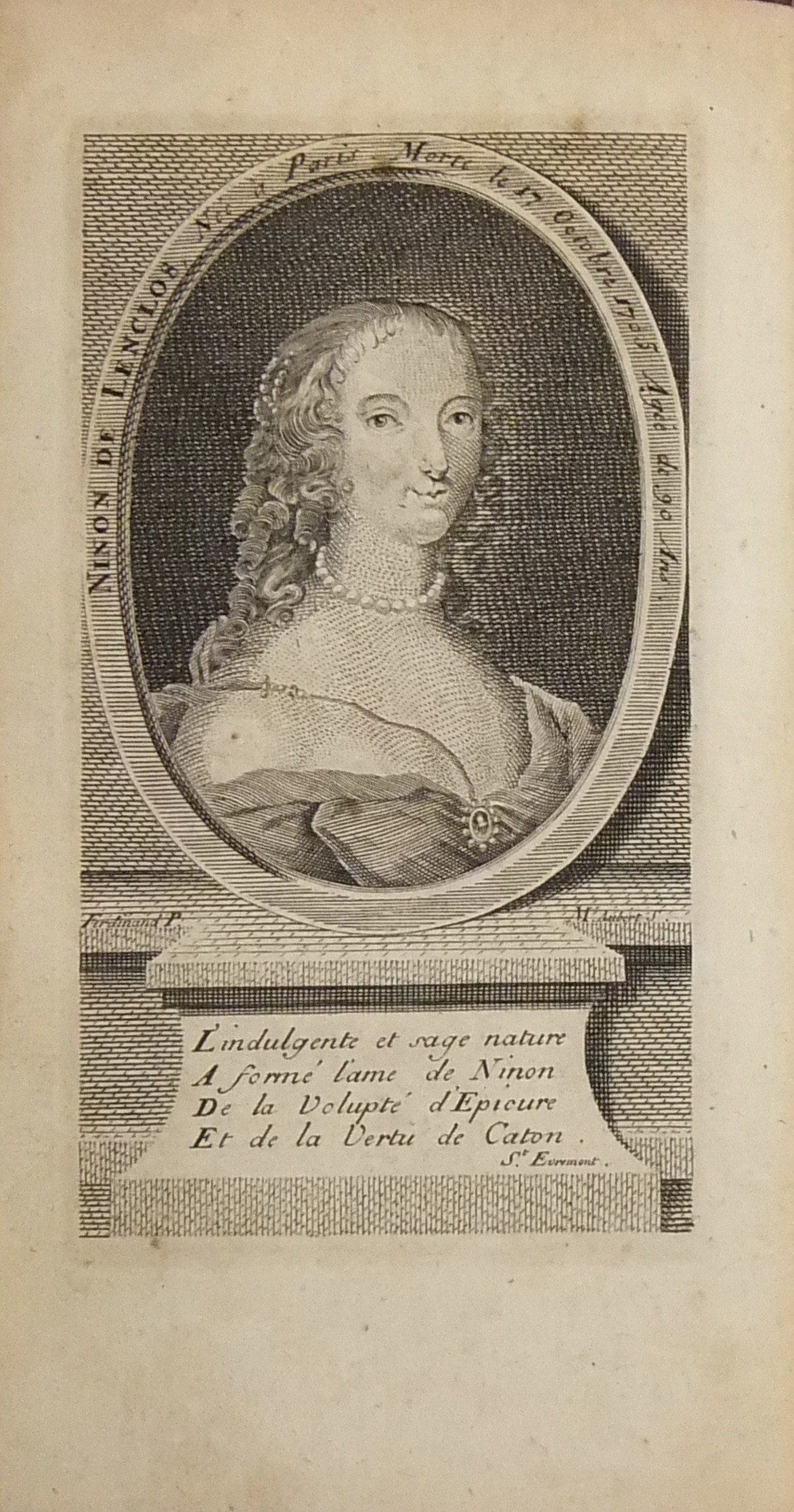 Frontespizi bicromatici. Ritratto di Ninon de Lenclos a inizio opera, belle marche tipografiche incise