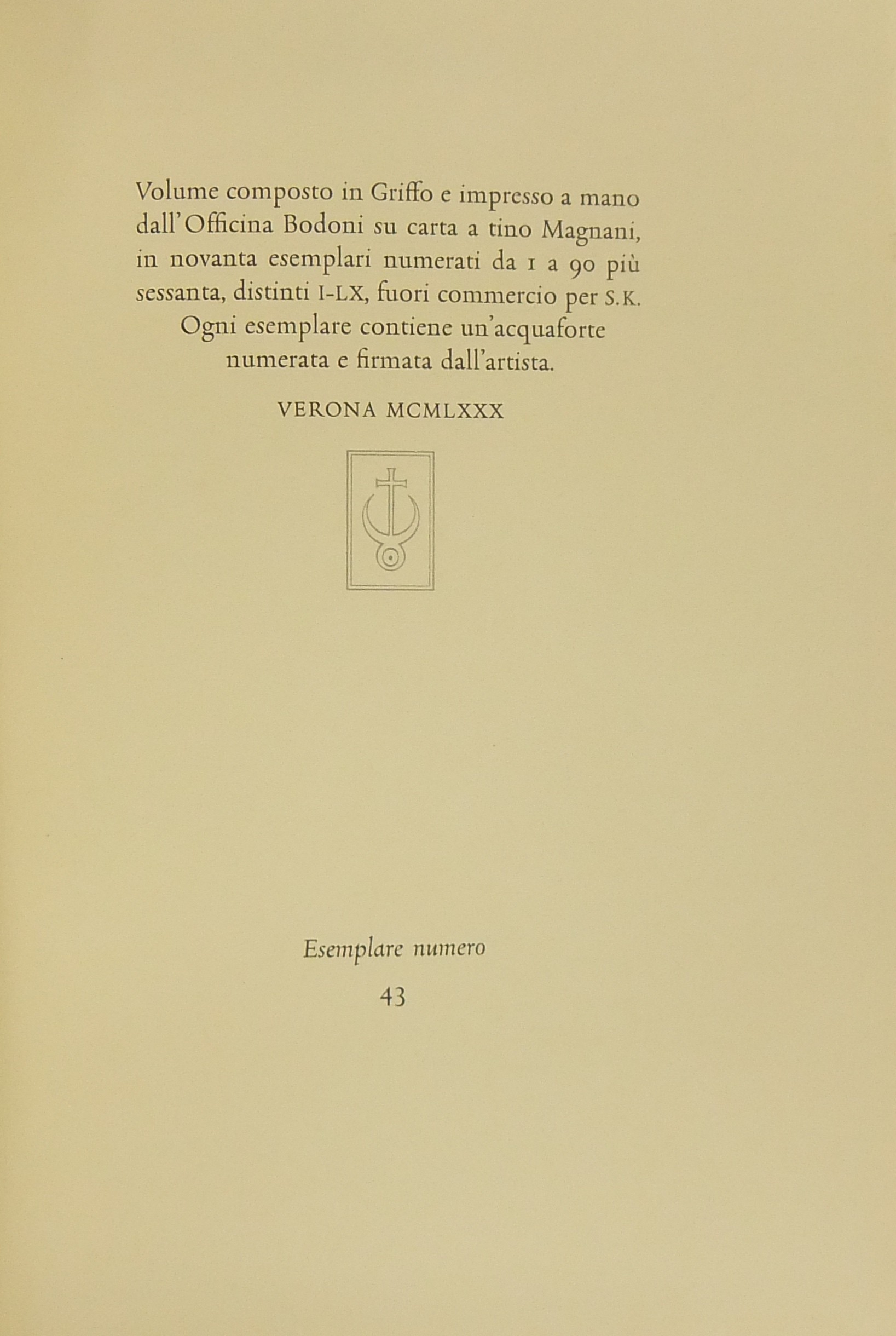 Volume composto con carattere in Griffo e impresso a mano su carta a tino Magnani dall’Officina Bodoni di Martino Mardersteig in novanta esemplari numerati e sessanta in lettere. Completo di acquaforte di Attardi numerata e firmata. Taglio superiore oro. Testo bilingua tedesco e italiano tradotto in versi da Enzo Mandruzzato.