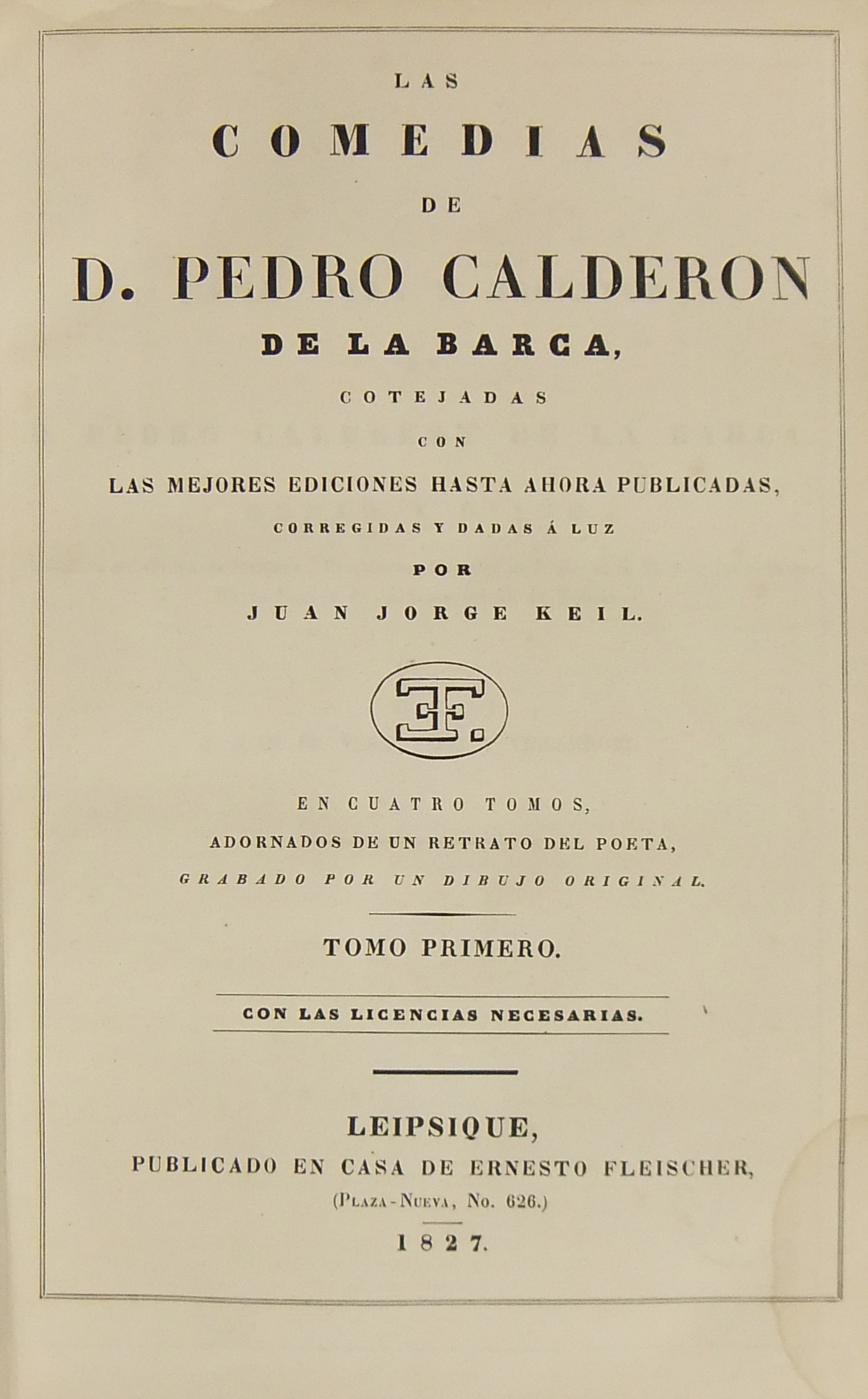 Las comedias de D. Pedro Calderon de la Barca cotejadas con las mejores ediciones hasta ahora publicadas corregidas y dadas à luz. En cuatro tomos adornados de un retrato del poeta grabado por un dibujo original.