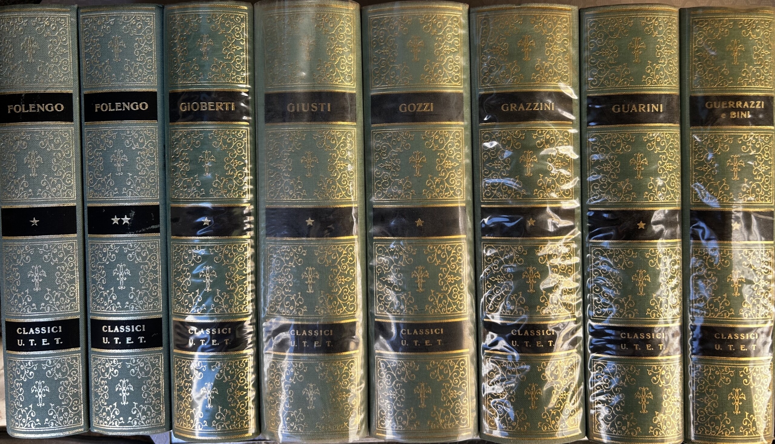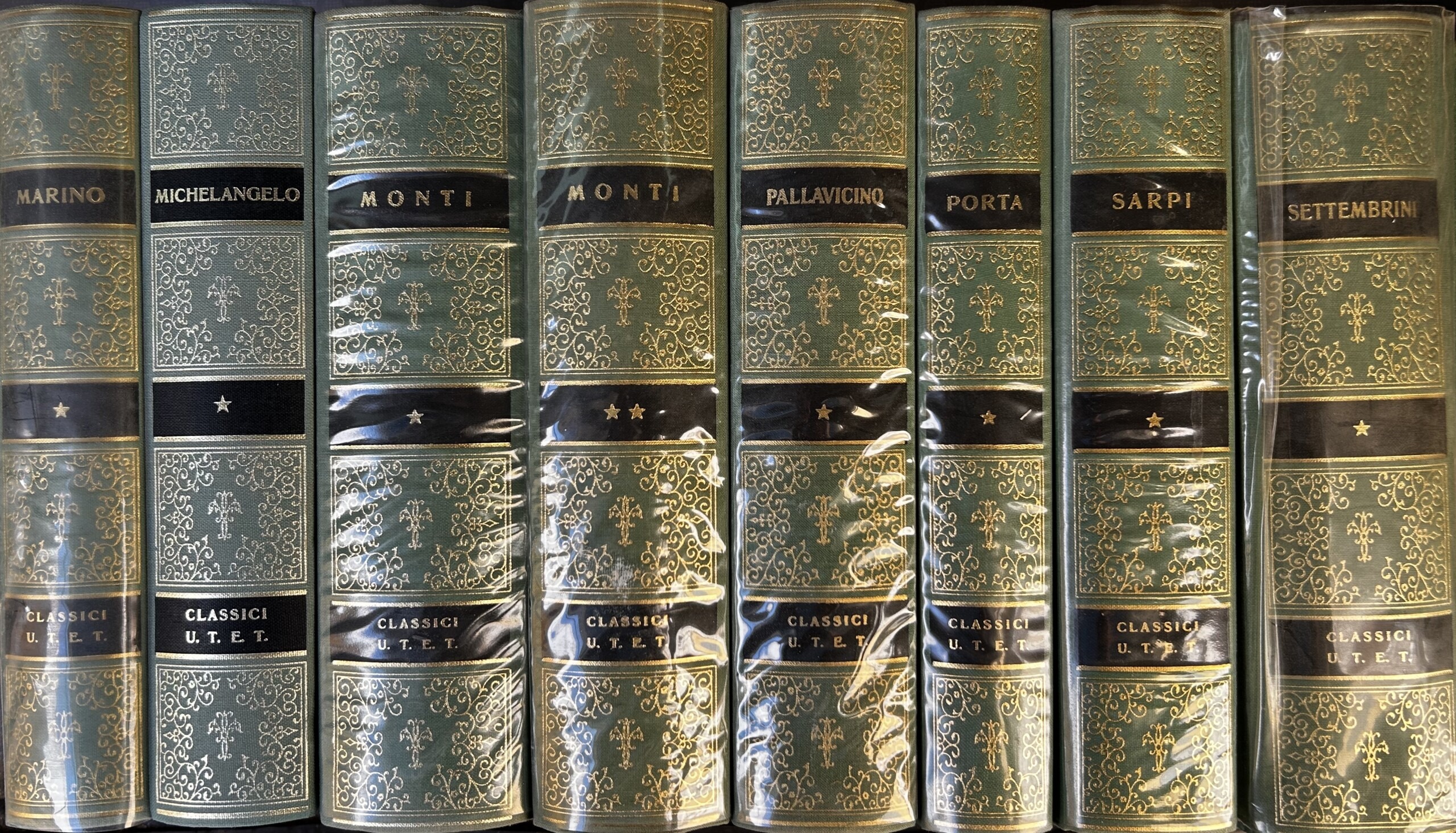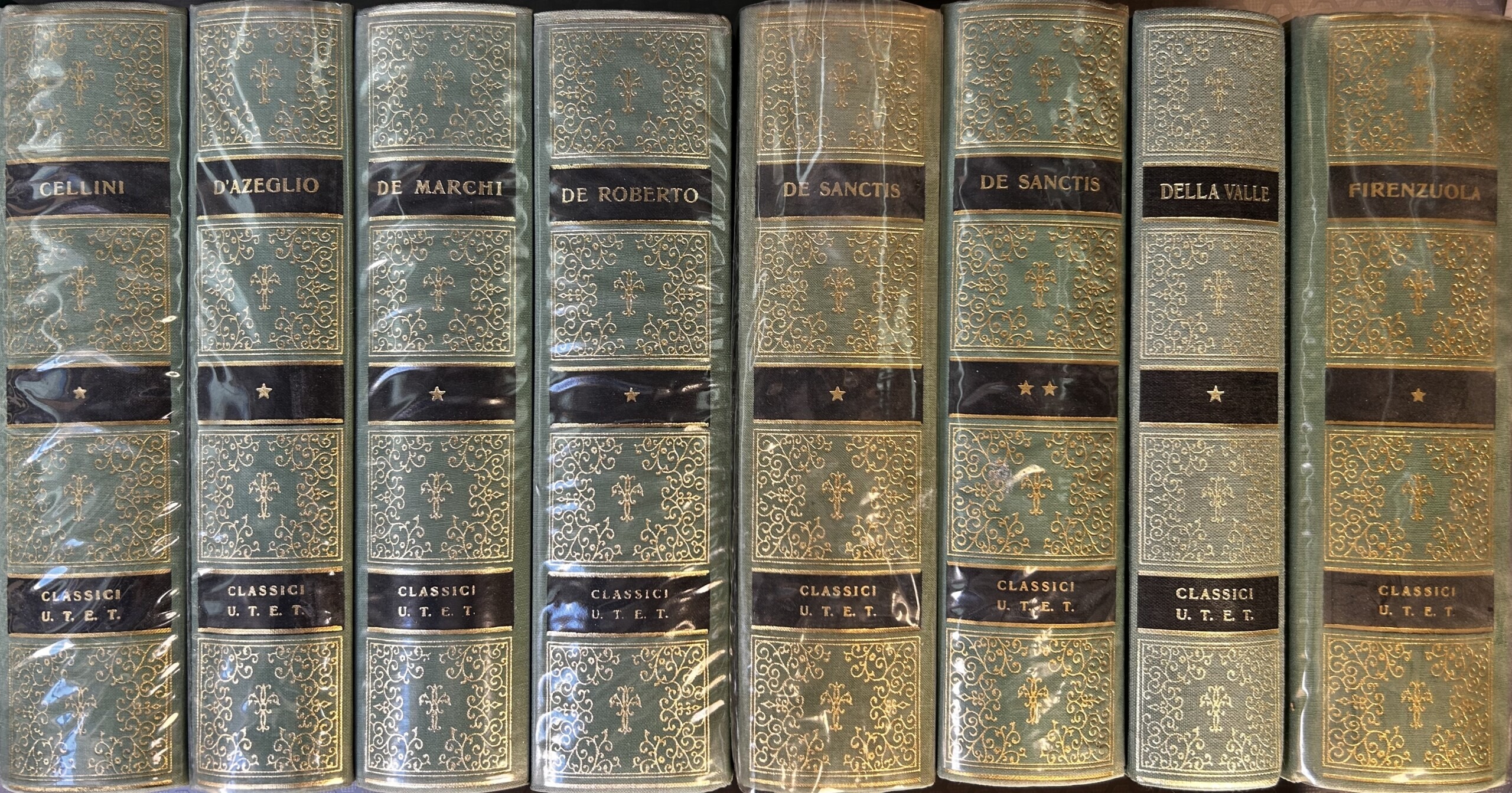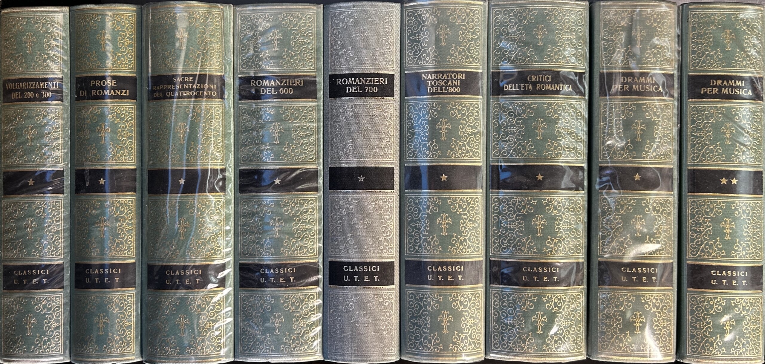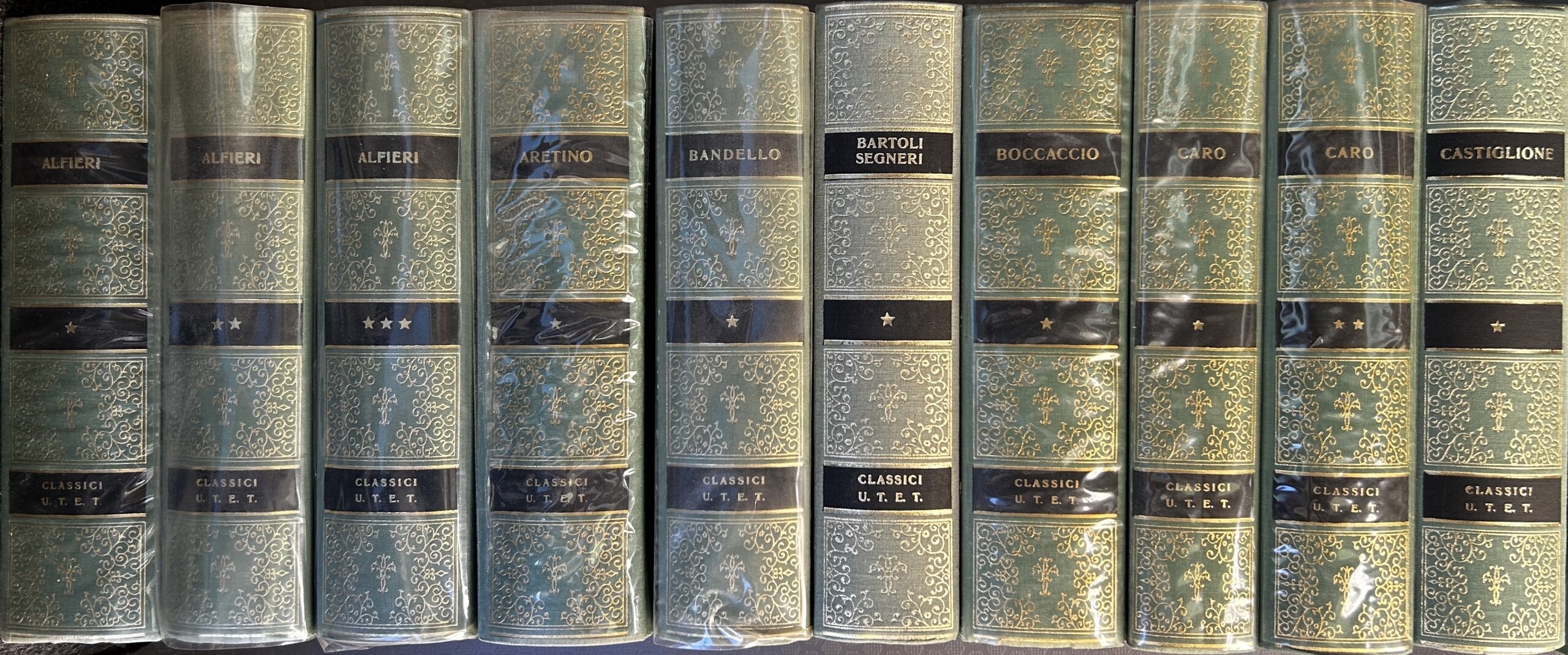Classici Utet. Alfieri, Aretino, Bandello, Bartoli Segneri, Boccaccio, Caro, Castiglione, Cellini, D'Azeglio, De Marchi, De Roberto, De Sanctis, Della Valle, Firenzuola, Folengo, Gioberti, Giusti, Gozzi, Grazzini, Guarini, Guerrazzi e Bini, Marino, Michelangelo, Monti, Pallavicino, Porta, Sarpi, Settembrini, Volgarizzamenti del 200 e 300, Prose di romanzi, Sacre rappresentazioni del 400, Romanzieri del 600, Romanzieri del 700, Narratori toscani del 700, Narratori toscani dell'800, Critici dell'Età Romantica, Drammi per musica