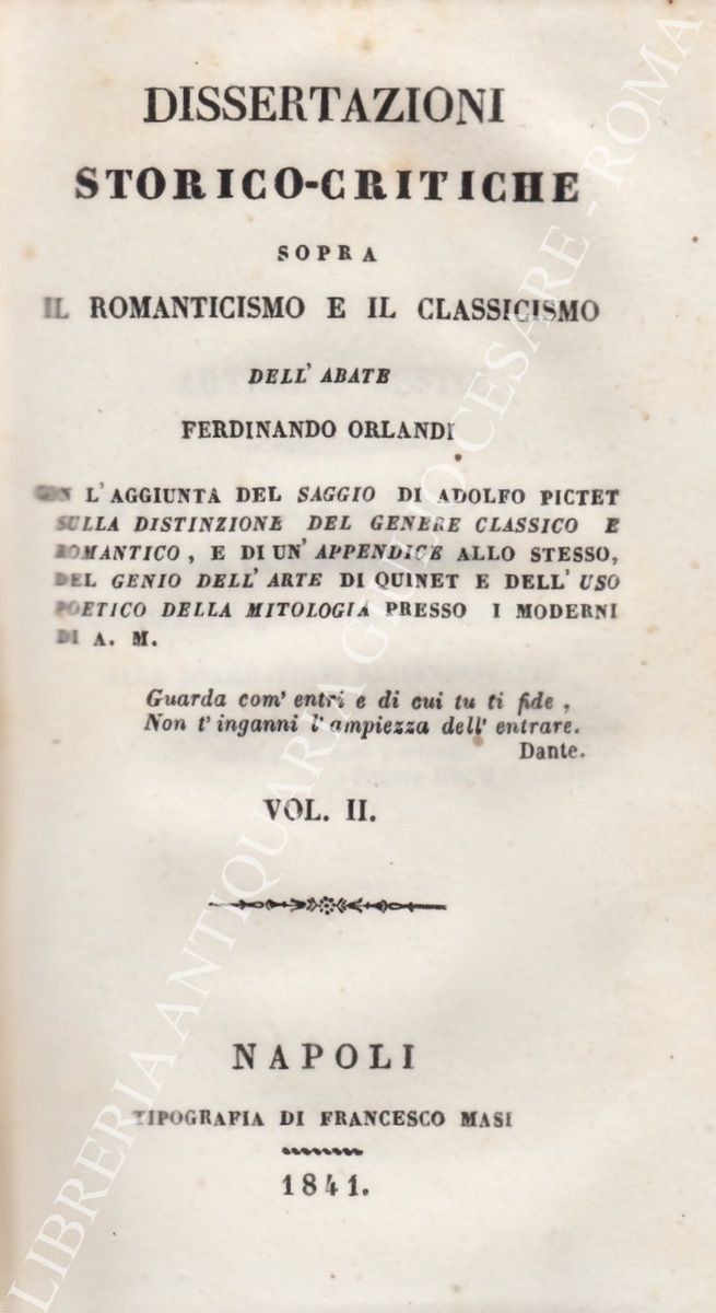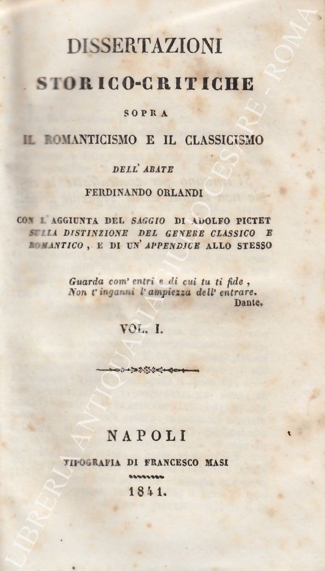 Dissertazioni storico-critiche sopra il romanticismo e il classicismo con l'aggiunta del saggio di Adolfo Pictet sulla distinzione del genere classico e romantico, e di un'appendice allo stesso