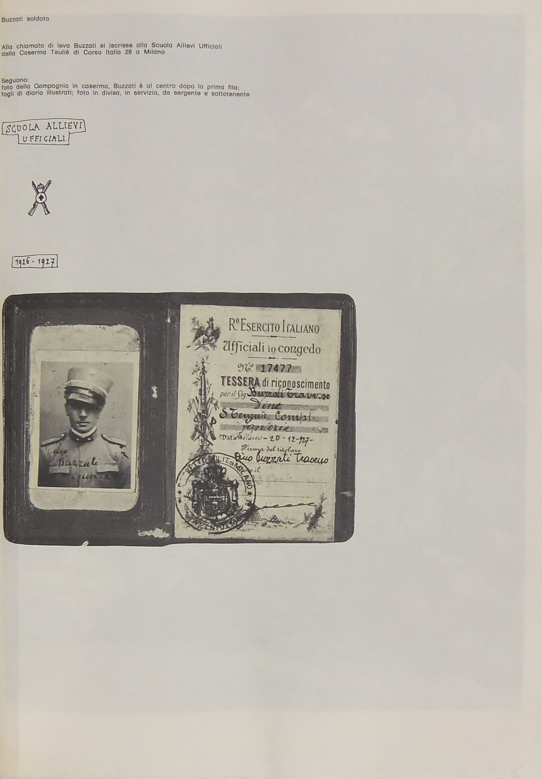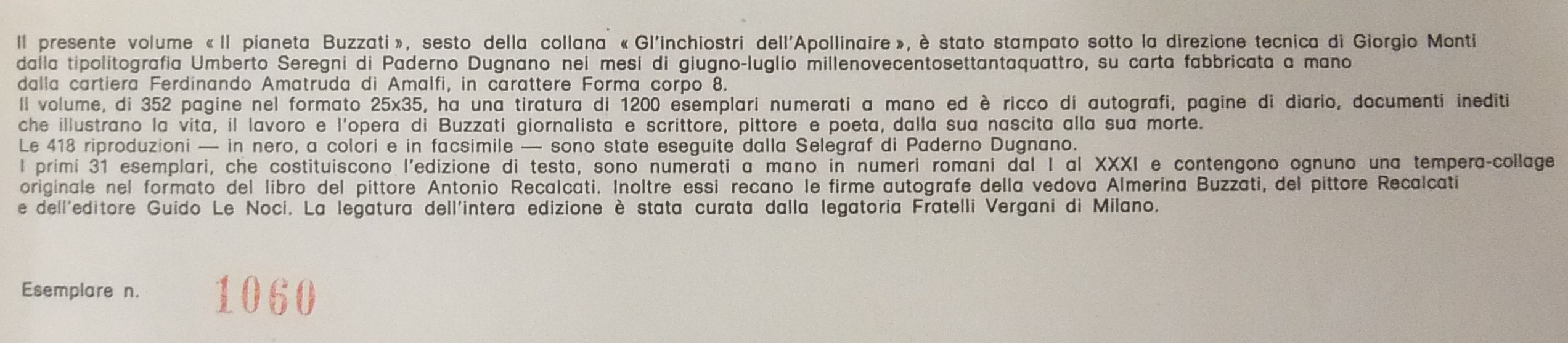 Volume stampato, su carta fabbricata a mano dalla cartiera Ferdinando Amatruda di Amalfi, in carattere Forma corpo 8 in 1200 esemplari numerati a mano. Volume ricco di autografi, pagine di diario, documenti inediti che illustrano la vita, il lavoro e l'opera di Buzzati giornalista e scrittore, pittore e poeta, dalla sua nascita alla sua morte. Ns. esemplare n. 1060