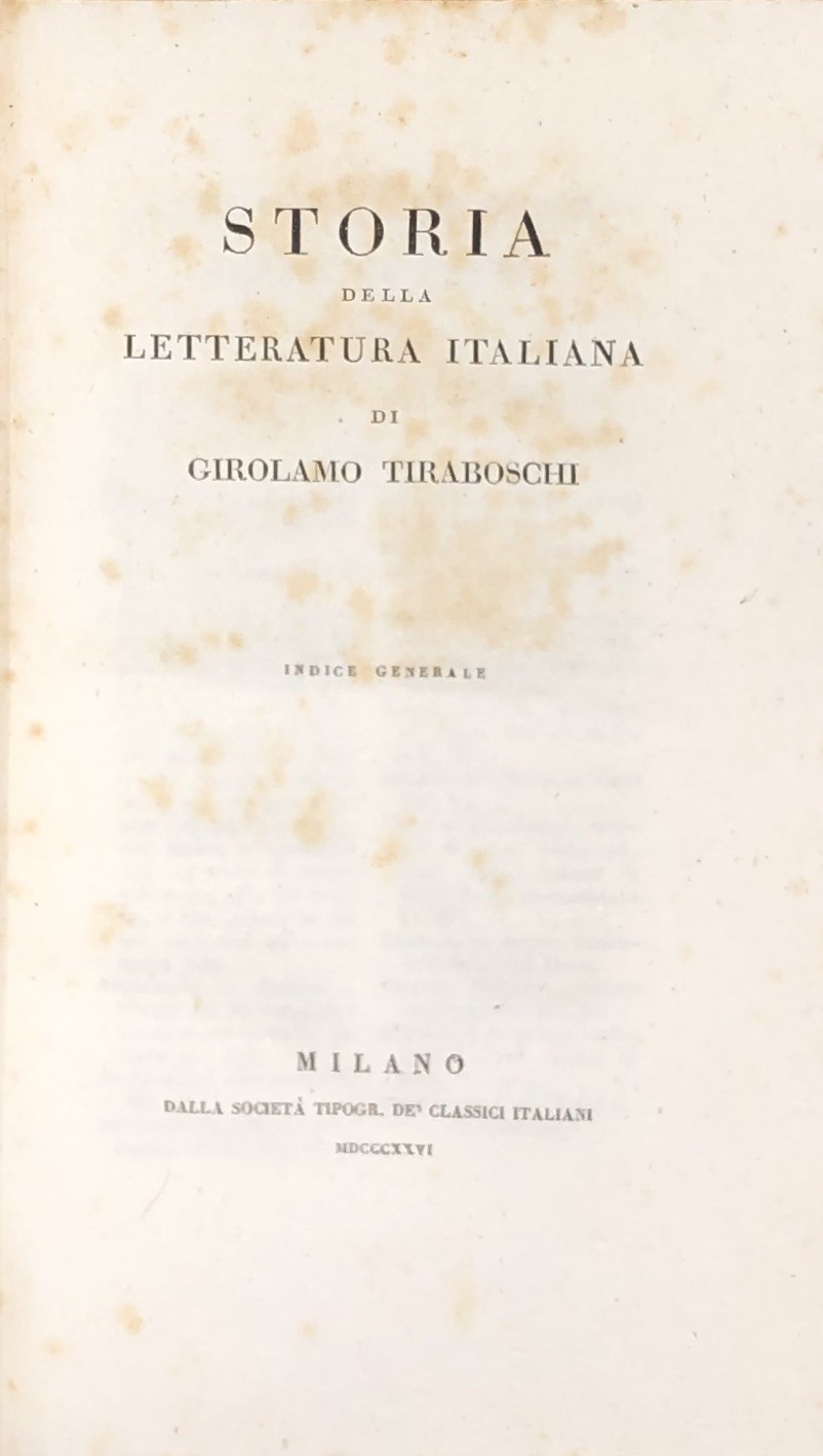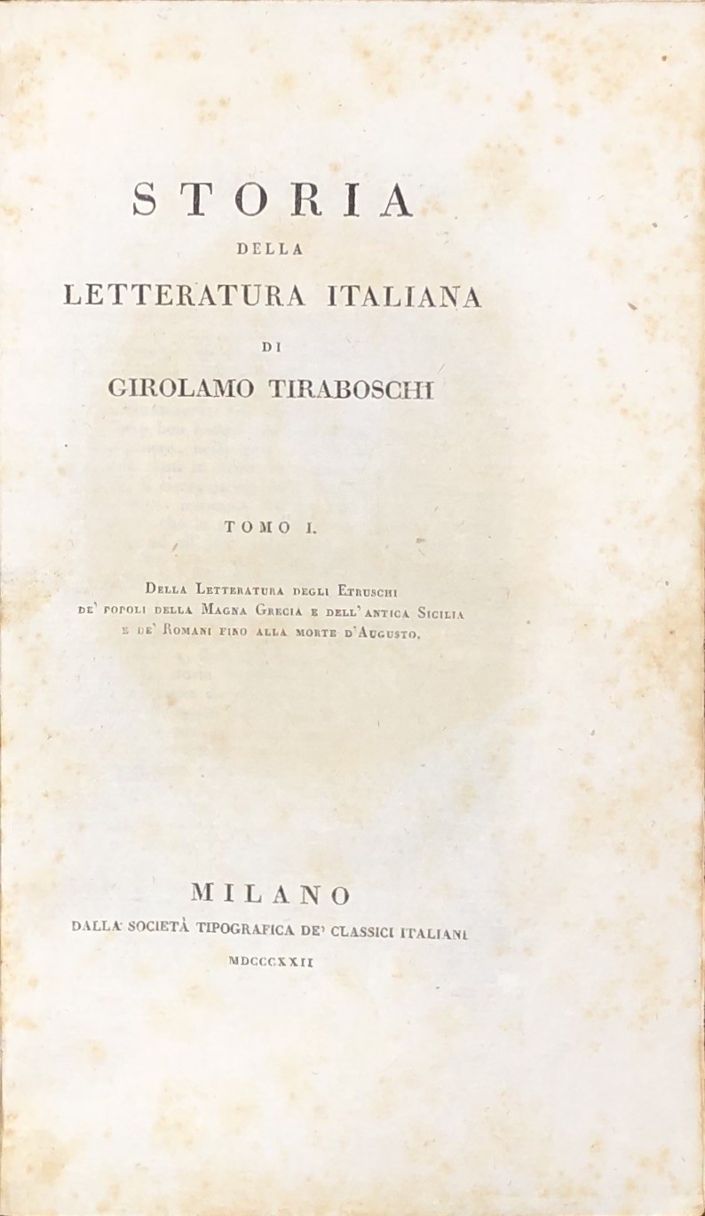 Storia della letteratura italiana. Vol. I - Della letteratura degli Etruschi, de' popoli della Magna Grecia e dell'antica Sicilia e de' Romani fino alla morte di Augusto; Vol. II - Dalla morte di Augusto fino alla caduta dell'Impero Occidentale; Vol. III - Dalla rovina dell'Impero Occidentale fino all'anno 1183; Vol. IV - Dall'anno 1183 fino all'anno 1300; Vol. V,1 e V,2 - Dall'anno 1300 fino all'anno 1400; Vol. VI,1, VI,2 e VI,3 - Dall'anno 1400 fino all'anno 1500; Vol. VII,1, VII,2, VII,3 e VII,4 - Dall'anno 1500 all'anno 1600; Vol. VIII,1 e VIII,2 - Dall'anno 1600 all'anno 1700; Indice generale