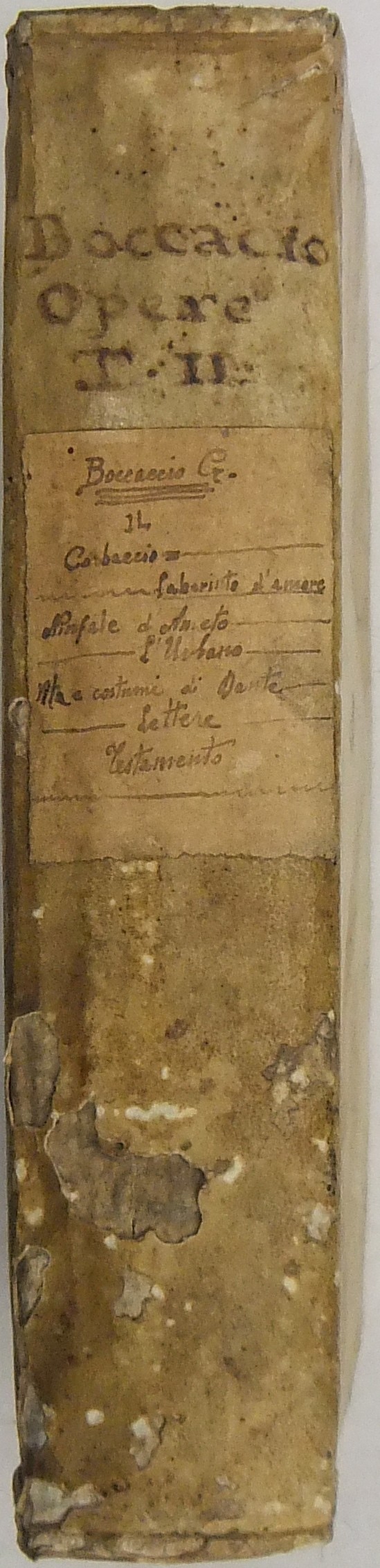 Piccole mancanze di pergamena al dorso, difetto ad una cerniera, frontespizio della Commedia delle Ninfe Fiorentine (Ninfale d\'Ameto) mancante