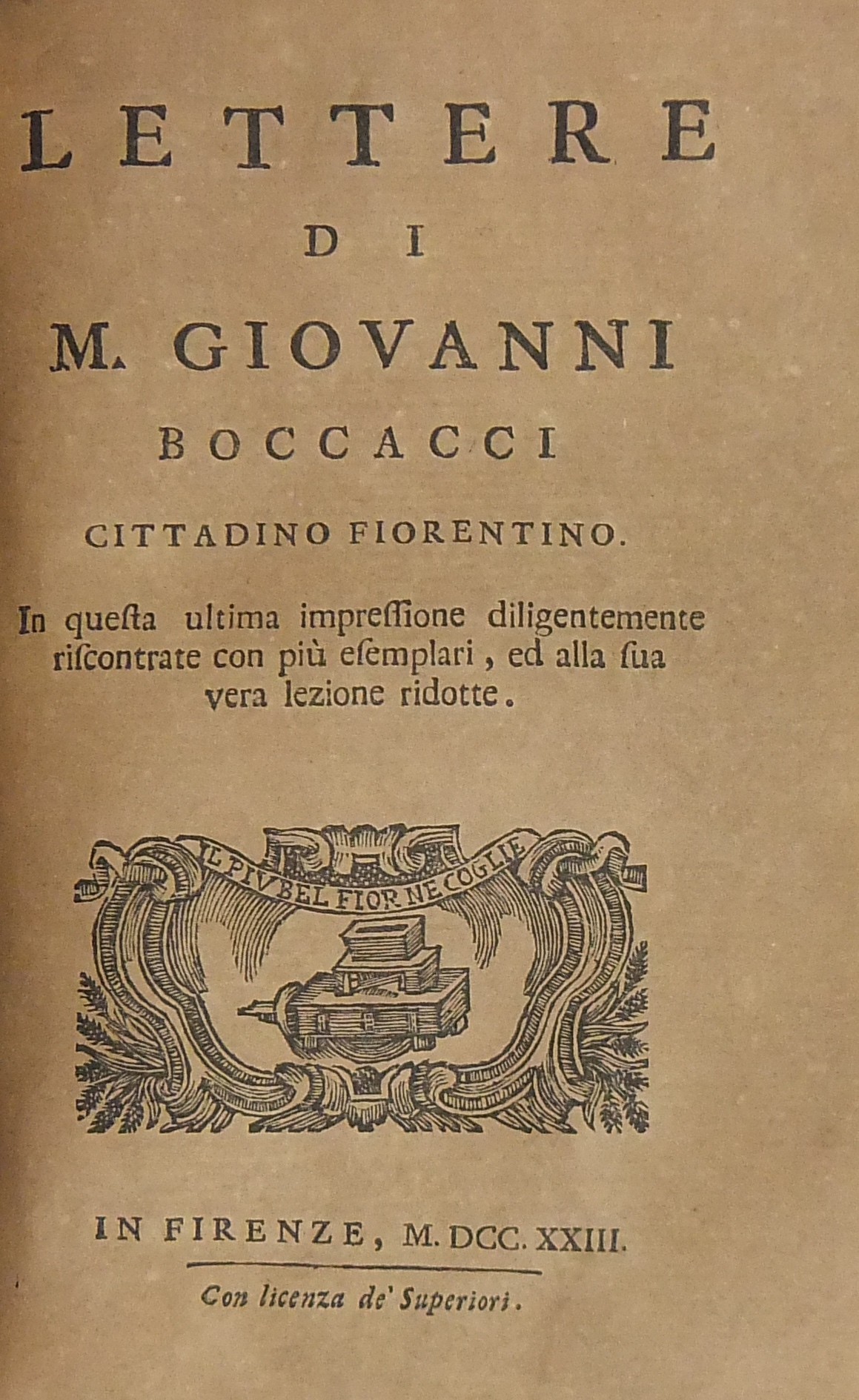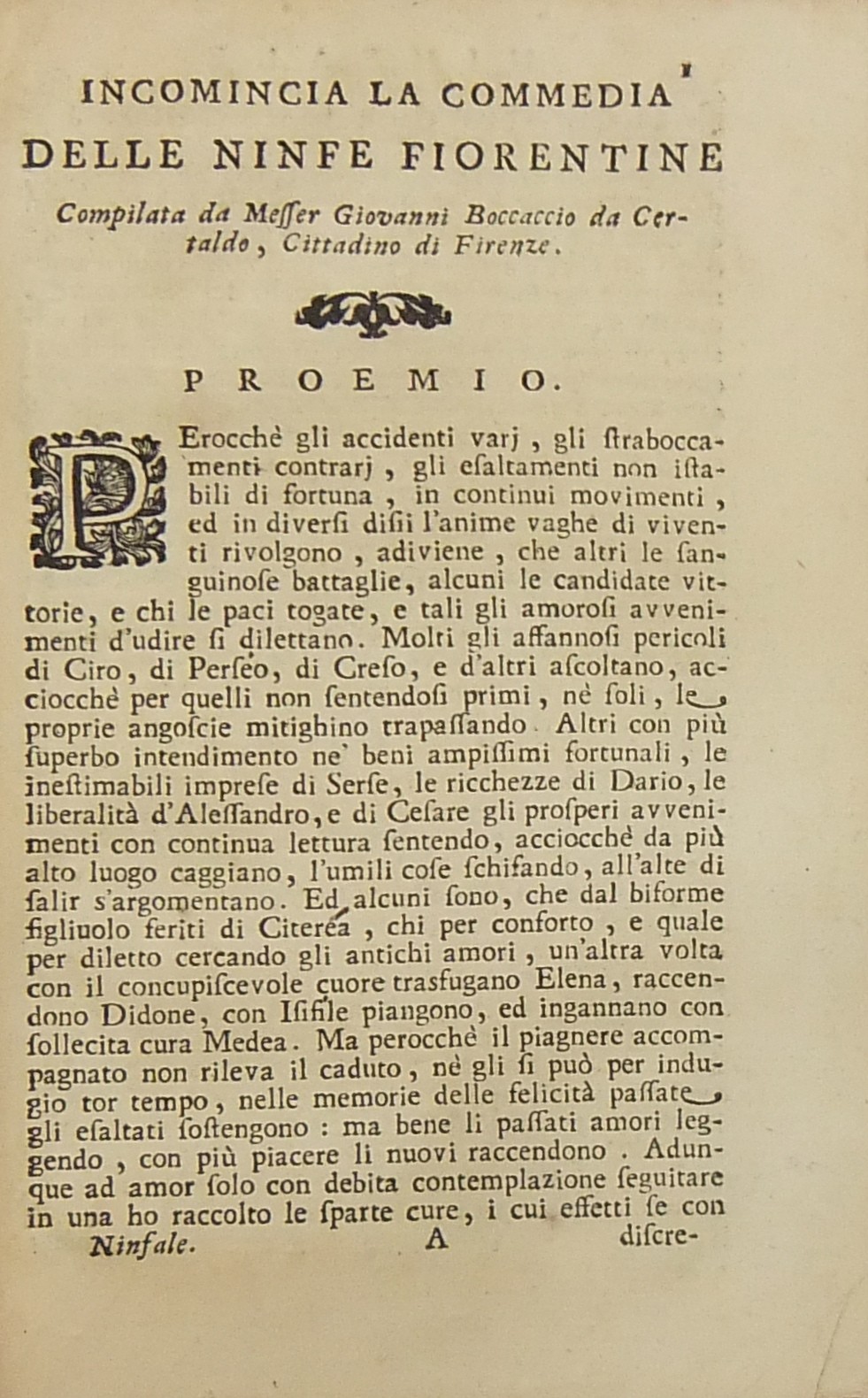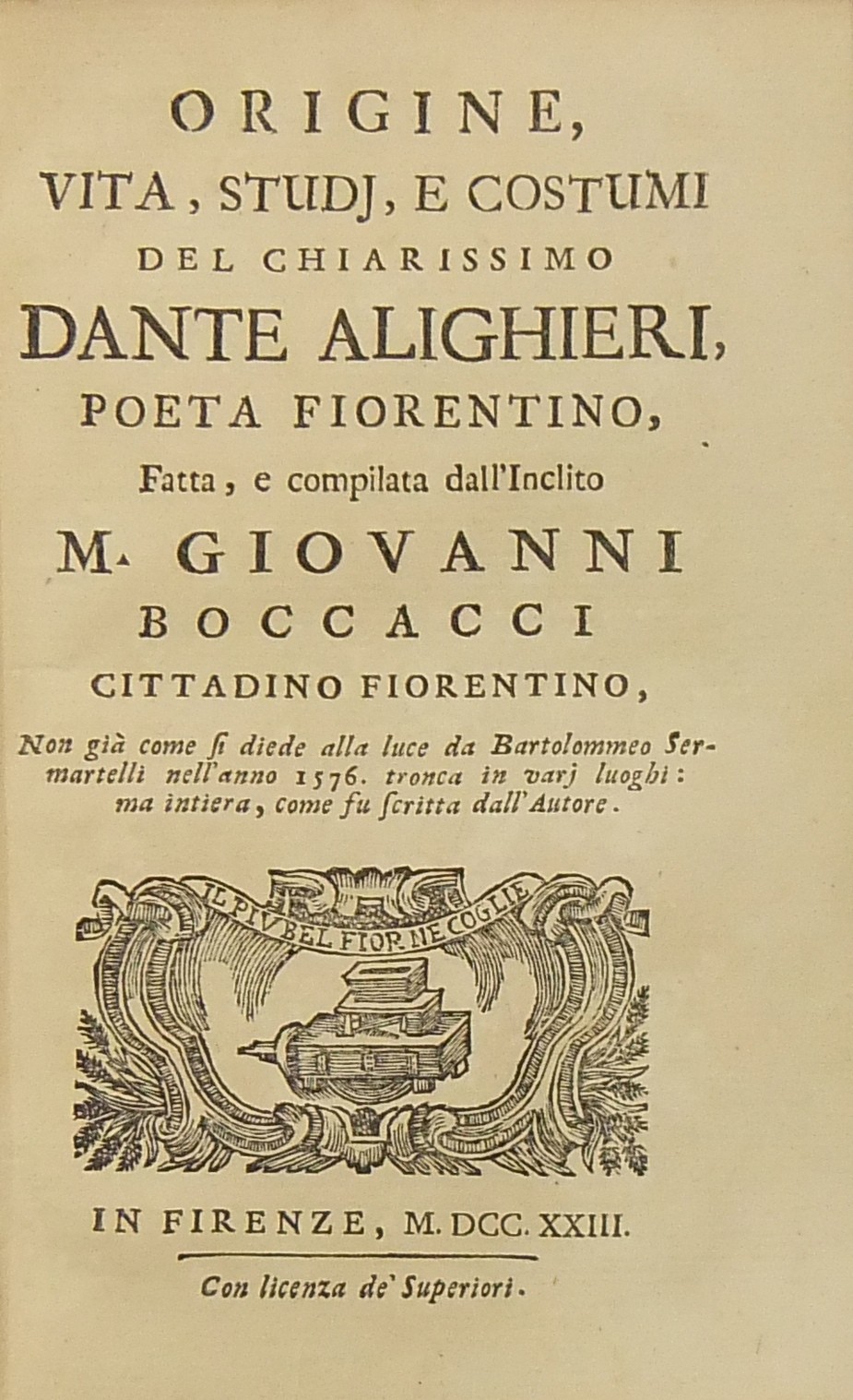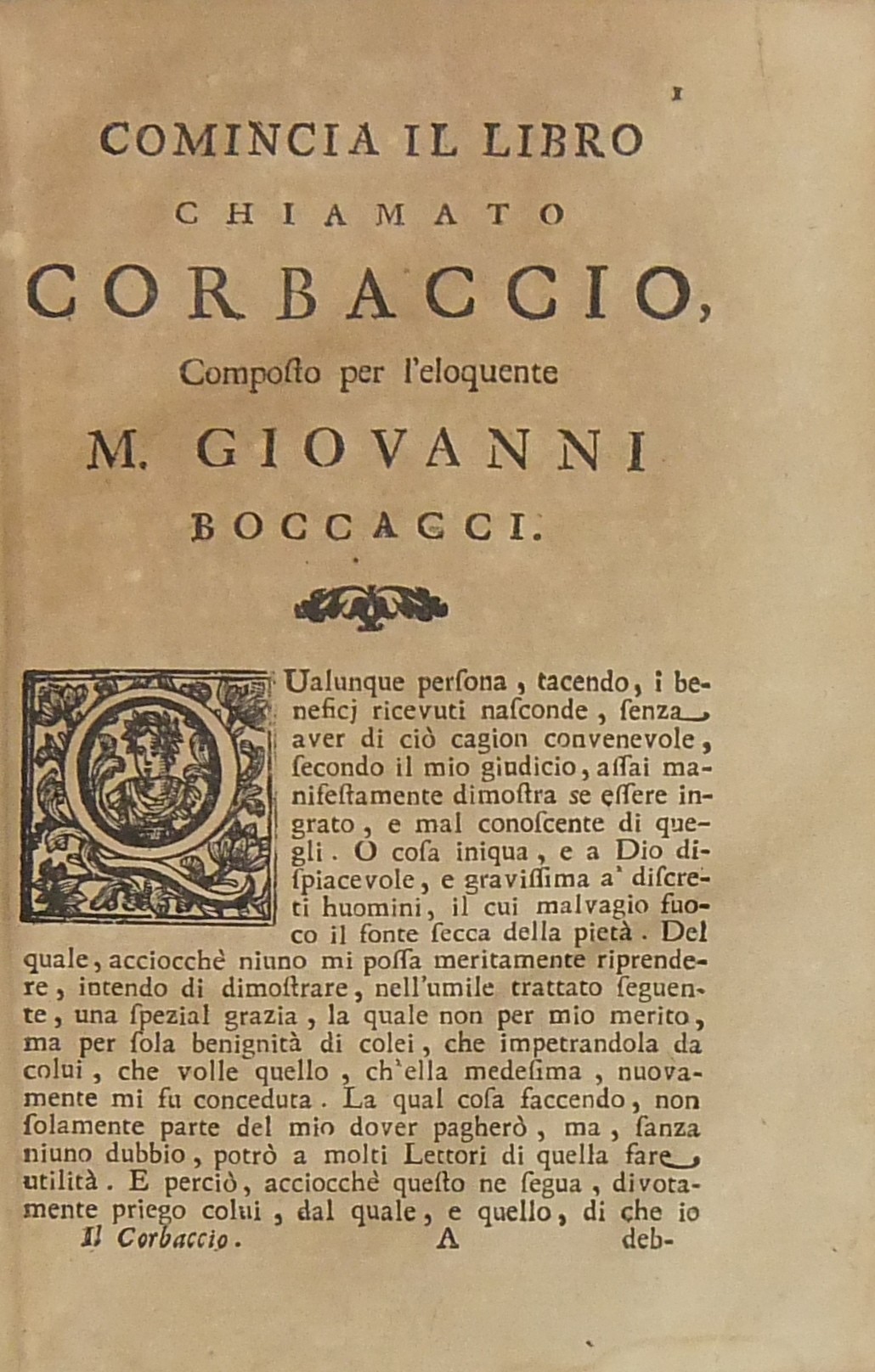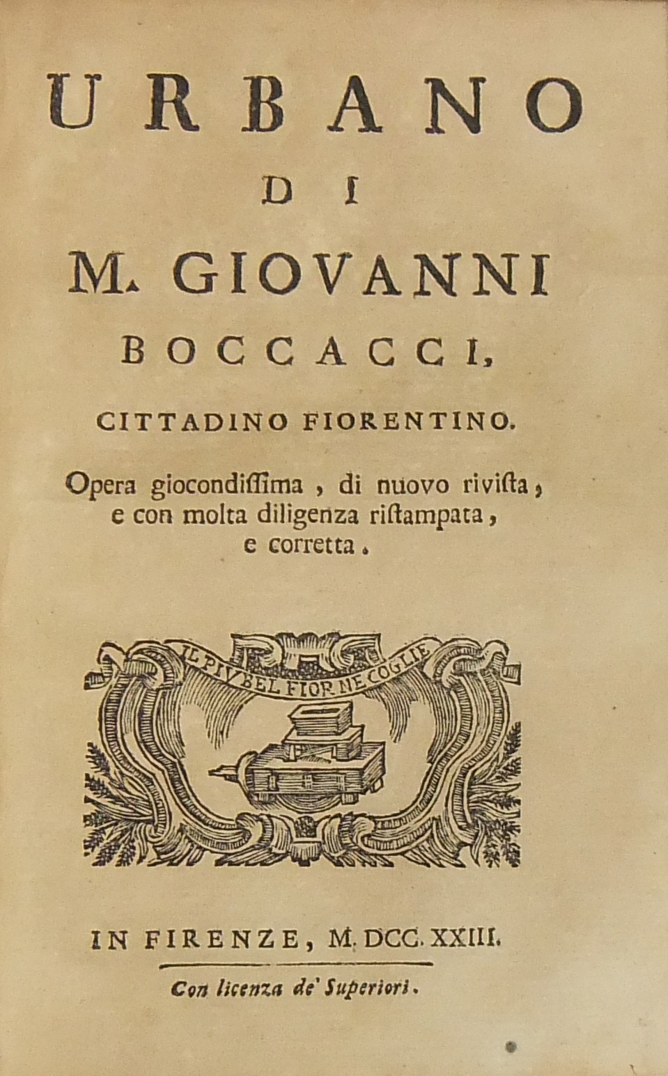 Il Corbaccio di m. Giovanni Boccacci cittadino fiorentino. Novellamente stampato e con riscontri di testi a penna alla sua vera lezione ridotto. UNITO A: Commedia delle Ninfe Fiorentine (Ninfale d'Ameto); UNITO A: Urbano di m. Giovanni Boccacci cittadino fiorentino. Opera giocondissima di nuovo rivista e con molta diligenza ristampata e corretta; UNITO A: Origine vita studj e costumi del chiarissimo Dante Alighieri poeta fiorentino fatta e compilata dall'Inclito m. Giovanni Boccacci cittadino fiorentino. Non già come si diede alla luce da Bartolomeo Sermatelli nell'anno 1576 tronca in varj luoghi ma intiera come fu scritta dall'Autore; UNITO A: Lettere di m. Giovanni Boccacci cittadino fiorentino. In questa ultima impressione diligentemente riscontrate con più esemplari ed alla sua vera lezione ridotte